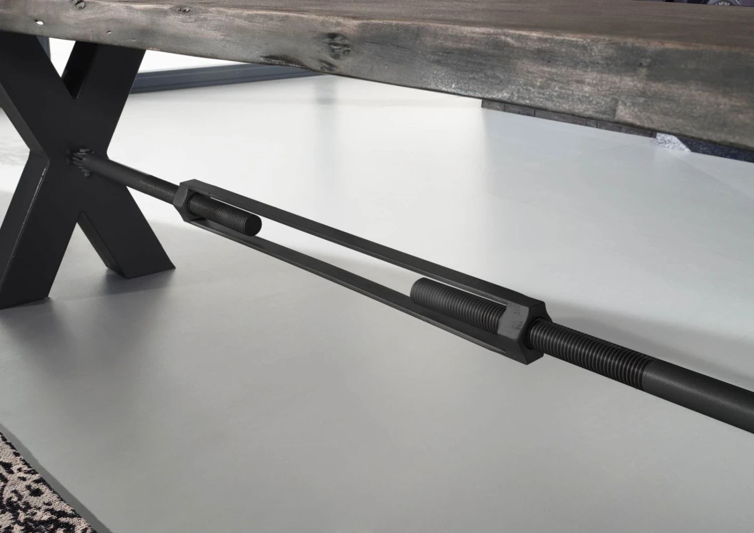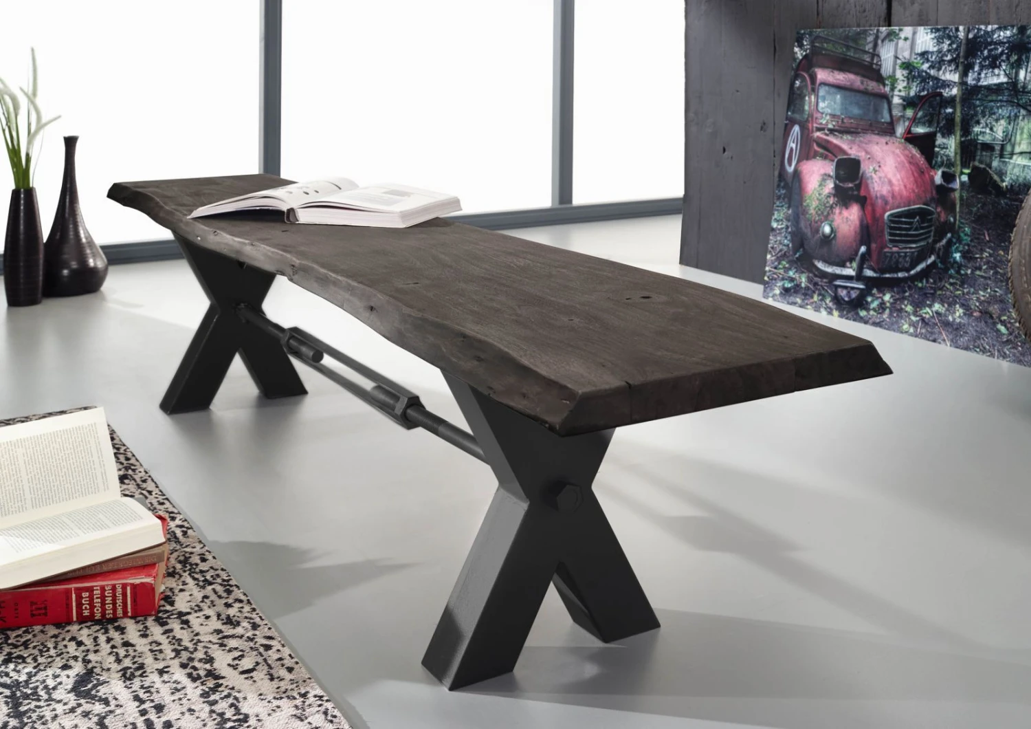 Splendida panca in legno massello di acacia color grigio laccato con effetto vissuto. Un arredo dal notevole impatto scenografico grazie alla combinazione tra robusto materiale naturale e solido metallo. La struttura portante consta in un telaio composto da due piloni di ferro a X con al centro unasta di supporto che fornisce compattezza e stabilità allinsieme. La seduta è ricavata da ununica trave di taglio irregolare che mette in risalto laspetto selvaggio e autentico del manufatto. La panca in legno massello di acacia è un riuscito mix tra antico e moderno, efficace sia da sola che come accessorio di un tavolo dello stesso stile.