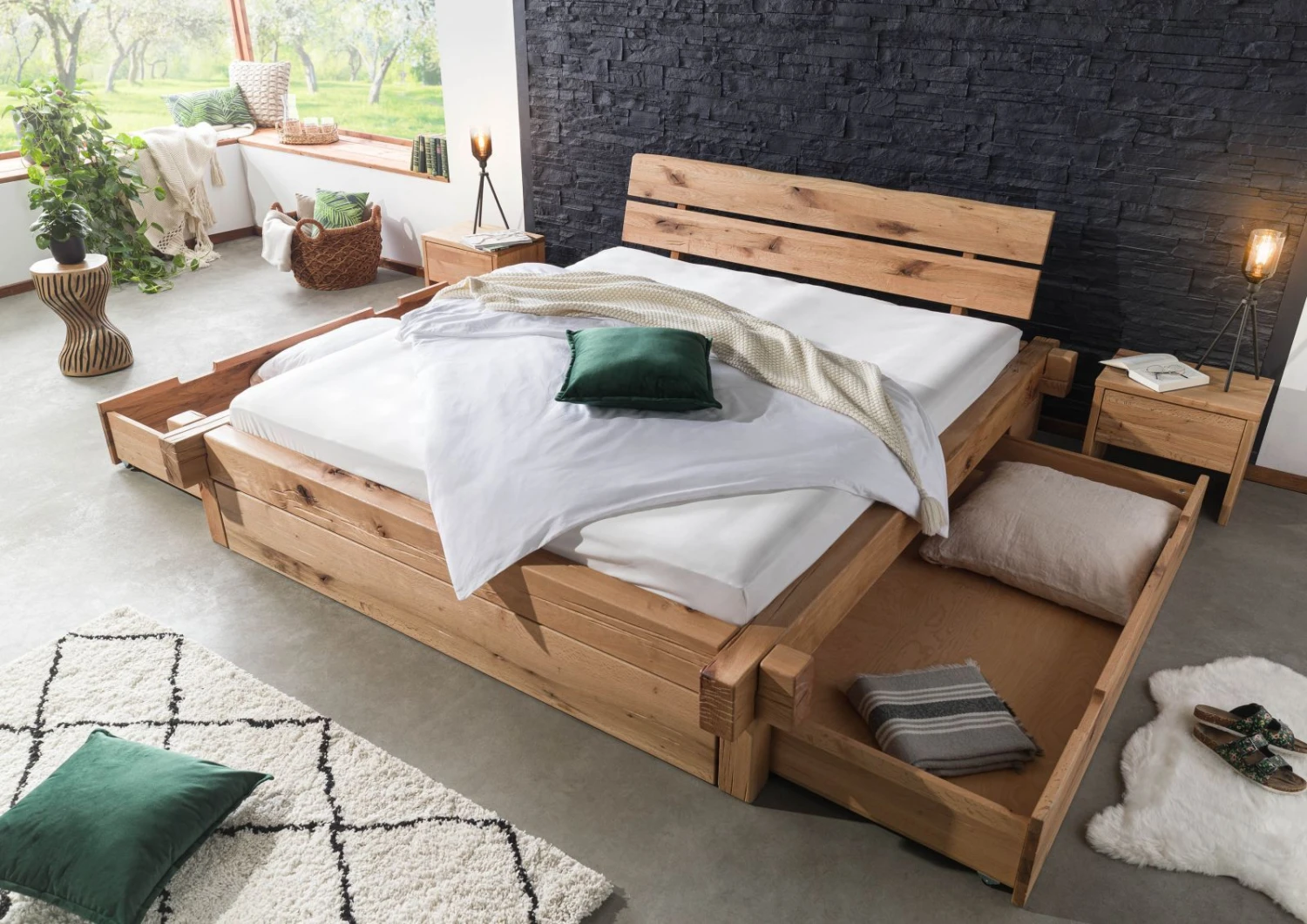del prodotto JANGALI #631 Letto matrimoniale a travi in legno di cerro – 2 cassetti – oliato / natur 200×200