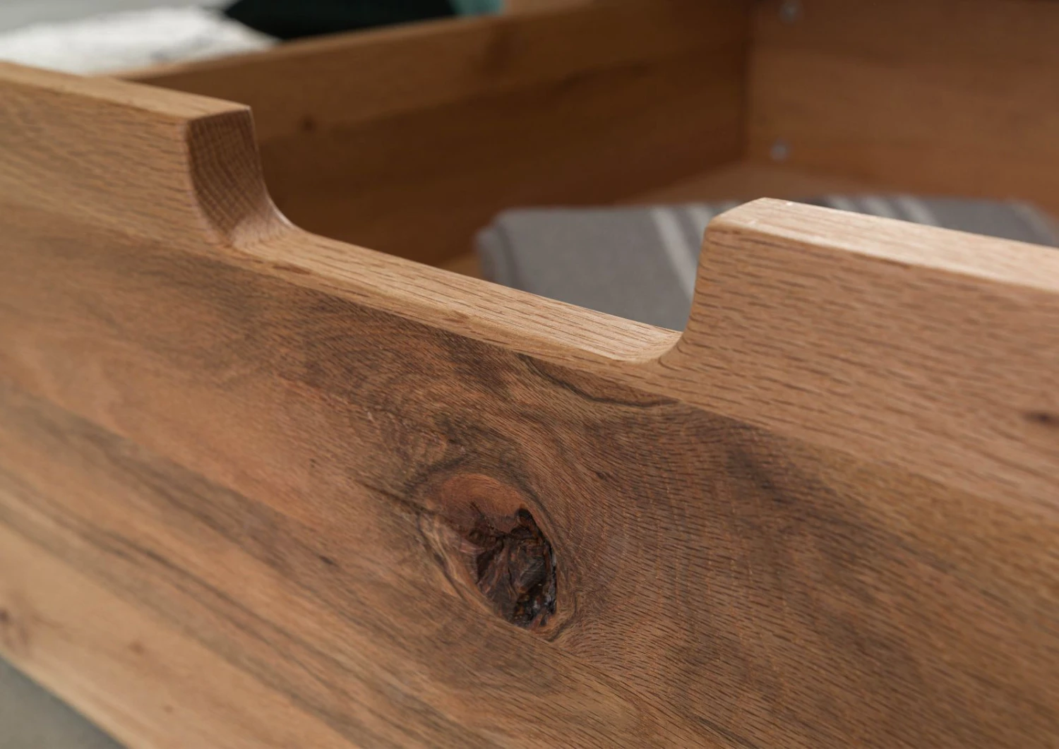 La base in legno massello colpisce per lo stile minimalista. Le giunzioni a vista non solo testimoniano maestria artigianale, ma conferiscono al rustico letto un’eccezionale stabilità. I due ampi cassetti offrono ulteriore spazio utile, celando sempre a portata di mano oggetti essenziali. Un solido pezzo di design per sognare e rilassarsi.