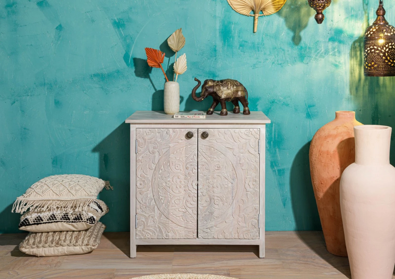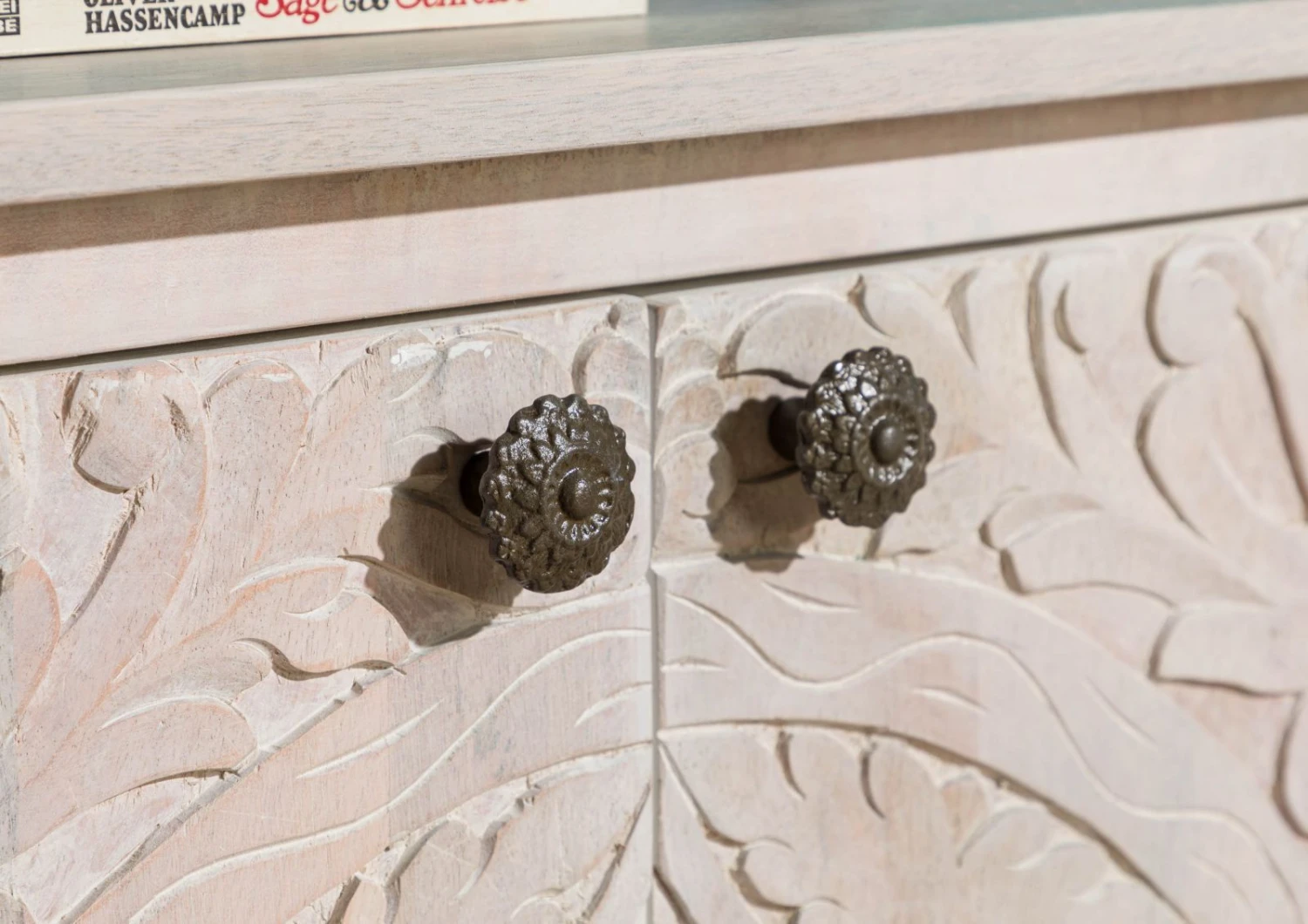 I raffinati intagli incontrano il legno massiccio: questo comò della serie KASHMIR mandala di ispirazione floreale. Due maniglie a forma di fiore, colpisce per i suoi frontali sorprendenti. Entrambe le porte hanno decorazioni che non solo sono accattivanti, ma possono anche essere sentite non appena si passano le dita sulla superficie. Il colpo d’occhio è la decorazione circolare, che ricorda lo stile mandala completando il mobile decorativo.