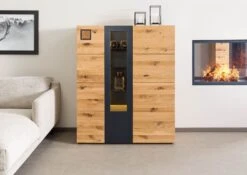 Il fascino naturale del legno massiccio crea un bellissimo contrasto con la sezione centrale laccata scura. La credenza combina la passione per la tecnologia con un design raffinato: quando si va per toccare l’elemento tattile al lato del mobile, la sezione centrale della vetrina con inserto in vetro colorato si illumina come per magia. La pratica funzione push-to-open agevola inoltre l’apertura e la chiusura con una semplice pressione sui frontali. Questa credenza è la dimostrazione di quanto il legno massello possa essere unico.