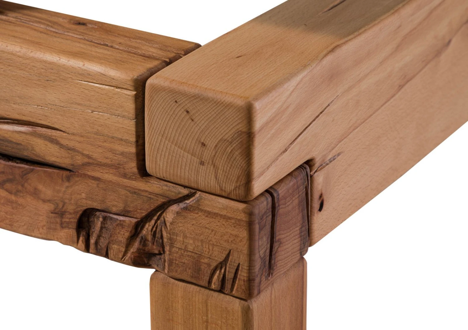 Letto matrimoniale in legno massello di quercia selvatica, geometria agile ed essenziale per un pezzo darredo che sembra quasi sospeso a mezzaria. Quattro stabili piedi a pianta quadrata forniscono sostegno alla robusta struttura e alla cornice fatta da un incastro di travi. Il risultato è unestetica minimale, rustica, molto efficace ed elegante. Funge da schienale da lettura la testiera sporgente composta da assi orizzontali parallele, sulla falsa riga delle spalliere delle panchine. Il colore naturale di questo letto matrimoniale in legno massello viene esaltato dal trattamento ad oliatura, lasciando intatte sfumature, crepe e tracce dei suggestivi raggi midollari tipici del durame più pregiato.