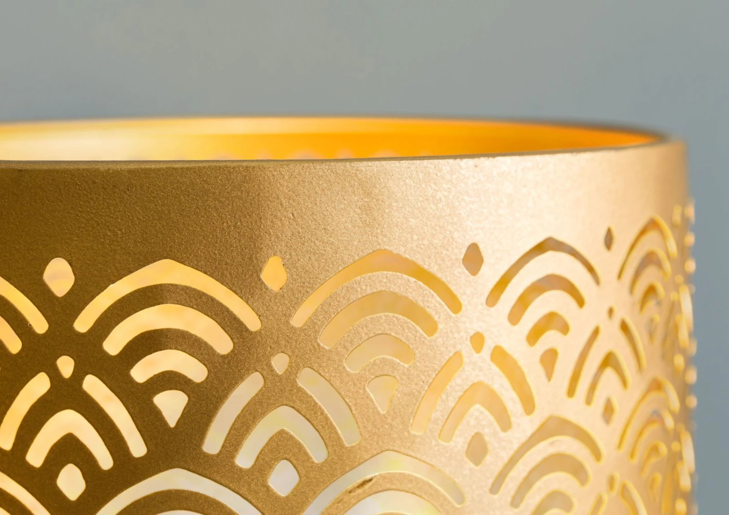 - muschelförmige Ausfräsungen im Lampenschirm sorgen für spannende Lichtreflexe an Decke und Wänden