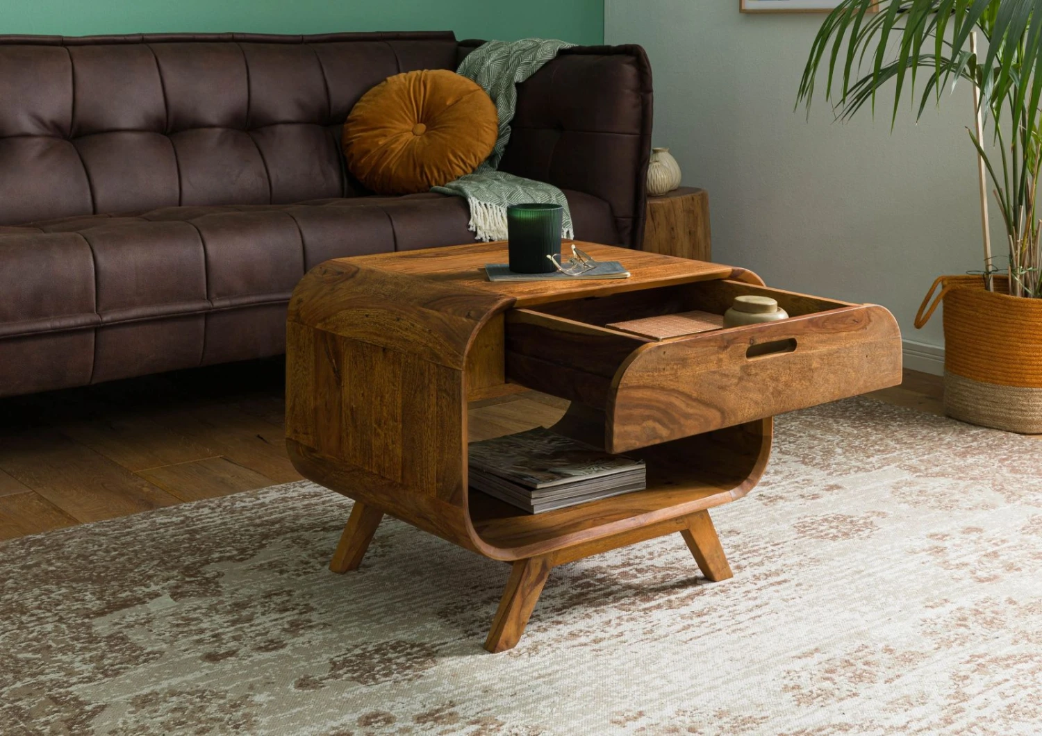 Questo piccolo e raffinato tavolino da soggiorno della collezione MAILAND è realizzato in legno massello di sheesham, noto anche come palissandro indiano. La trama del legno è esaltata da una finitura laccata marrone chiaro. Ma a catturare l’attenzione non è solo questo: gli angoli arrotondati e le gambe svasate ricordano lo stile spaziale degli Anni ’60.