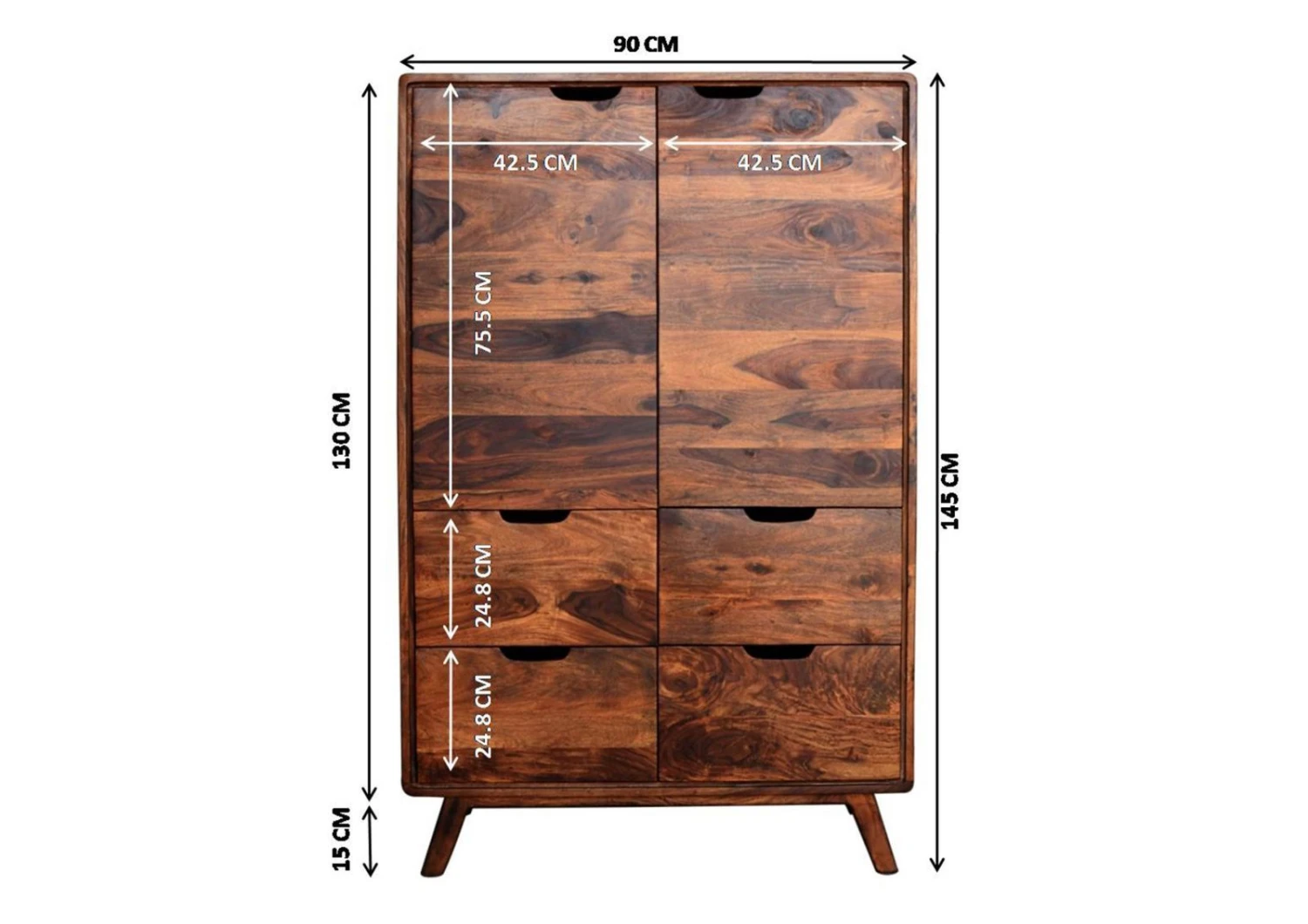 Comò in legno massello di palissandro (Sheesham) dalle sfumature cromatiche mosse in cui domina il color castano intenso verniciato ad effetto laccato. Nella parte superiore il mobile si presenta come una credenza con due ante che si aprono su quattro scomparti delimitati da un asse verticale e una mensola centrale. La sezione inferiore del comò in legno massello dispone di quattro cassettoni. Le maniglie sono ottenute tutte da sagomature del materiale con aperture a gola. La base dappoggio si regge grazie a quattro gambe a compasso, corte ma molto solide per garantire adeguata stabilità allintera struttura.