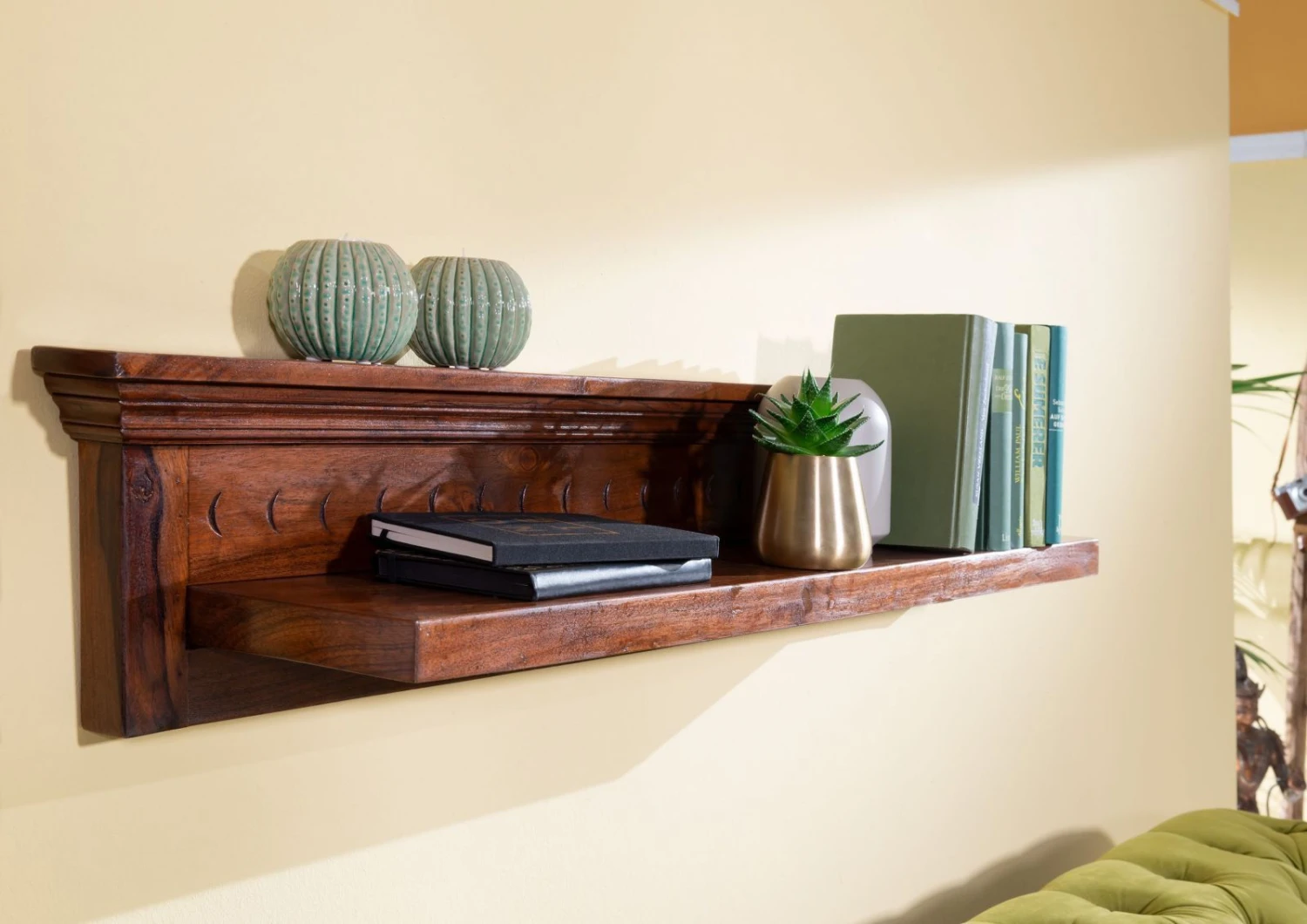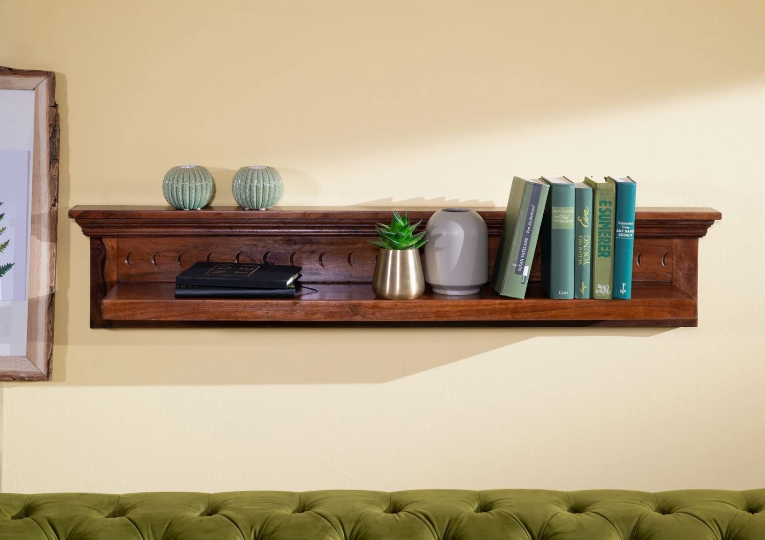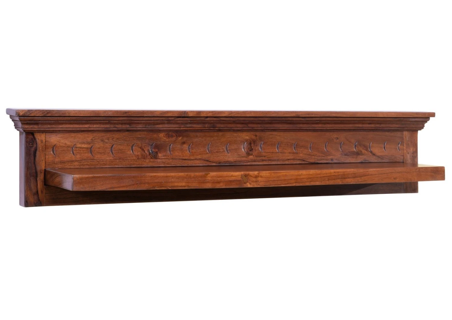 Elegante mensola a muro realizzata in legno massello di acacia disponibile in color castano antico laccato. La compattezza delle linee sottolinea il tipico stile coloniale, le sfumature vive mettono in risalto le naturali variazioni cromatiche del legno e le sue striature. Il complemento darredo è concepito per fornire due ripiani dappoggio, quello principale, spesso e solido, e quello superiore, che si estende per tutta la sua lunghezza con dettagli e rifiniture di pregio. Nella parte centrale della mensola a muro la superficie è arricchita da particolari intagli a mezzaluna leggermente irregolari tra loro, a testimoniare la lavorazione artigianale del manufatto.