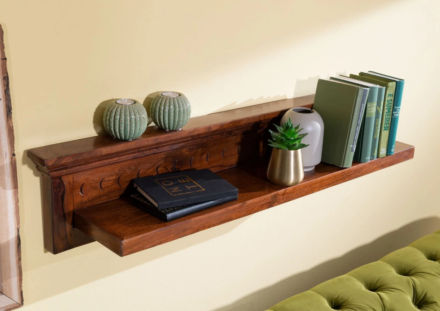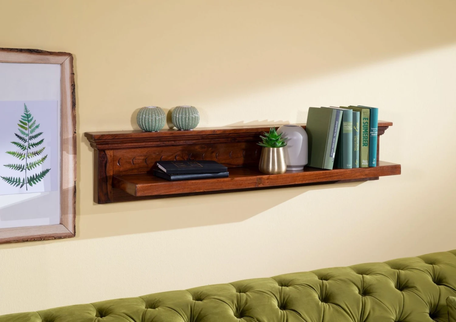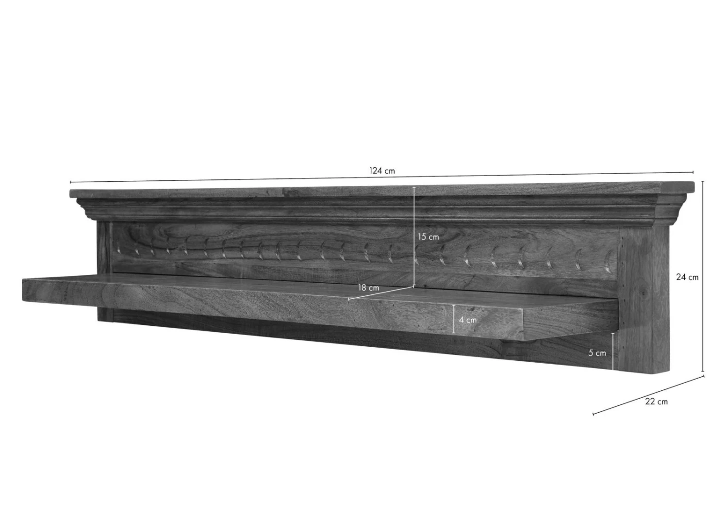 Elegante mensola a muro realizzata in legno massello di acacia disponibile in color castano antico laccato. La compattezza delle linee sottolinea il tipico stile coloniale, le sfumature vive mettono in risalto le naturali variazioni cromatiche del legno e le sue striature. Il complemento darredo è concepito per fornire due ripiani dappoggio, quello principale, spesso e solido, e quello superiore, che si estende per tutta la sua lunghezza con dettagli e rifiniture di pregio. Nella parte centrale della mensola a muro la superficie è arricchita da particolari intagli a mezzaluna leggermente irregolari tra loro, a testimoniare la lavorazione artigianale del manufatto.