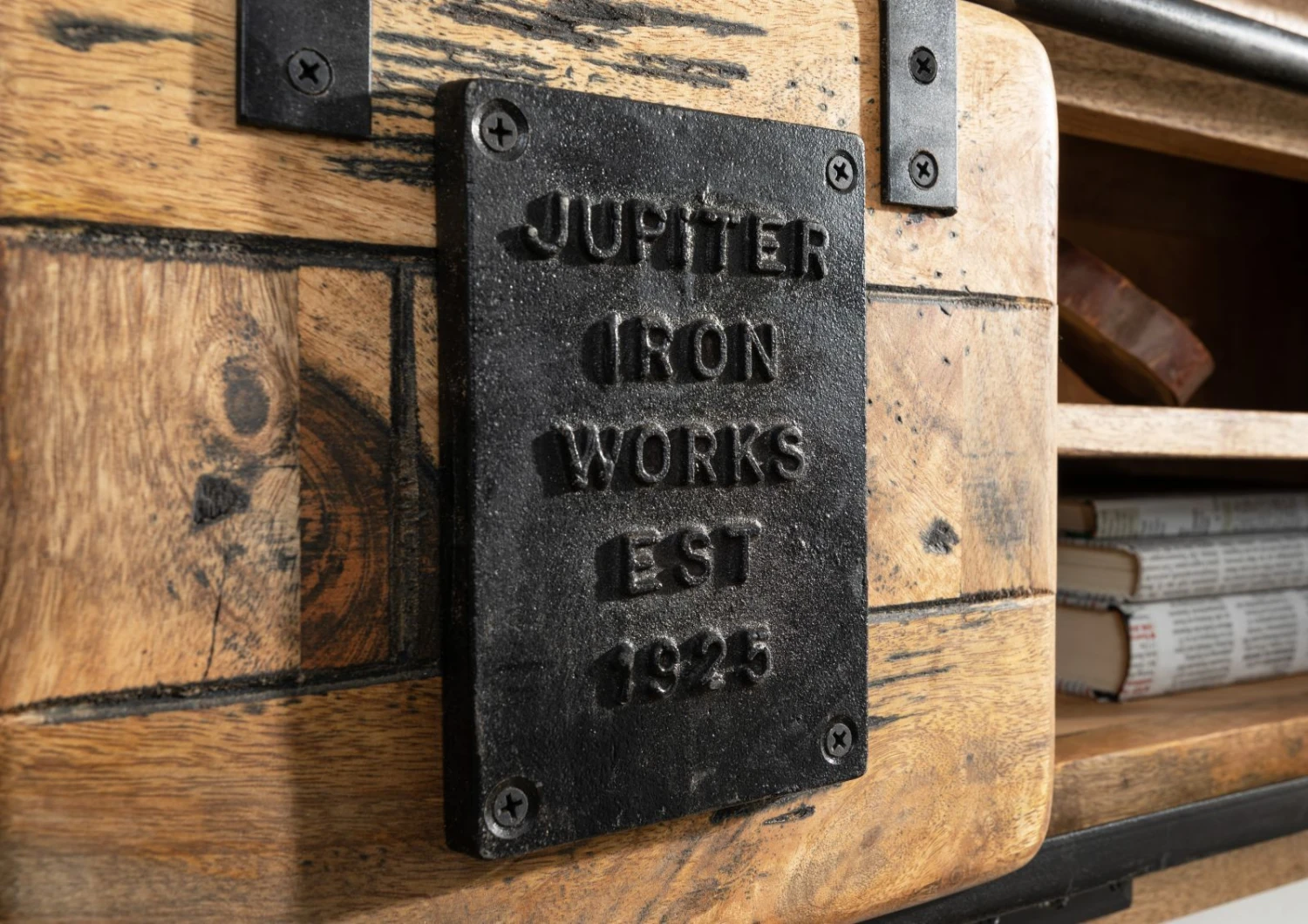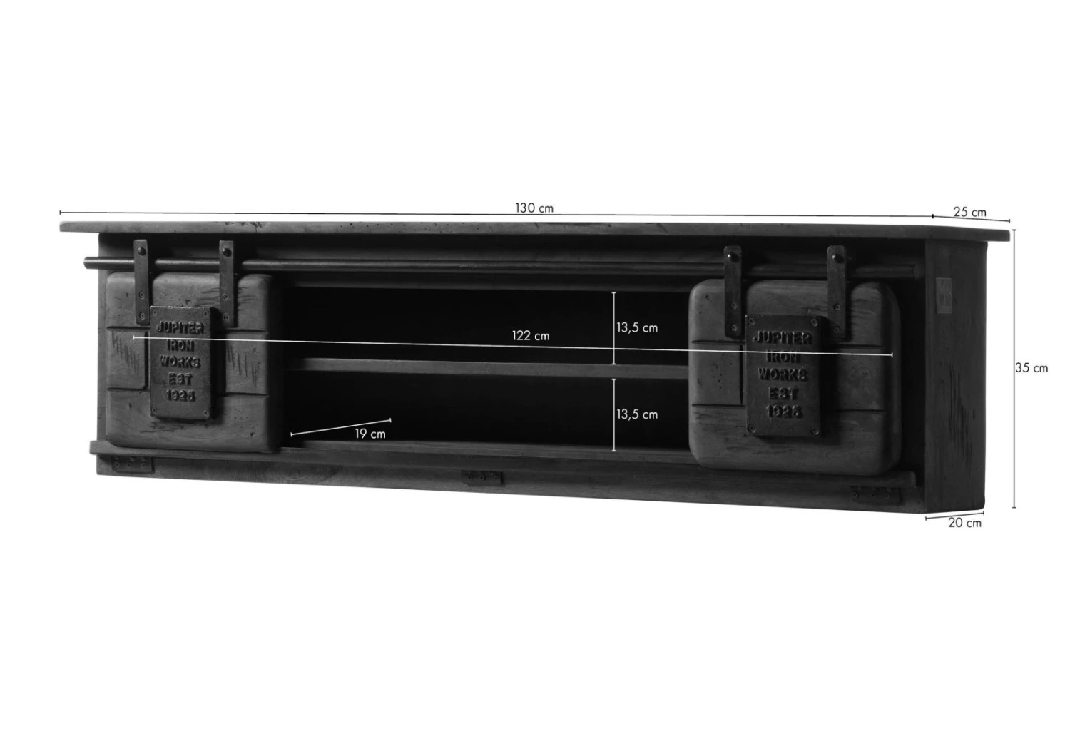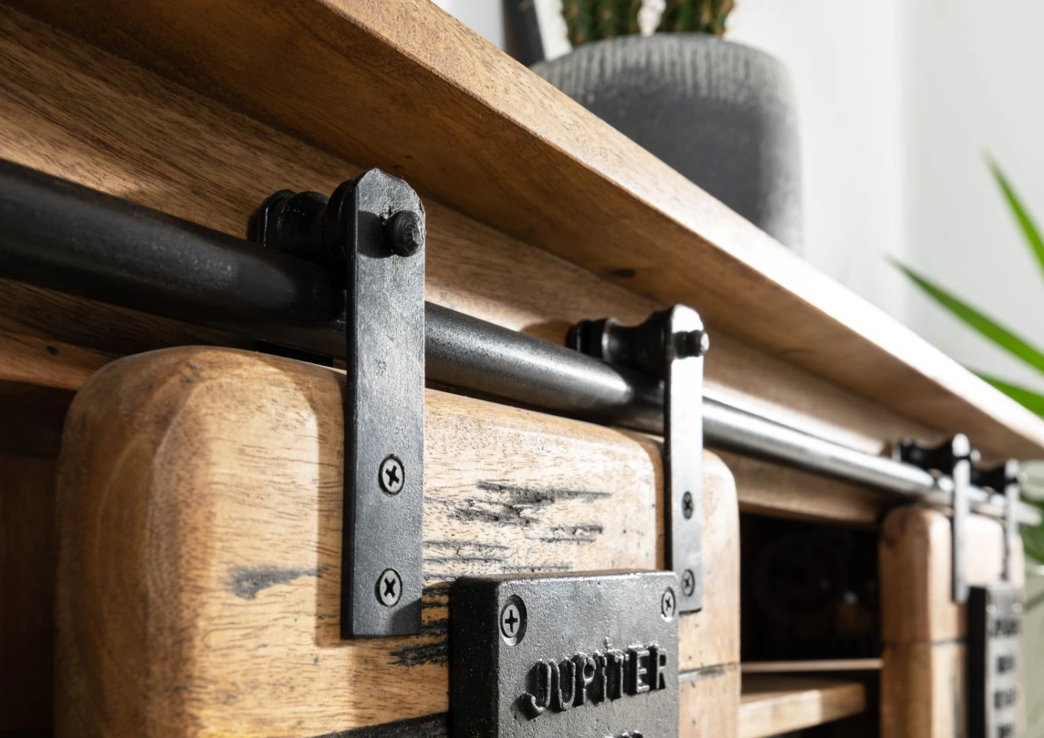 Mensola in legno massello di mango, evocativo stile coloniale misto a design spiccatamente industrial. Gli occhi scorrono immediatamente sulla superficie verniciata dal particolare effetto usurato. Il colore naturale del materiale esprime una bellezza unica, grazie alle sue autentiche nuance marrone, miele e nocciola. Le superfici dappoggio e di contenimento sono costituite da un ripiano/cappelliera e da due vani aperti divisi da unasse centrale. Anche questo prodotto della collezione Railway presenta gli immancabili inserti frontali con pannelli/sportelli che scorrono su binari in ferro battuto. Particolarmente efficace nellingresso, la mensola in legno massello funziona benissimo anche se collocata in soggiorno o in camera da letto.