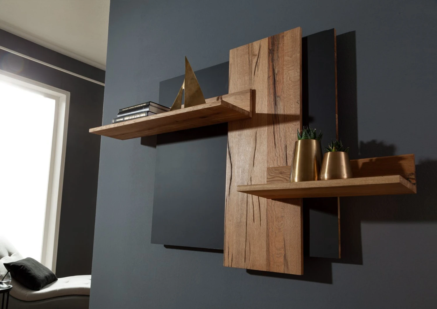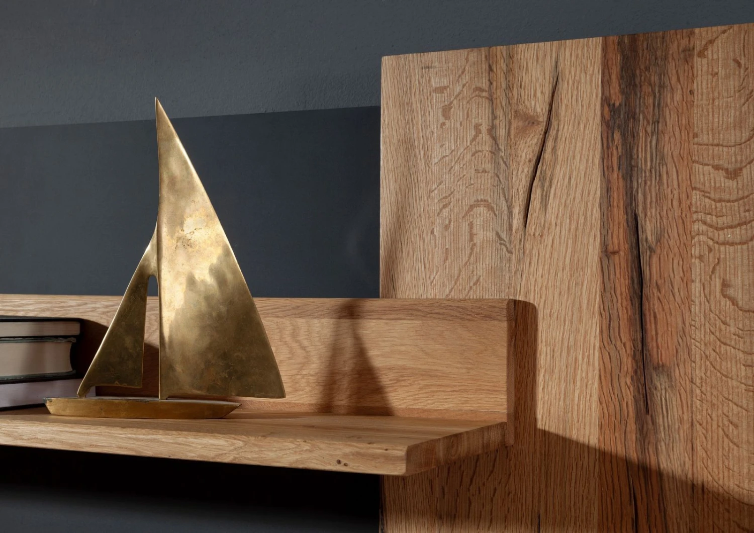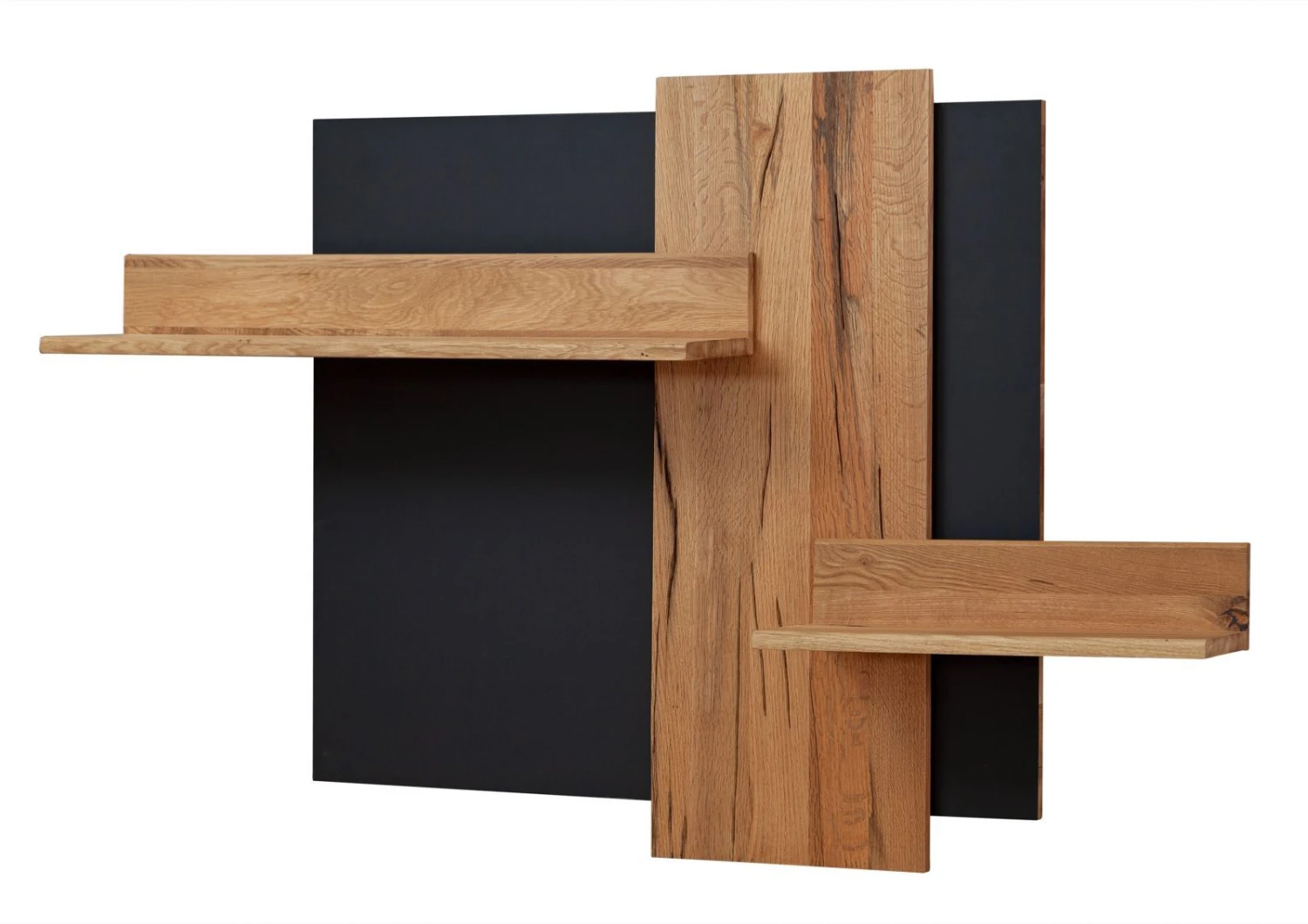 Elegante ed elaborata mensola in legno massello di cerro di colore autentico che dona un suggestivo movimento cromatico tra marrone, miele e nocciola. Caratteristiche crepe, venature e imperfezioni che testimoniano la genuinità del materiale naturale. Questo componente di interiore si presenta con una sovrapposizione di due pannelli da parete, uno principale, ricoperto da uno strato satinato grigio antigraffio, e laltro, lasciato in purezza. A questultimo sono attaccati i due ripiani dappoggio su diversi livelli, con piccole spalliere autoportanti. La mensola in legno massello, in chiara architettura moderna, mostra come forme minimali riescono ugualmente a dare un risultato molto scenografico.