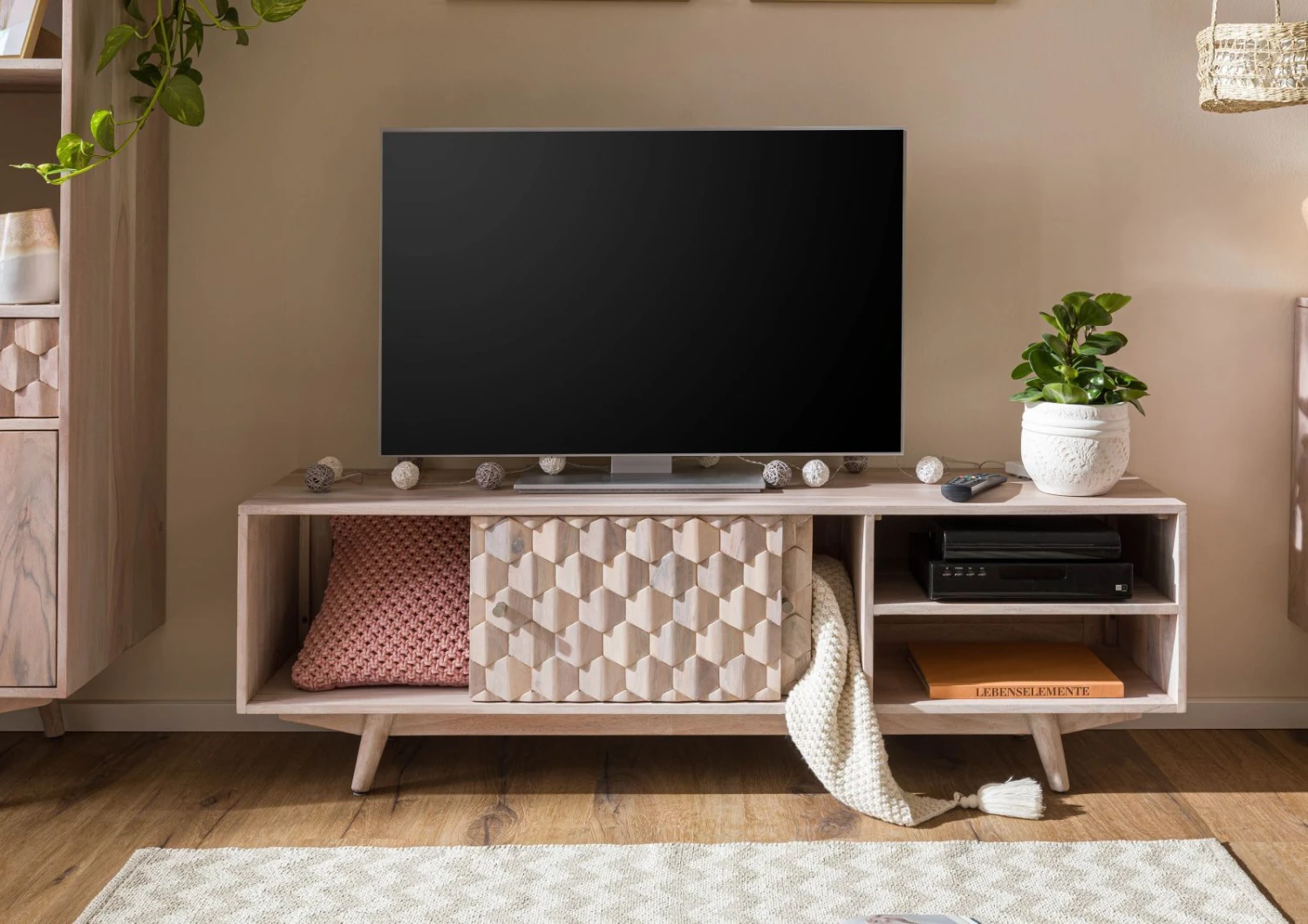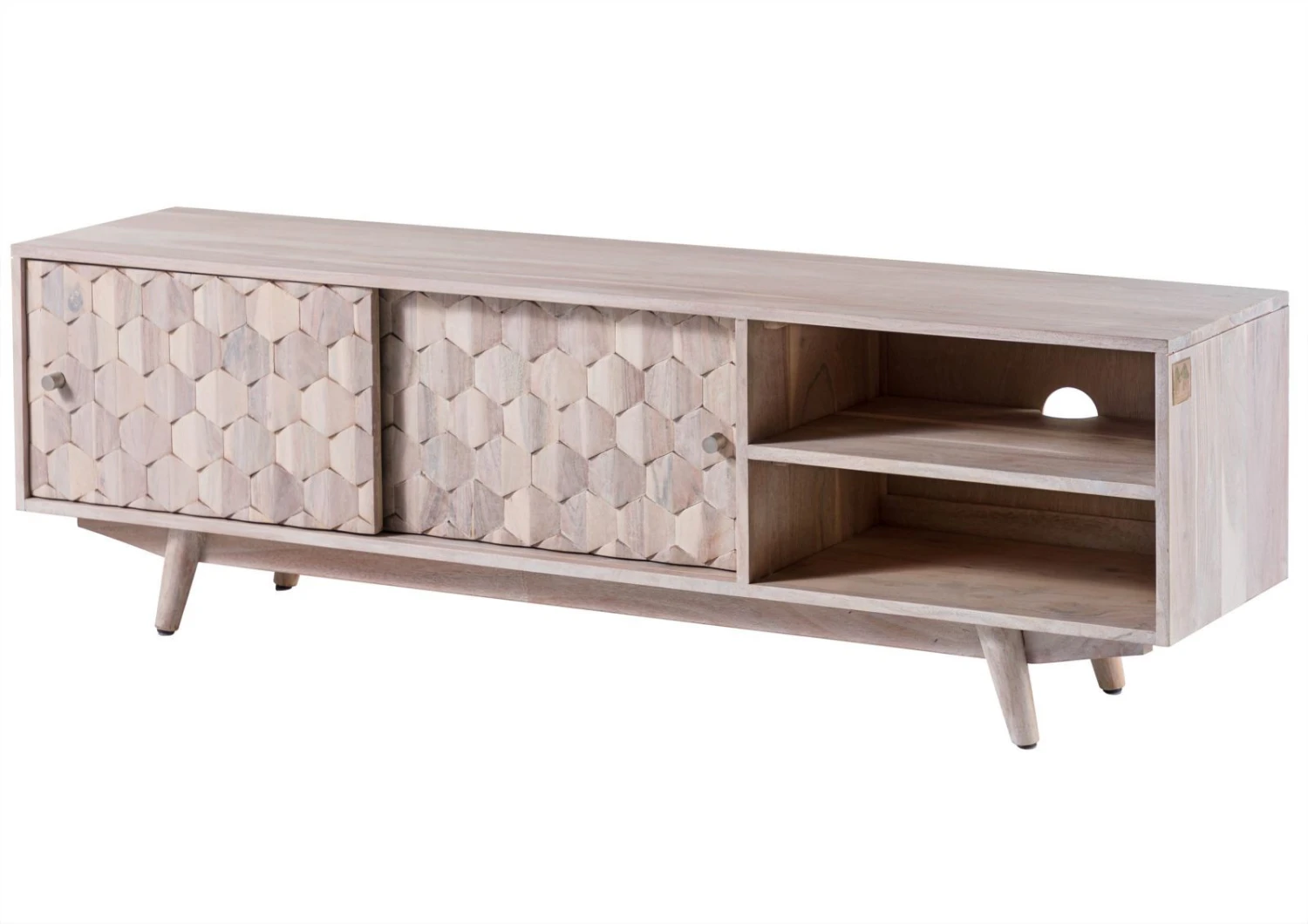 Mobile tv in legno massello di acacia, trattamento verniciato della superficie, colore bianco che si esprime in un mix di nuance noce, nocciola e miele. La base è composta da gambe a compasso, corte ma estremamente solide, mentre il corpo del mobile è suddiviso in due sezioni. Sulla destra sono presenti due scoparti a vano aperto ricavati da un ripiano centrale. Lo spazio è ottimo per collocare console e altri dispositivi elettronici. Sulla sinistra il grande vano principale di contenimento è racchiuso dietro a due sportelli scorrevoli con maniglie in metallo satinato. Uno dei dettagli sicuramente più rilevanti di questo mobile tv in legno massello sono le decorazioni presenti sulla facciata degli sportelli. Il suggestivo effetto tridimensionale è frutto di una pregevole lavorazione artigianale che è riuscita a liberare l’anima vintage di questo stupendo componente di interior.