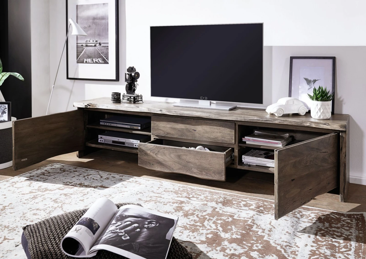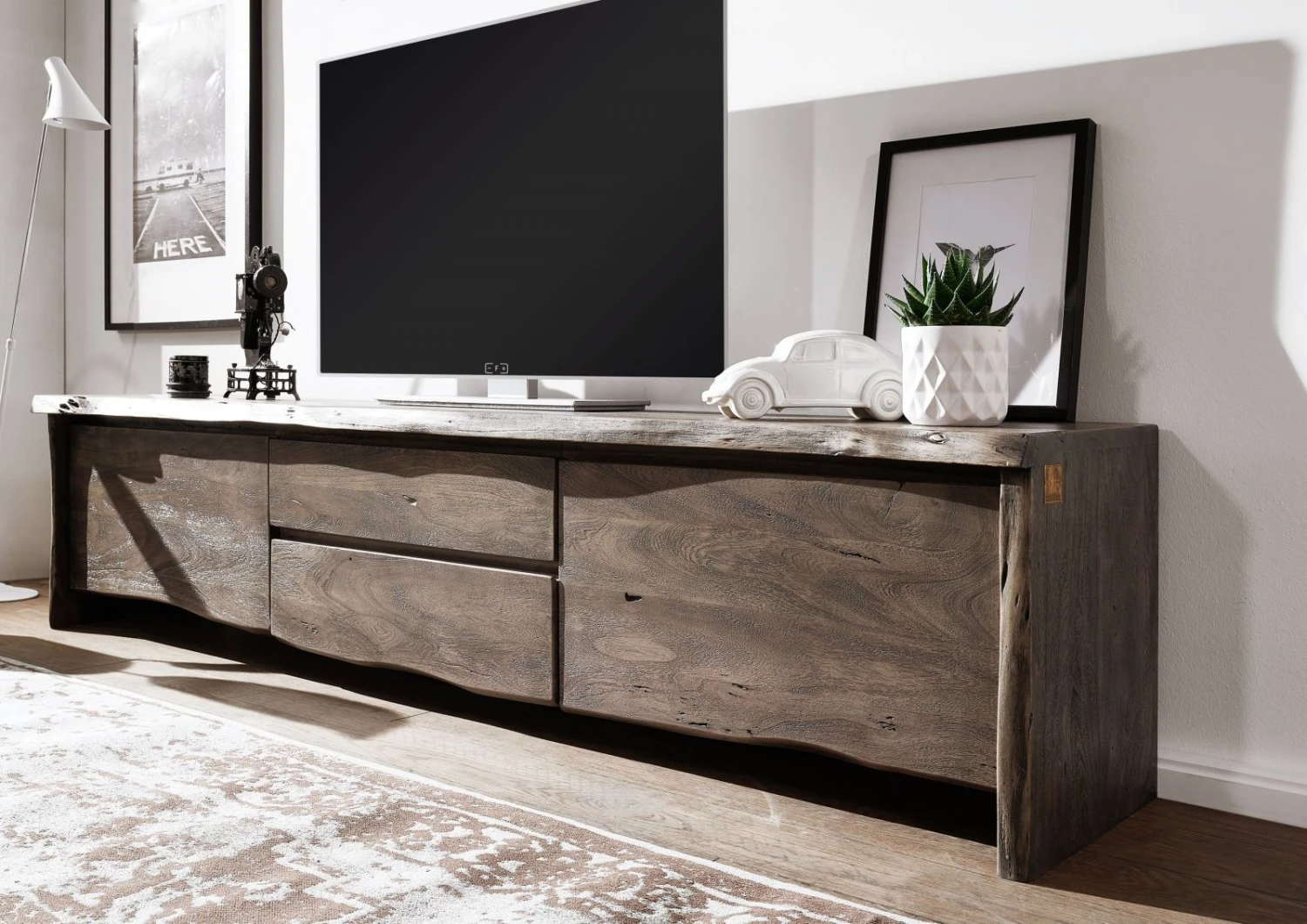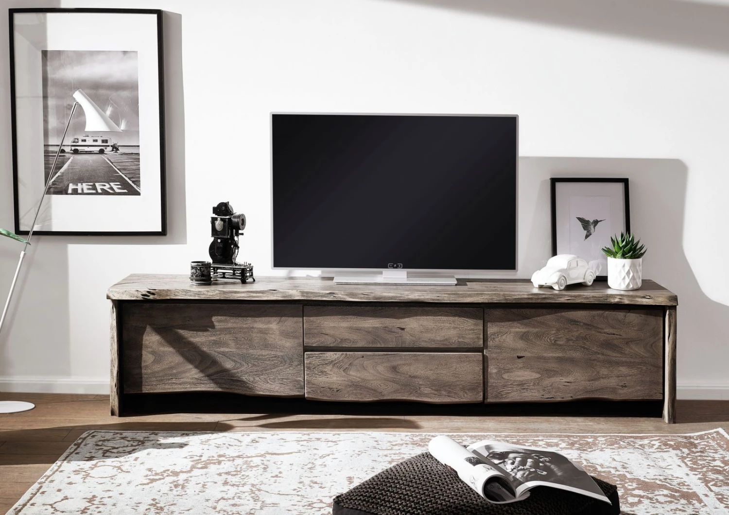 Per molti, il mobile del televisore è il cuore del soggiorno. Questo modello in legno di acacia è un vero e proprio capolavoro: a catturare l’attenzione sono le venature uniche del legno massiccio, ulteriormente valorizzate dal design senza maniglie sui frontali. La naturalezza del materiale è enfatizzata dal bordo irregolare, particolarmente evidente sul lato inferiore del mobile, che riproduce fedelmente la forma naturale dell’albero.