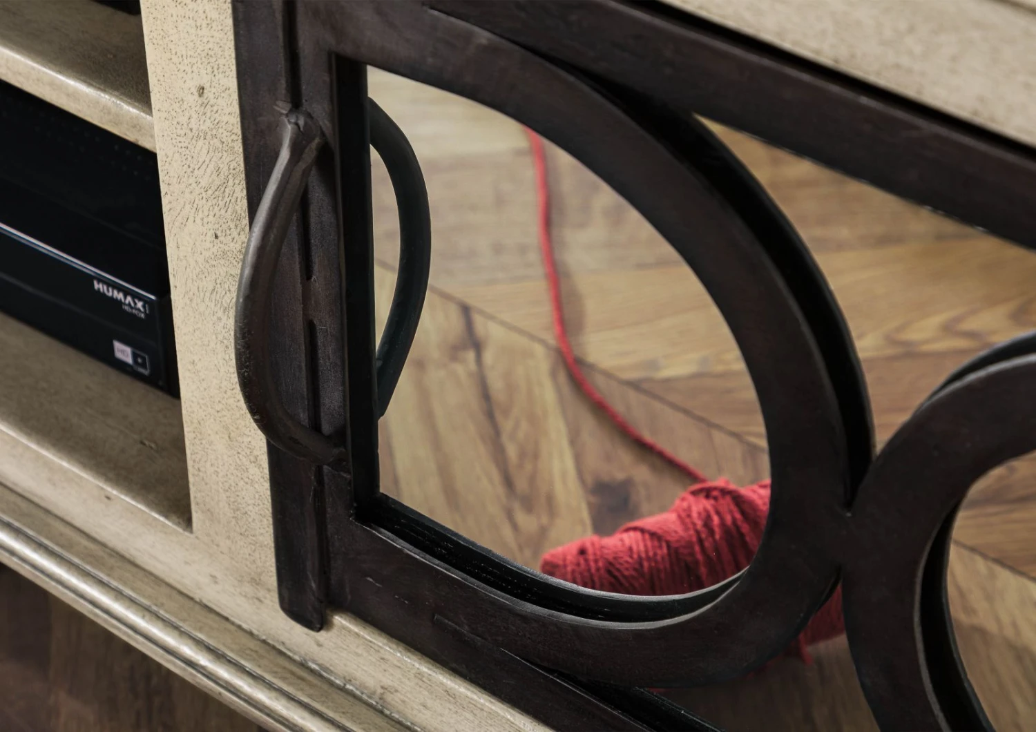 Le due ante frontali a specchio presentano una gradevole decorazione in metallo. Il contrasto tra le superfici in vetro e il metallo scuro, così come le linee curve, sono ispirate all’art déco. La chiusura delle ante è affidata a pratici fermi magnetici. Due scaffali aperti offrono spazio per ricevitori e altri dispositivi di connessione facilmente collegabili al televisore tramite il passacavo.
