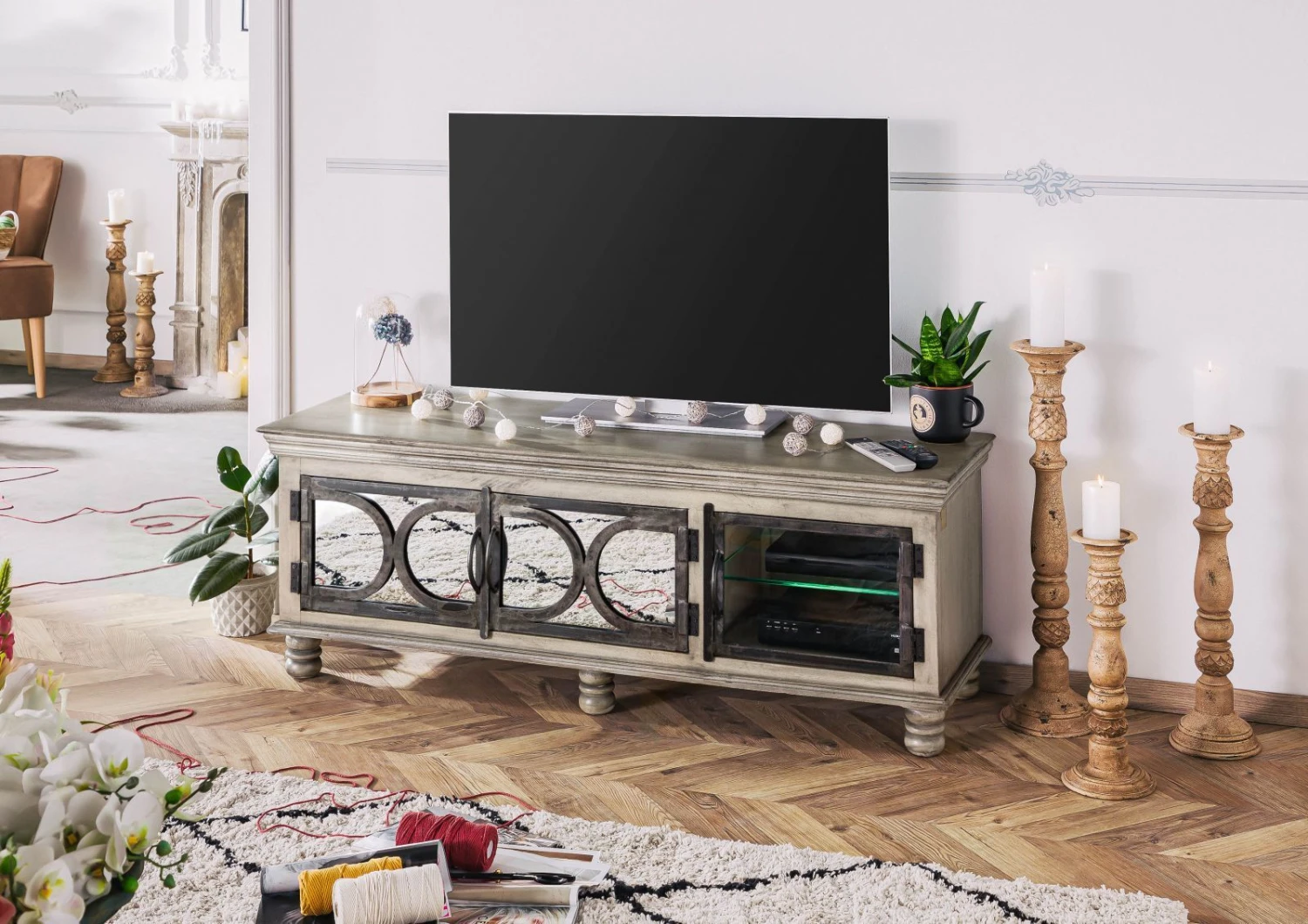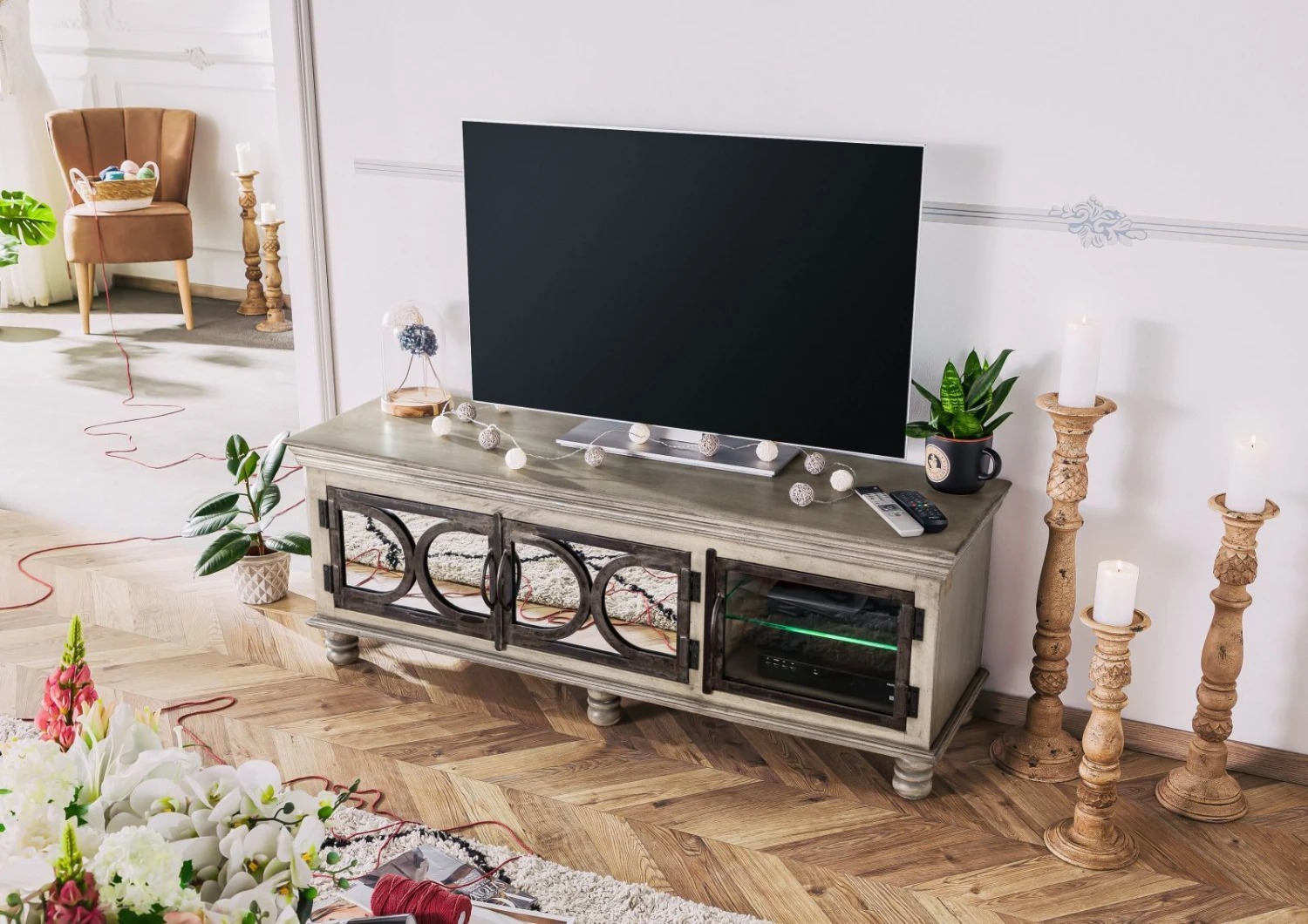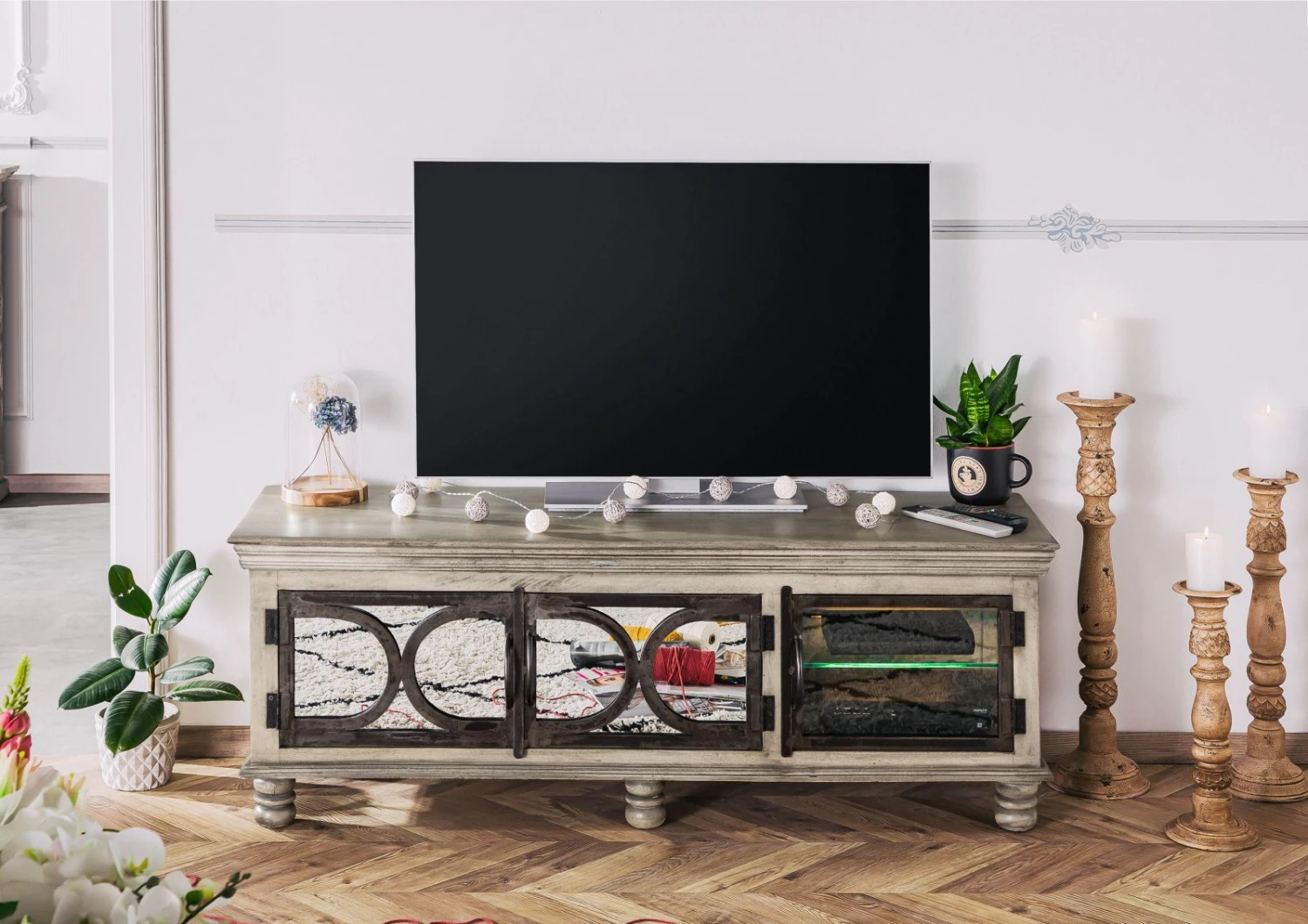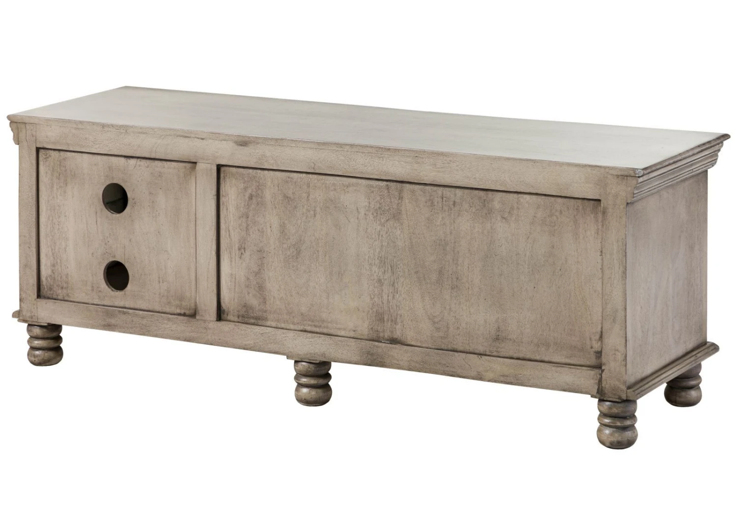 Una gradevole cornice decorativa borda il corpo del mobile nella parte superiore e direttamente sopra i piedini, la cui forma sferica solcata da sezioni fresate aggiunge un accento di carattere. Realizzato in legno massello, il mobile convince anche in termini di funzionalità: l’anta in vetro cela due scaffali su cui è possibile appoggiare dispositivi collegabili in maniera semplice e rapida al televisore per mezzo dell’apposito passacavo sul pannello posteriore.