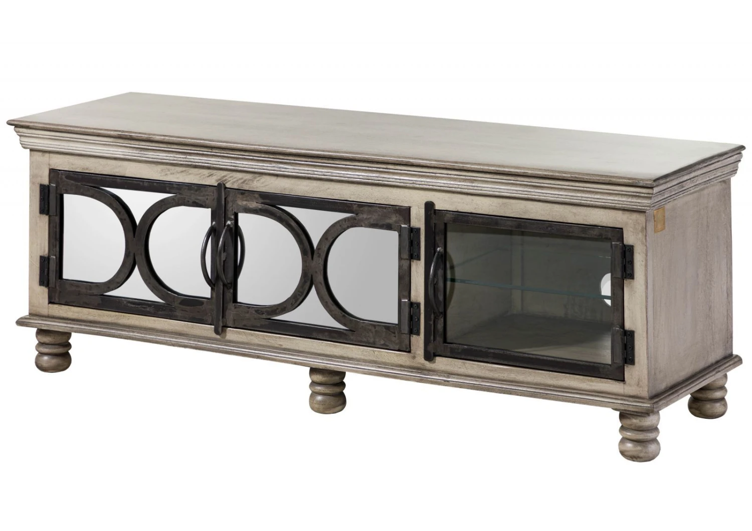 Autentico fulcro estetico del salotto, questo mobile TV della collezione HERMITAGE è realizzato in legno massello di mango e vetro (specchiato). Attenzione particolare meritano i frontali, ornati con finitura in ferro scuro che rievoca lo stile vintage dell’art déco. A colpire sono tuttavia anche gli elementi di design ispirati alle atmosfere country.