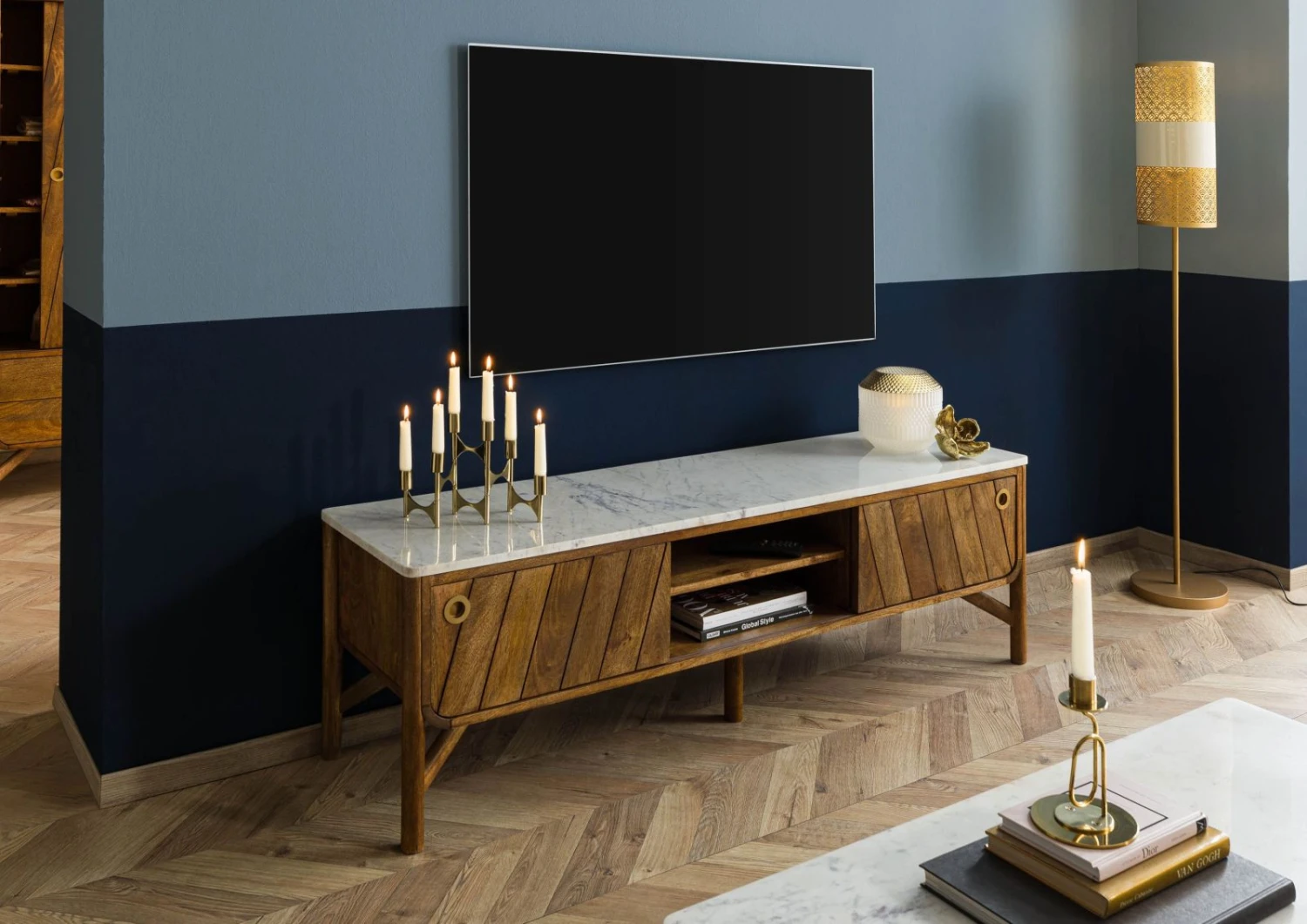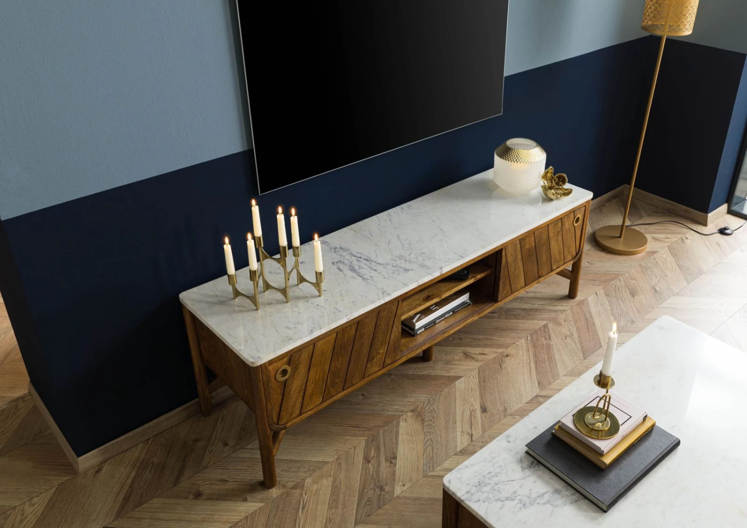 - TV-Lowboard mit Marmor-Platte: Schmuckstück aus braun geöltem Mango-Holz