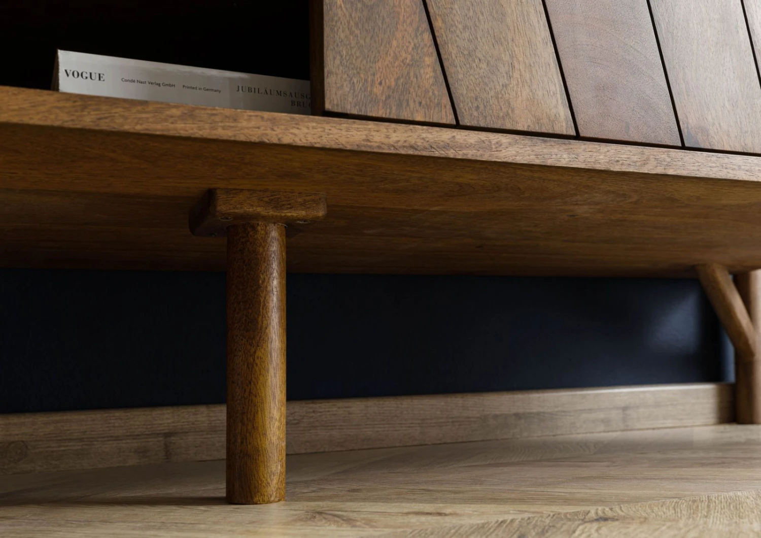 Dieses TV-Board der Serie LOS ANGELES aus massivem Mangoholz versteht sich darauf, dezente Eleganz ins Wohnzimmer zu transportieren. Das gradlinige Design auf zierlichen Standbeinen bringt dezente Retro-Vibes à la Hollywood mit. Der Mix aus den hochwertigen Naturmaterialien Massivholz und Marmor unterstreicht den luxuriösen Look, während teils gerundete Ecken das Erscheinungsbild weichzeichnen.