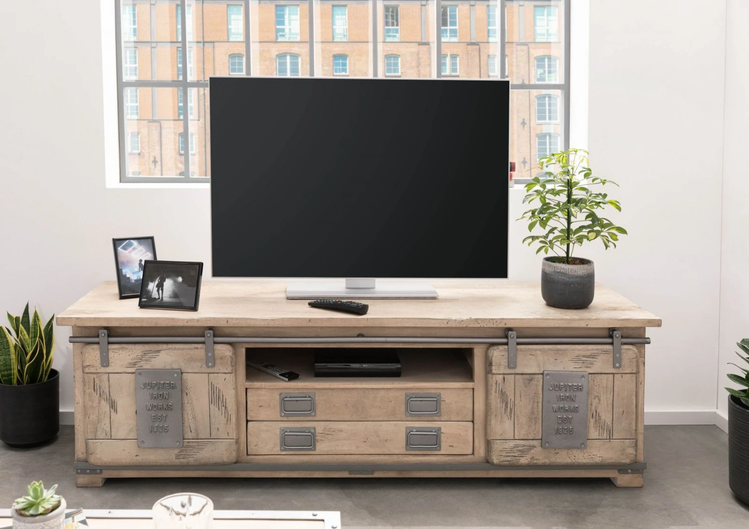 Mobile tv in legno massello di mango con due coppie di vani di contenimento aperti, nascosti dietro i tipici pannelli scorrevoli della collezione Railway. Al centro, nella parte superiore, è visibile lo scomparto per consolle. Sotto di esso sono stati ricavati due larghi cassetti con maniglie in ferro grigio chiaro. Al colore originale dominante è applicato un trattamento di velatura in color bianco che si mescola alle sfumature e alle tracce dei raggi lamellari, donando a questo componente darredo un aspetto piacevolmente rustico e vintage. La combinazione di materiale naturale e metallo è una riuscita versione contemporanea dello stile industriale. Nellinsieme il mobile tv in legno massello sprigiona un fascino caldo e si distingue per unestetica davvero efficace.