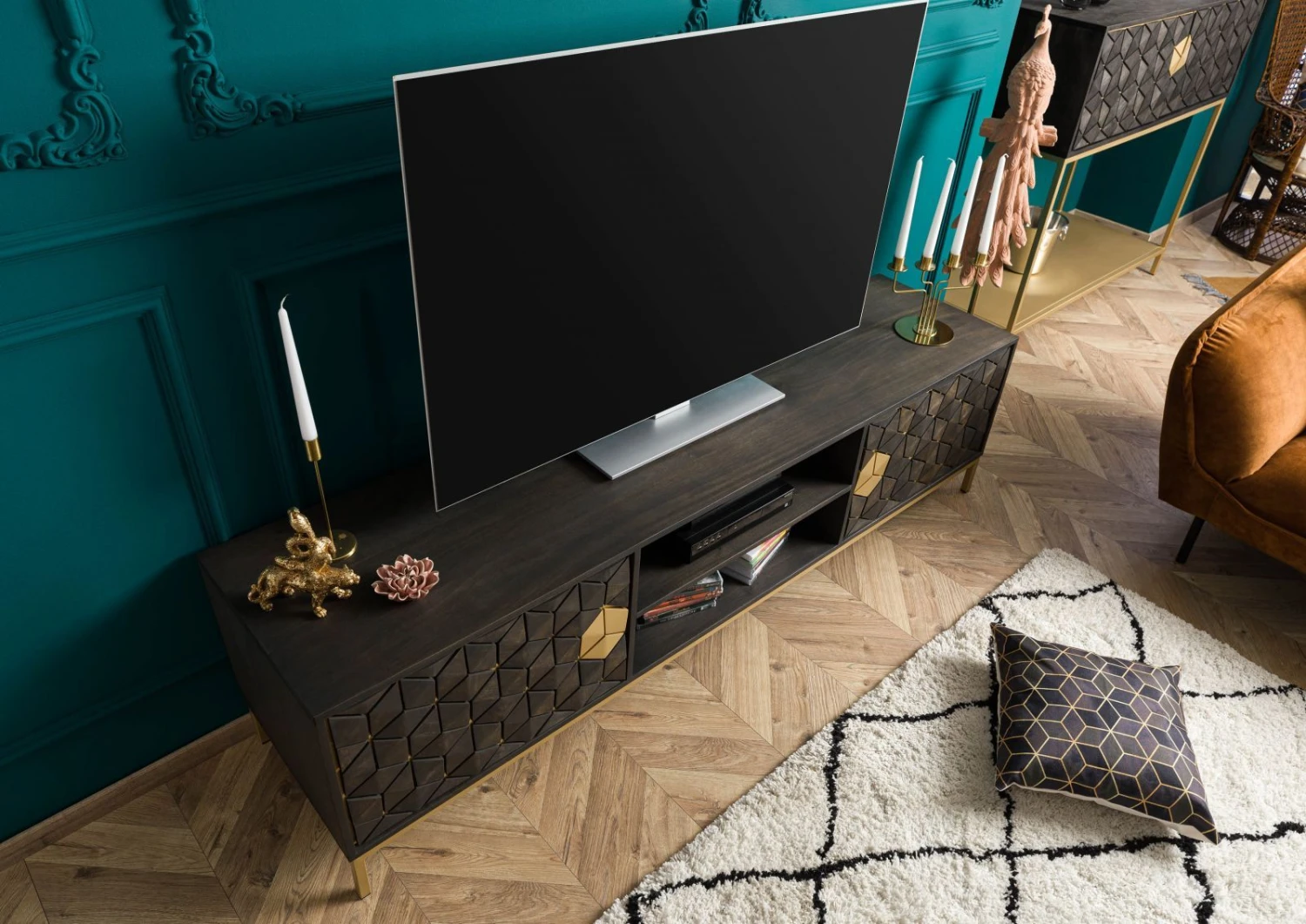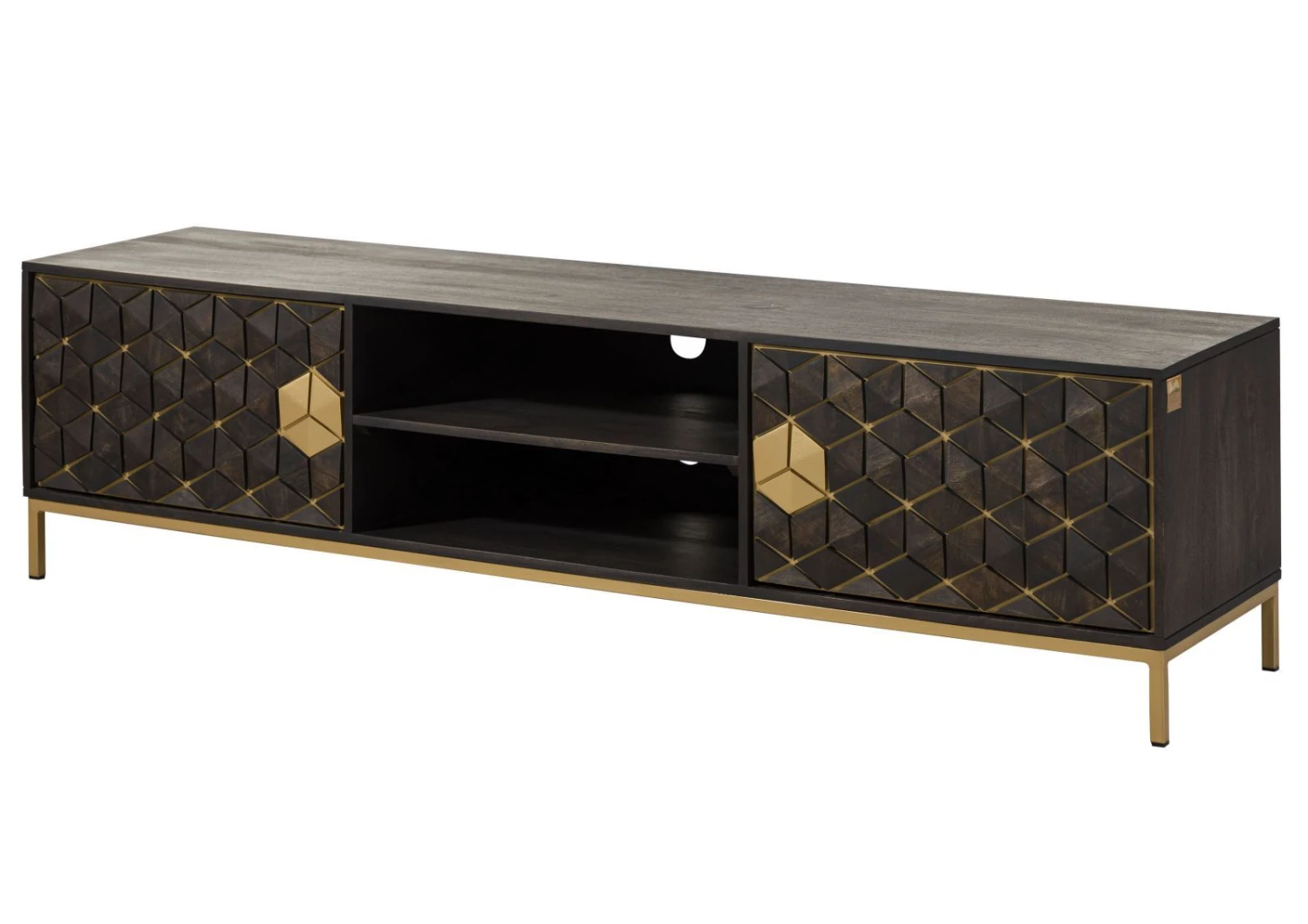 Tuttavia non colpisce solo l’aspetto esteriore di questo modello. Questo mobile in legno massiccio e metallo sorprende anche in termini di funzionalità e qualità. Le porte non hanno maniglie e possono essere aperte con la funzione Push To Open. Nei due vani aperti c’è spazio per telecomandi e altri oggetti. Grazie a due pratiche aperture nel pannello posteriore, i cavi possono essere facilmente collegati al televisore, che può essere comodamente posizionato sull’ampio piano superiore.