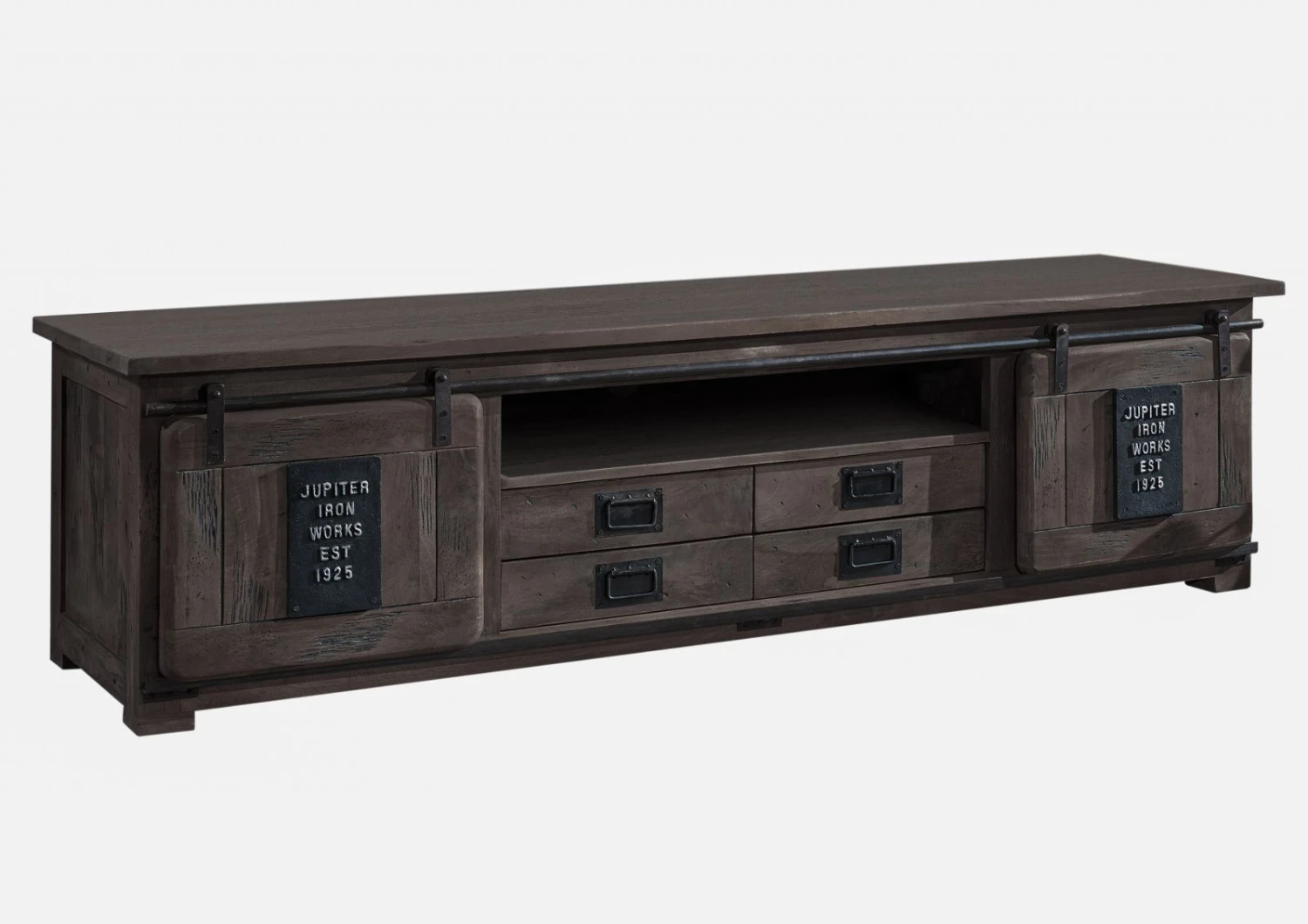 - Mobile TV in stile industriale con ante scorrevoli, scomparti e cassetti