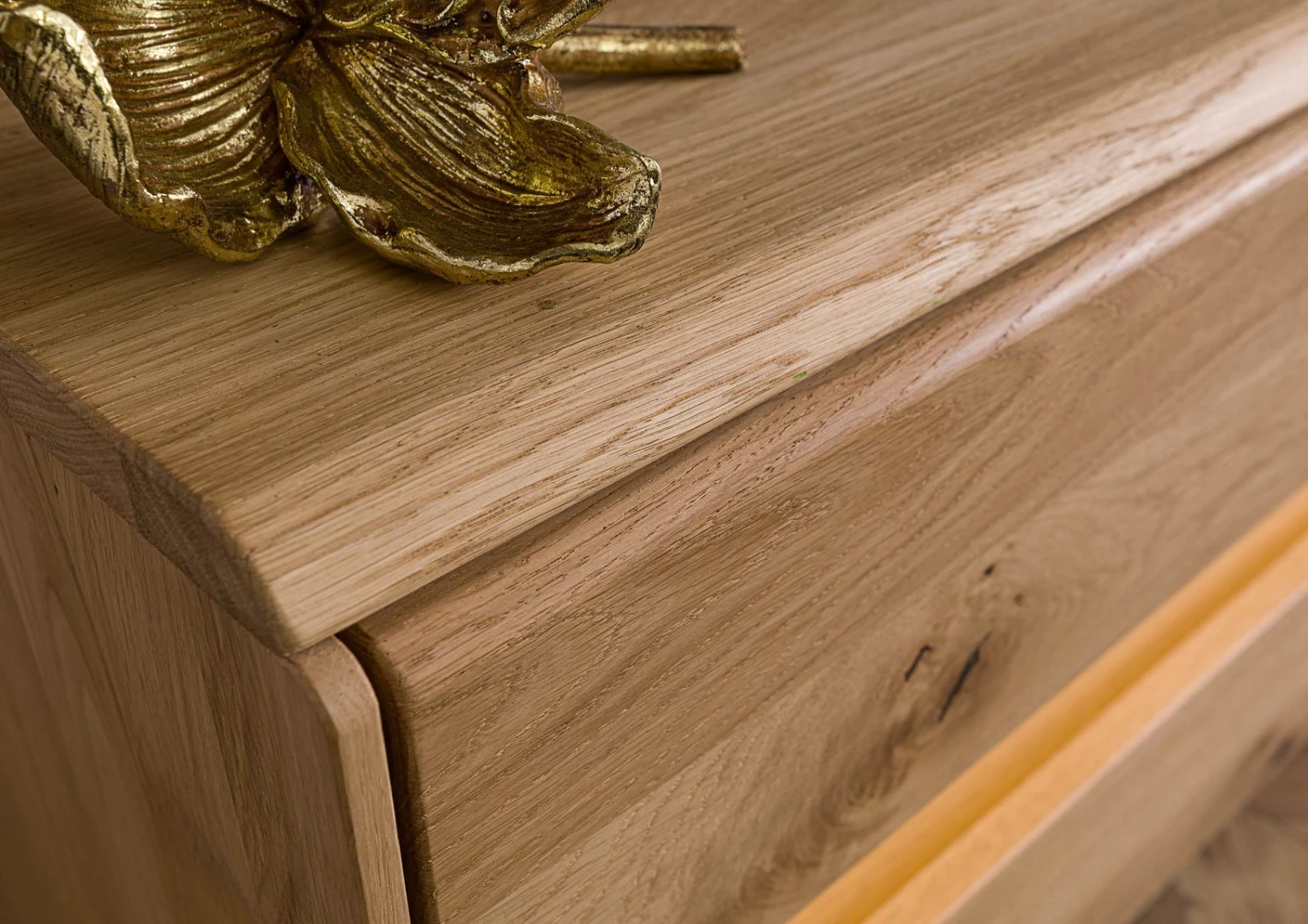 Piccoli dettagli rendono questo mobile TV un pezzo di design di grande spessore. Il pannello illuminato dietro le impugnature incassate è realizzato in legno di quercia spazzolato. Le ante, invece, sono dotate di tecnologia Soft Close. Ciò significa che si chiudono in modo silenzioso e delicato. Il piano superiore smussato completa il look chic di questo mobile TV in legno naturale.