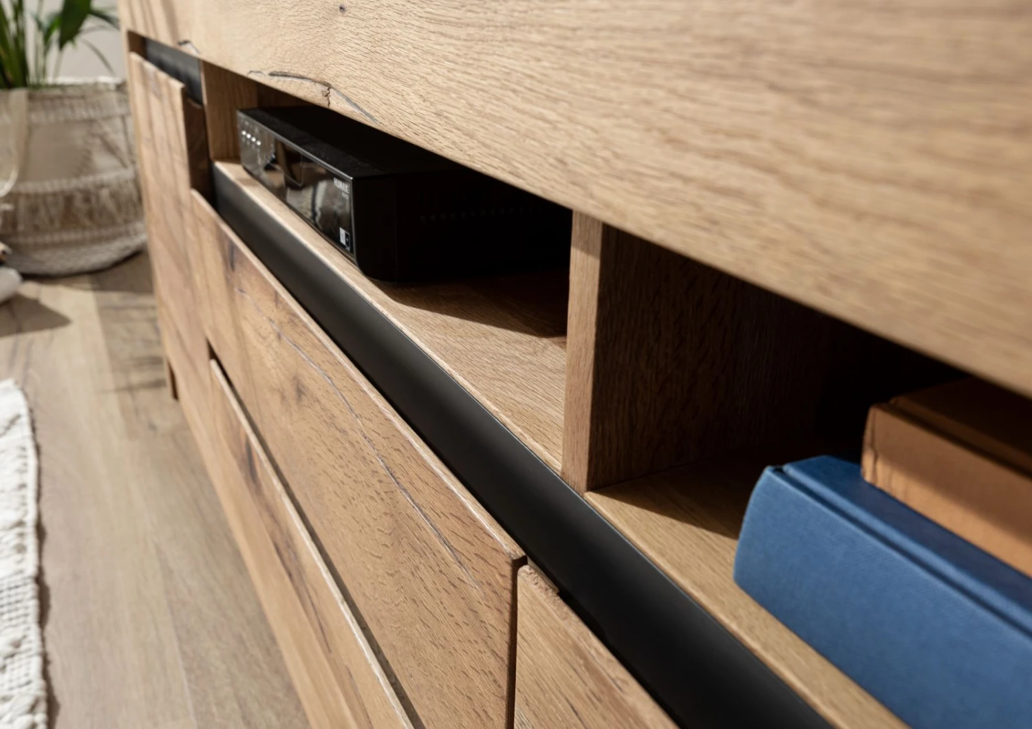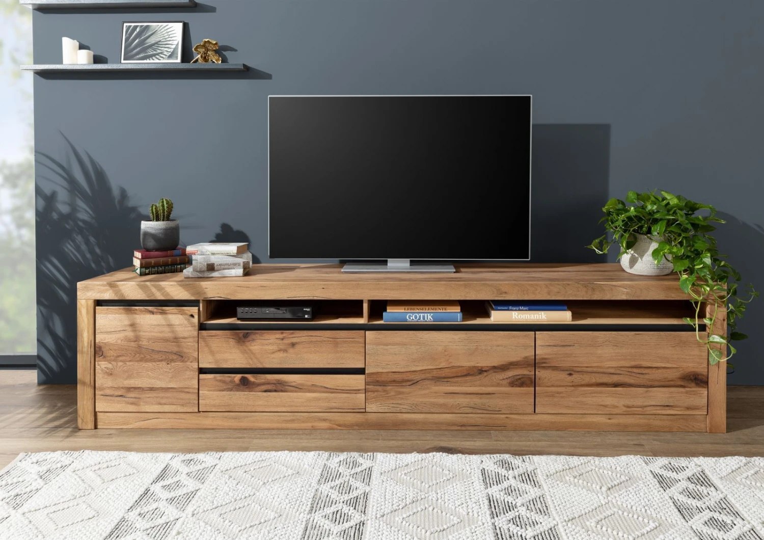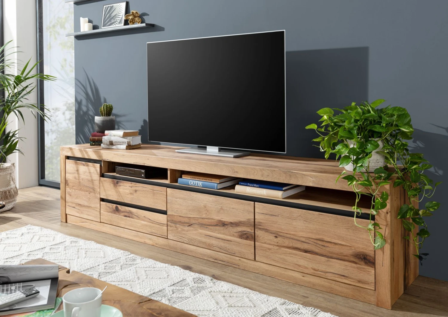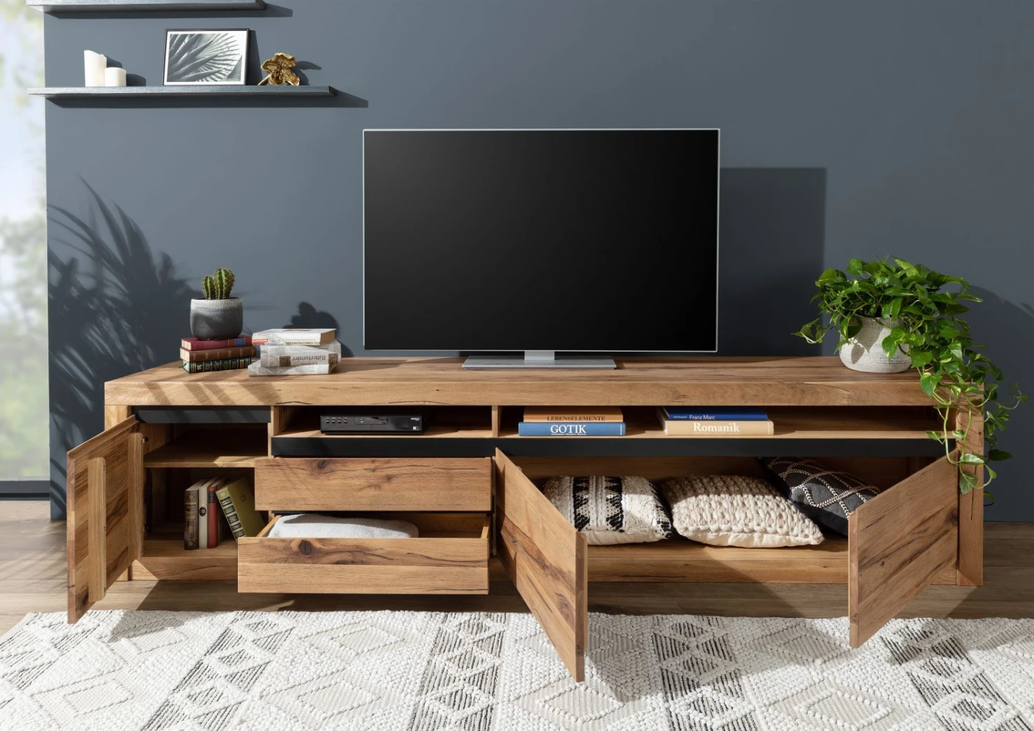 Realizzato con una lunghezza notevole, questo mobile TV offre, oltre ad un affascinante aspetto, anche numerose opportunità per accogliere un grande tv con tutti i suoi accessori. I due scaffali superiore aperti, che copre quasi tutta la lunghezza del mobile, offre spazio sufficiente per disporre consolle di gioco, modem e lettore DVD, tutto a portata di mano. I due cassetti offrono spazi per cavi, giochi elettronici ed altre cose simili. La geometria delle ante di dimesidoni diverse e grazie al fascino sublime del legno di cerro oliato rendono questo mobile utile e bello.