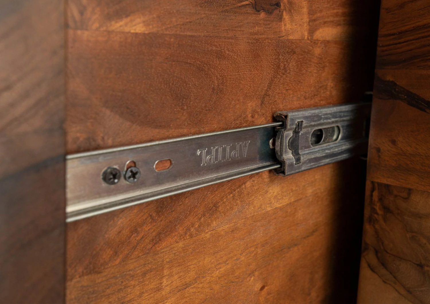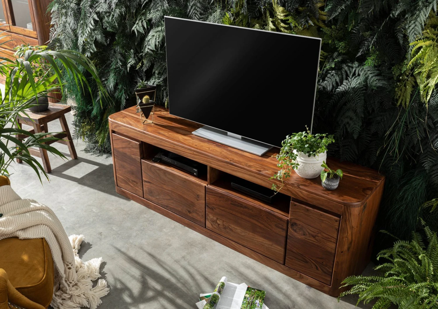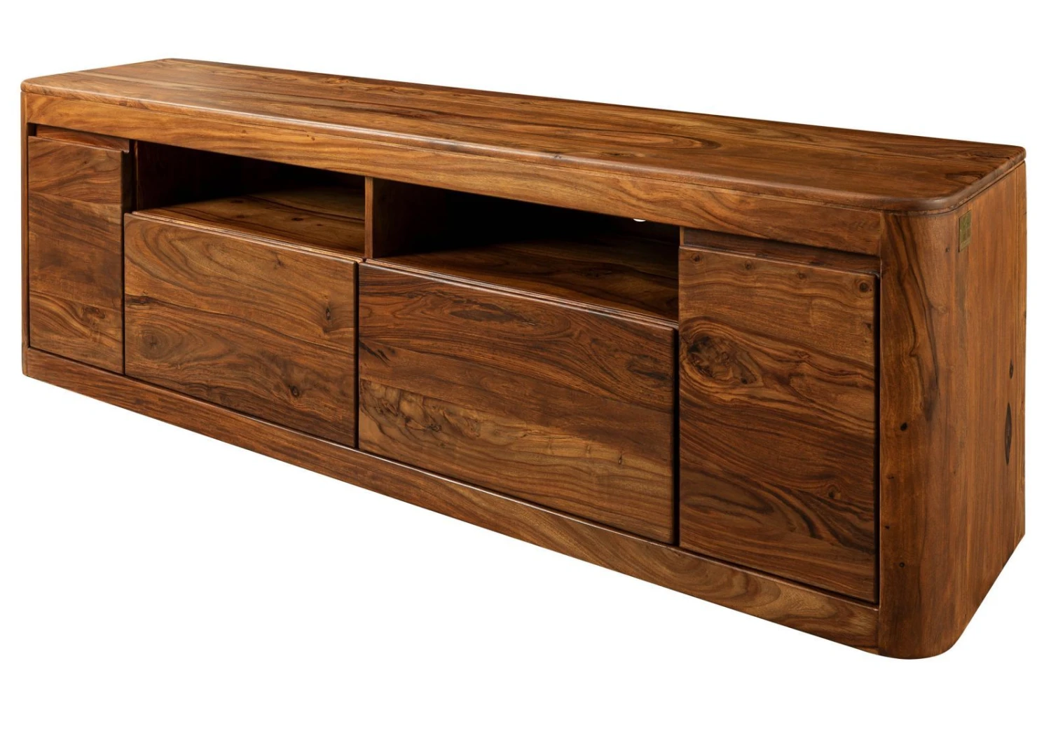 Invitare gli amici a guardare un film e accorgersi che in realtà stanno ammirando larredo su cui è poggiato lo schermo. Con i prodotti della collezione Toronto succede praticamente di continuo. Questo mobile tv in legno massello di sheesham acacia è unopera darte, anzi di artigianato pregiato. Inimitabile la particolare sfumatura di noce cerato che si perde tra giochi cromatici creati naturalmente dai raggi midollari del durame. Design moderno e cuore rustico convivono magnificamente in un componente darredo di incredibile fascino. I due sportelli laterali fanno da cornice ad altrettanti cassettoni centrali e vani aperti porta console elettroniche. Basta un divano, il mobile tv in legno massello ed è subito soggiorno.