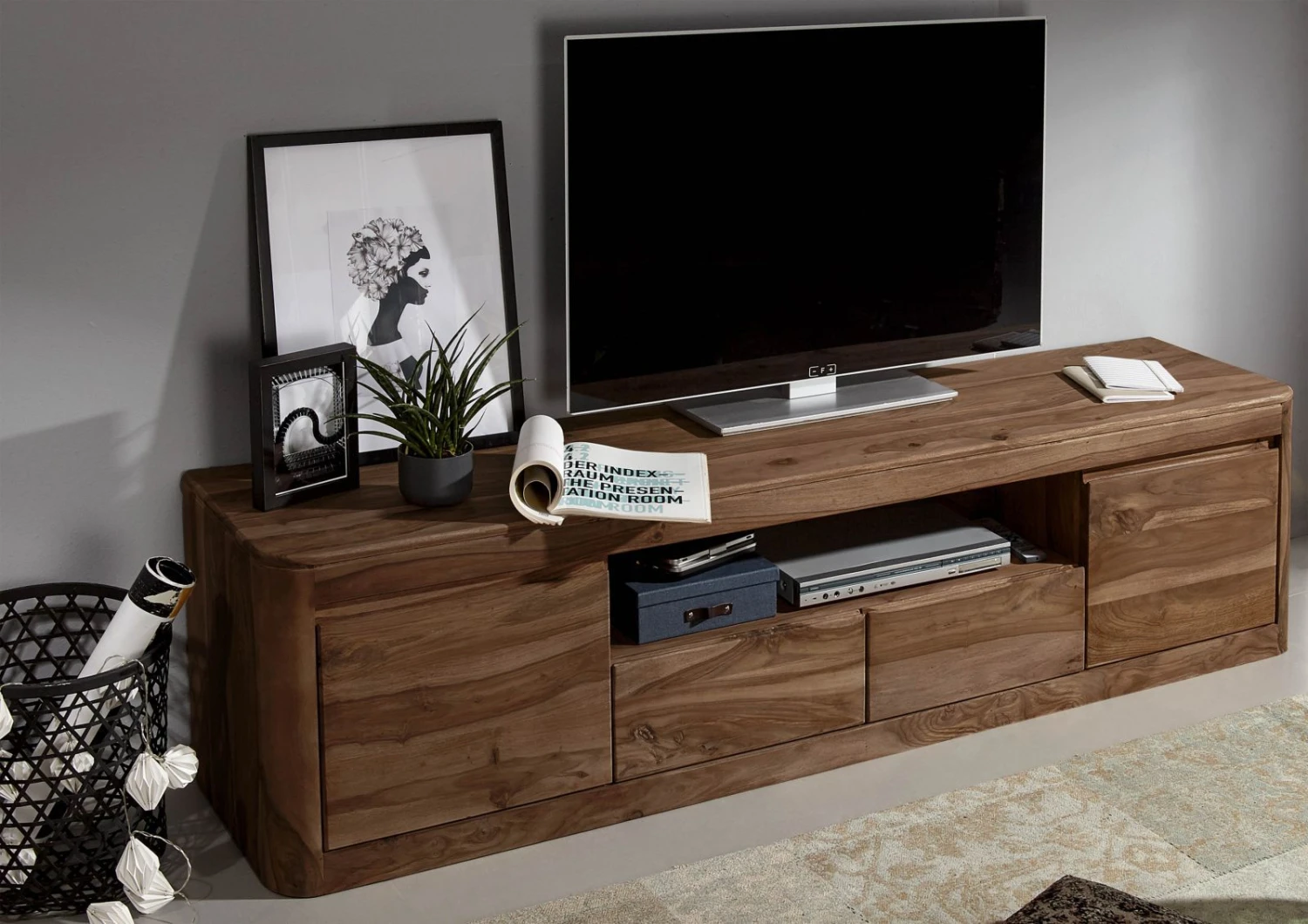 Può lo stile moderno possedere anche il tipico fascino che solo il trascorrere del tempo sa donare? Guardando questo mobile tv in legno massello di sheesham acacia by Toronto, sembra proprio di si. Il materiale naturale è stato declinato nella sua forma più efficace e bella. Impareggiabile il mix di tonalità brune e marrone su unintensa ciliegia affumicato. In quanto a spazio cè poi solo limbarazzo della scelta. Grande vano aperto centrale, due cassetti e altrettanti sportelli laterali consentono di riporre ogni cosa al proprio posto e di tenerla a portata di mano. Cè anche il pratico oblò passacavi per evitare grovigli disordinati di fili. Non è azzardato dire che questo mobile tv in legno massello è un vero colpo di genio.