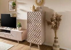 Comò in legno massello di acacia, design tipo armadio, stile retrò, superficie verniciata e colore bianco tendente a sfumature nocciola e noce. Dimensioni contenute e taglio semplice per un mobile che si sviluppa in verticale e che quasi emerge dal pavimento grazie alle quattro gambe a compasso che fungono quasi da piedistallo. La struttura accoglie una cassettiera su sei livelli con aperture a prolunga telescopica e maniglie in metallo satinato. Lintera facciata anteriore spicca per lo scenografico mosaico fatto a mano che dona un effetto 3D dei tasselli a scaglie. Lungo e sottile questo comò in legno massello è decisamente poco ingombrante e va inserito in un contesto adeguato, con complementi della stessa collezione o angoli della casa che permettano di valorizzare lo spazio negativo.