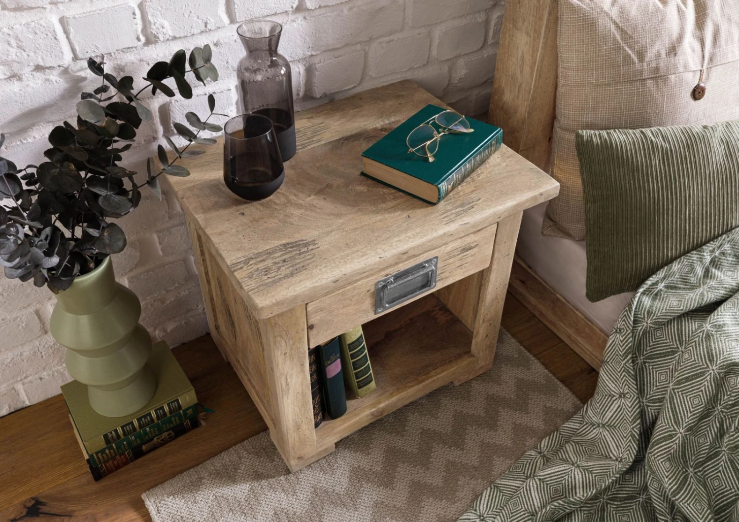 Look rustico in camera da letto: comodino in stile industriale in legno di mango
