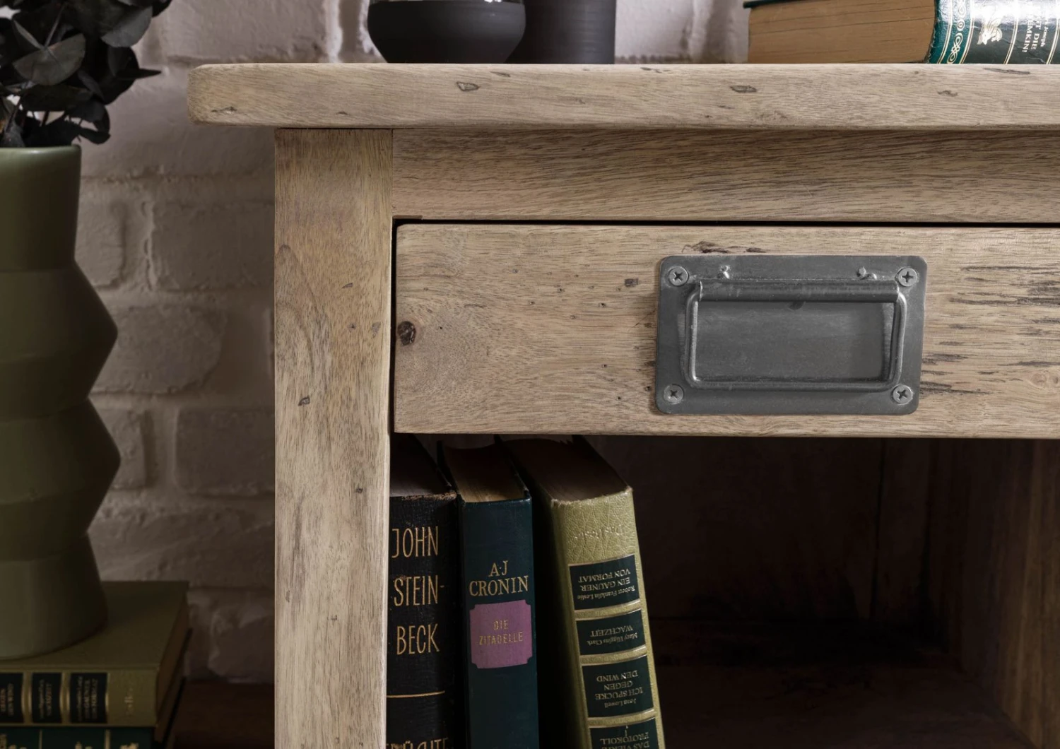 Mango massiccio con dettagli di stile: questo comodino aggiunge un discreto stile industriale a una camera da letto moderna. La maniglia in ferro grigio chiaro del cassetto completa il look e, con la sua finitura più grezza, aggiunge ulteriore fascino al mobile. Al legno di mango viene inoltre data a una finitura di alta qualità, che dona alla superficie una texture più grossolana e un aspetto usato.