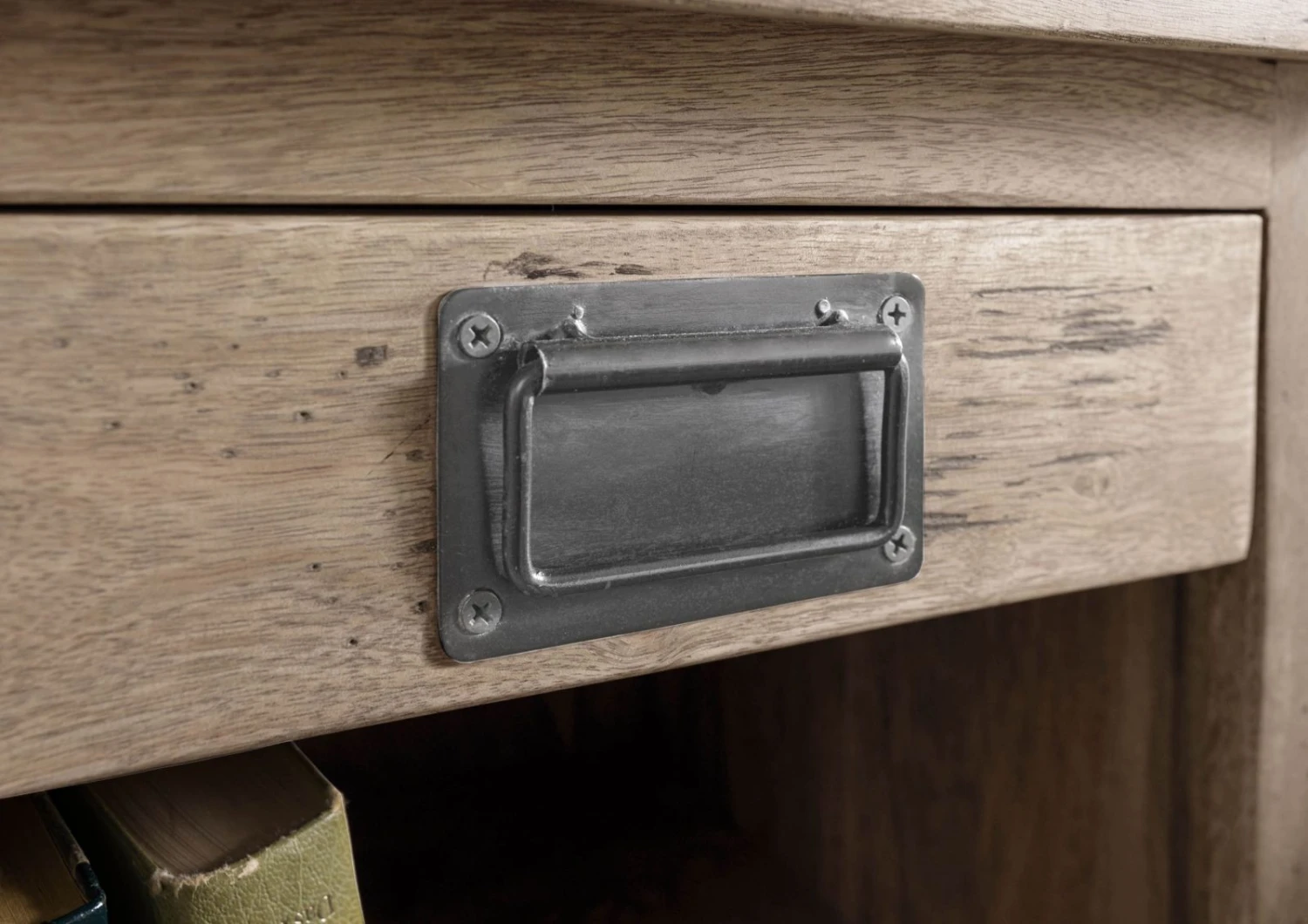 - La robusta maniglia in metallo grigio chiaro del cassetto si abbina alle suggestive venature del legno
