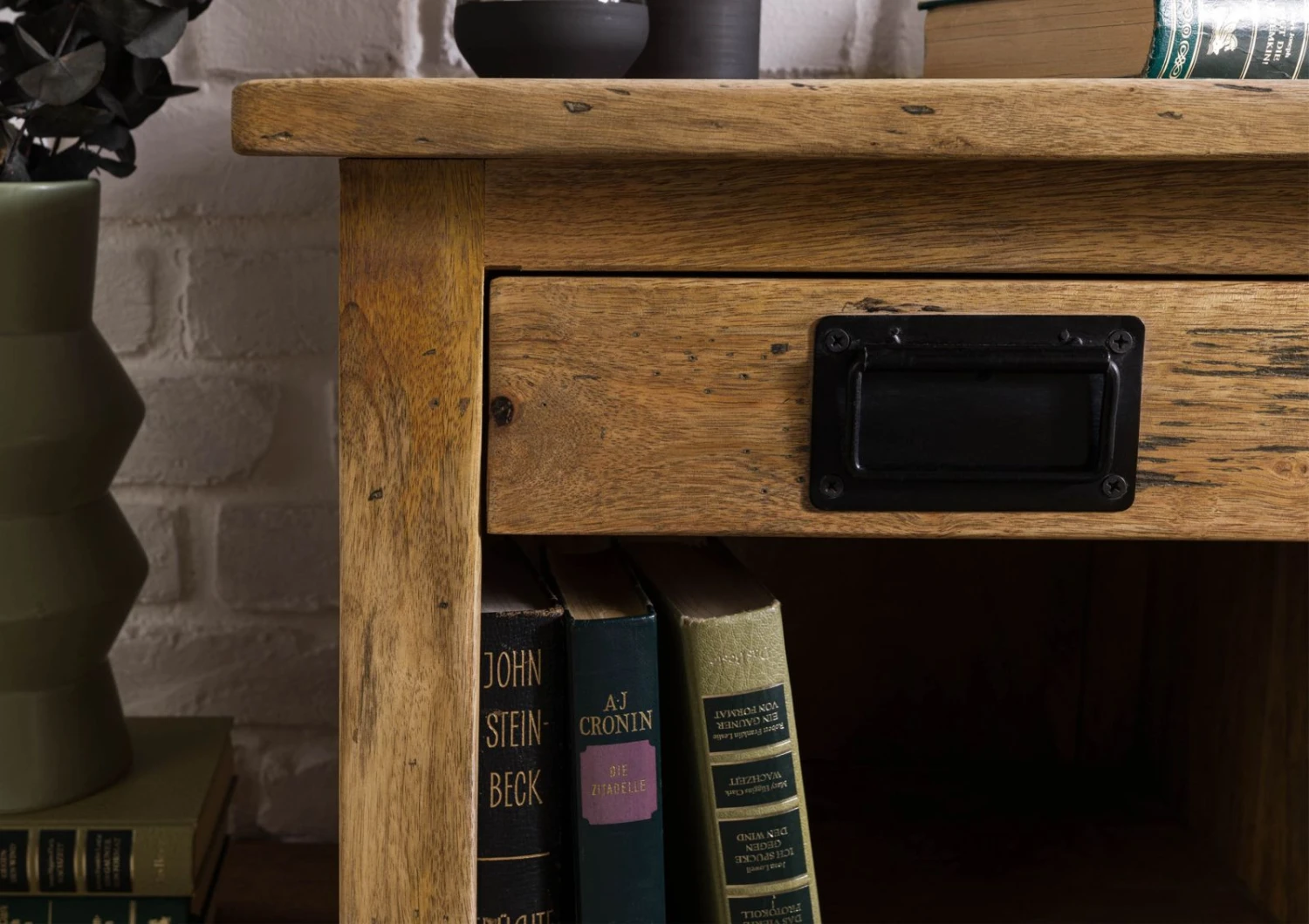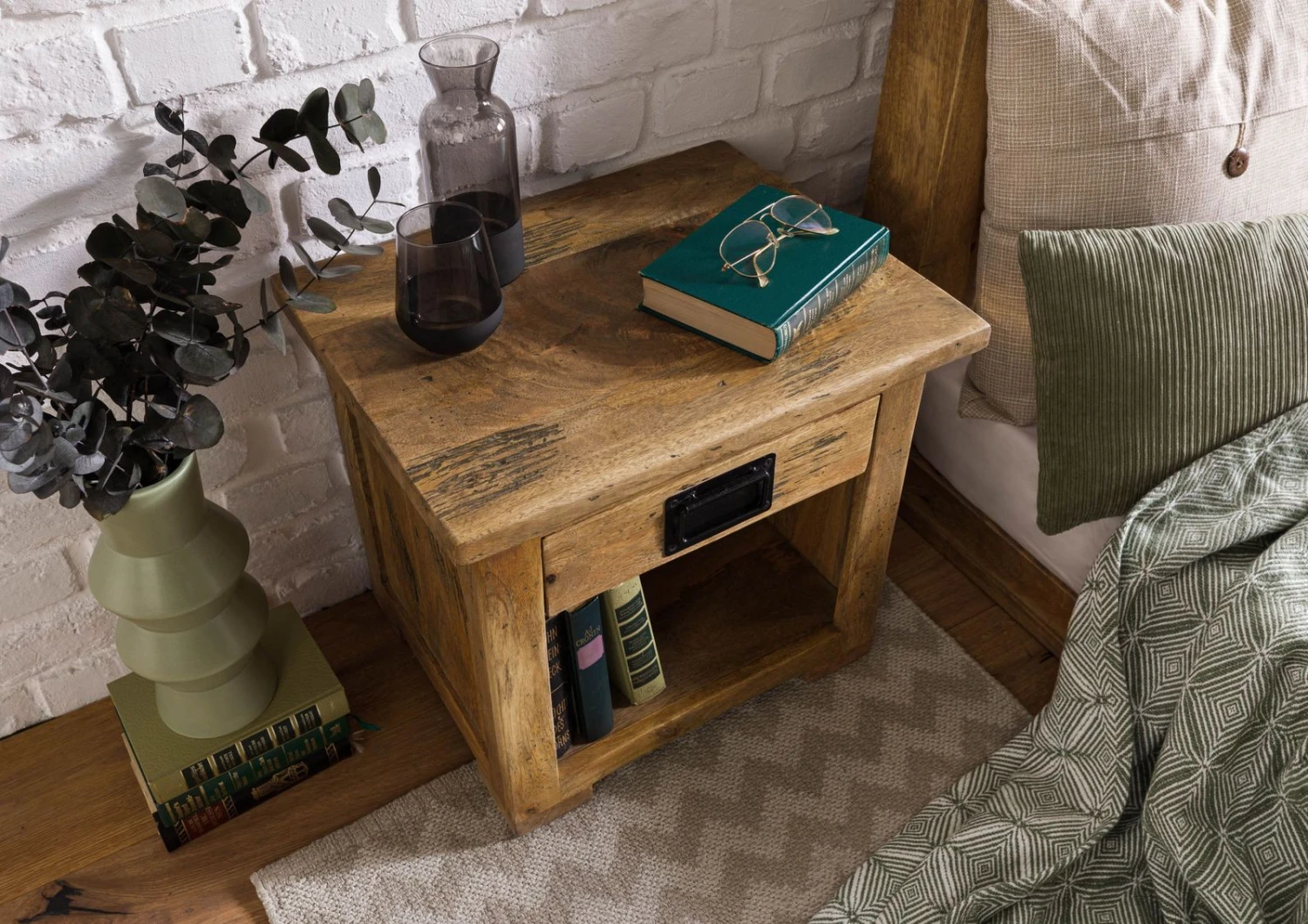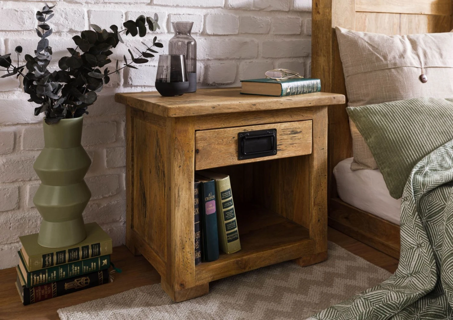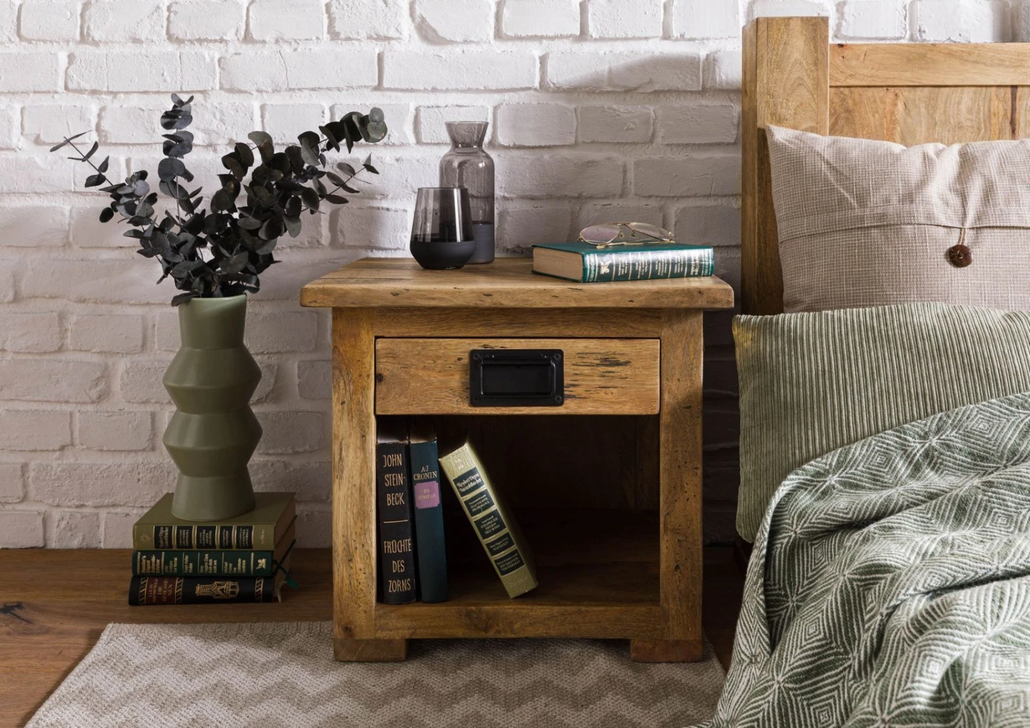Look rustico in camera da letto: comodino in stile industriale in legno di mango