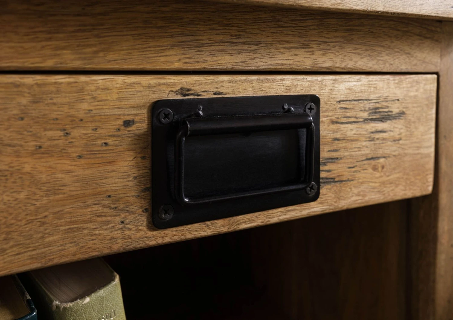 - La robusta maniglia in metallo nero del cassetto si abbina alle suggestive venature del legno