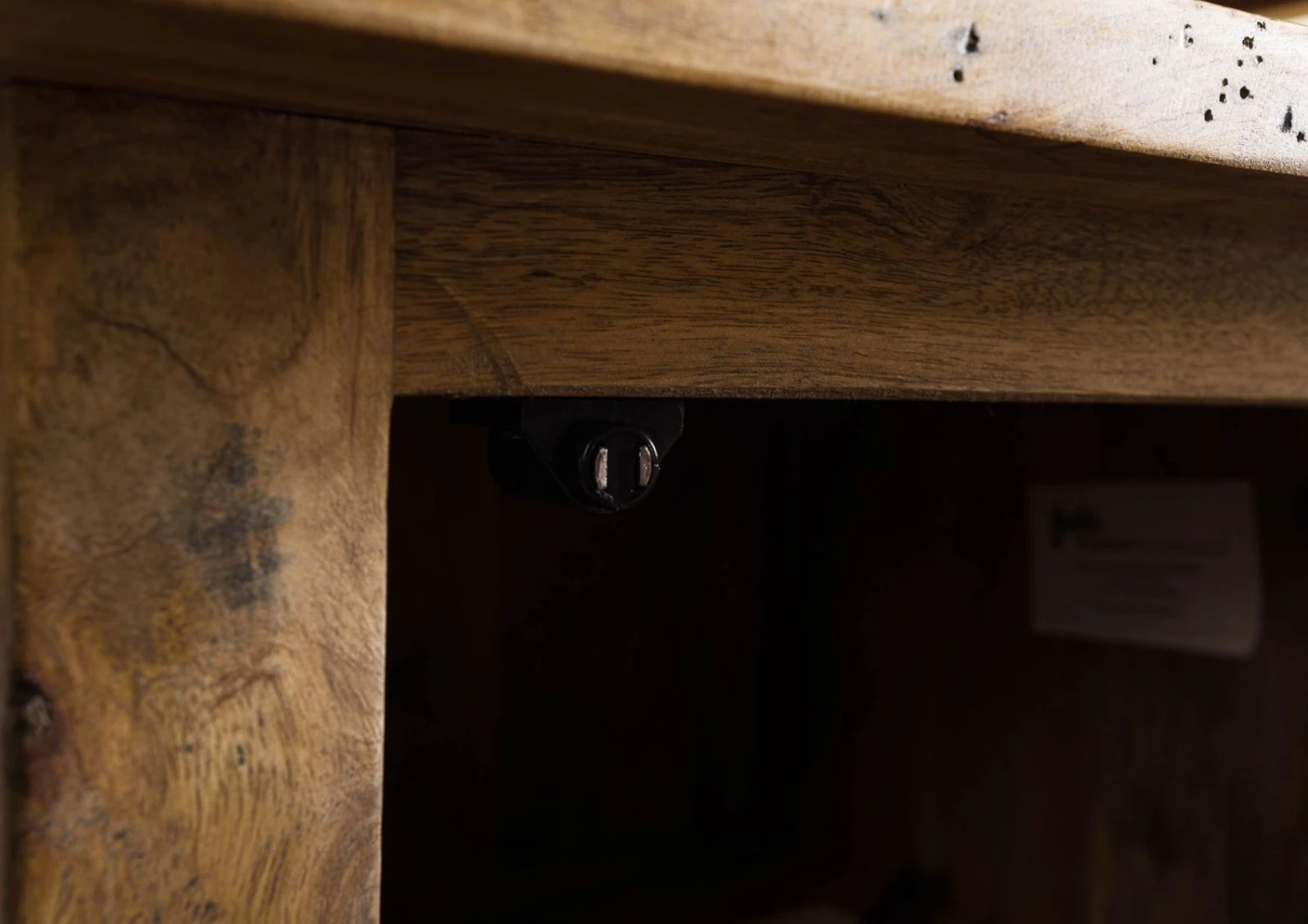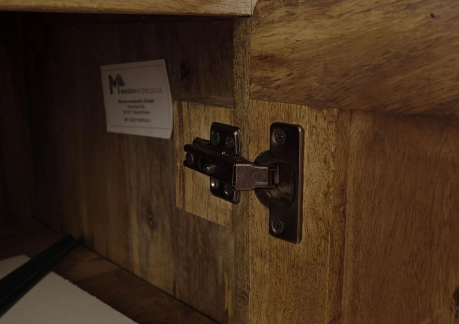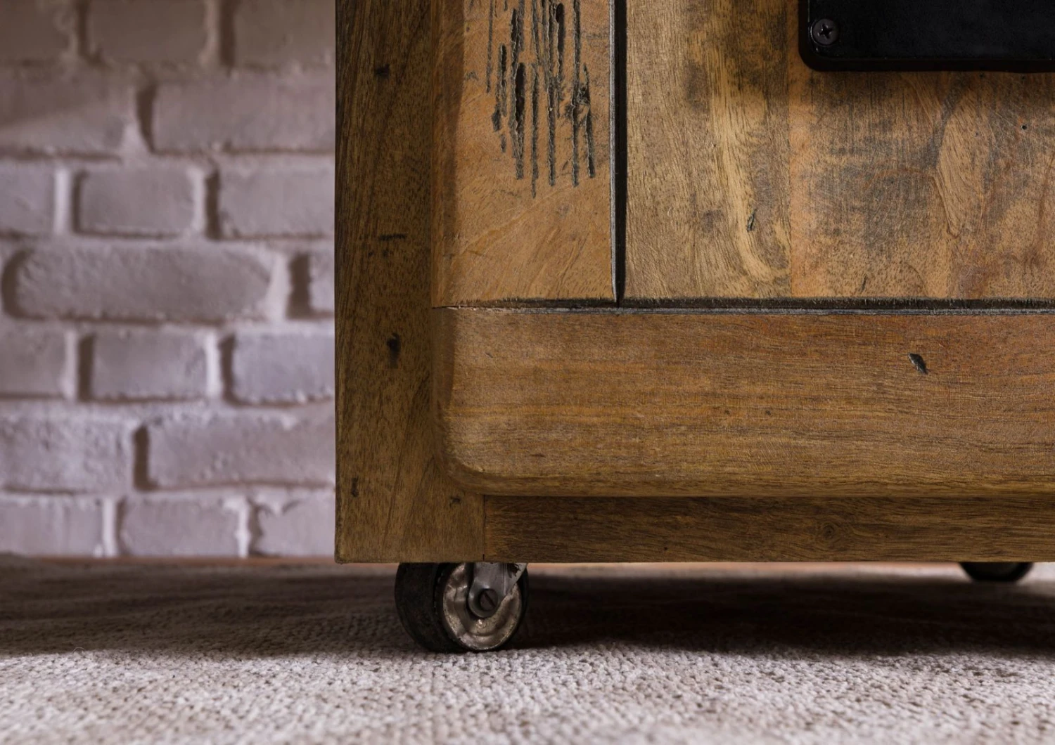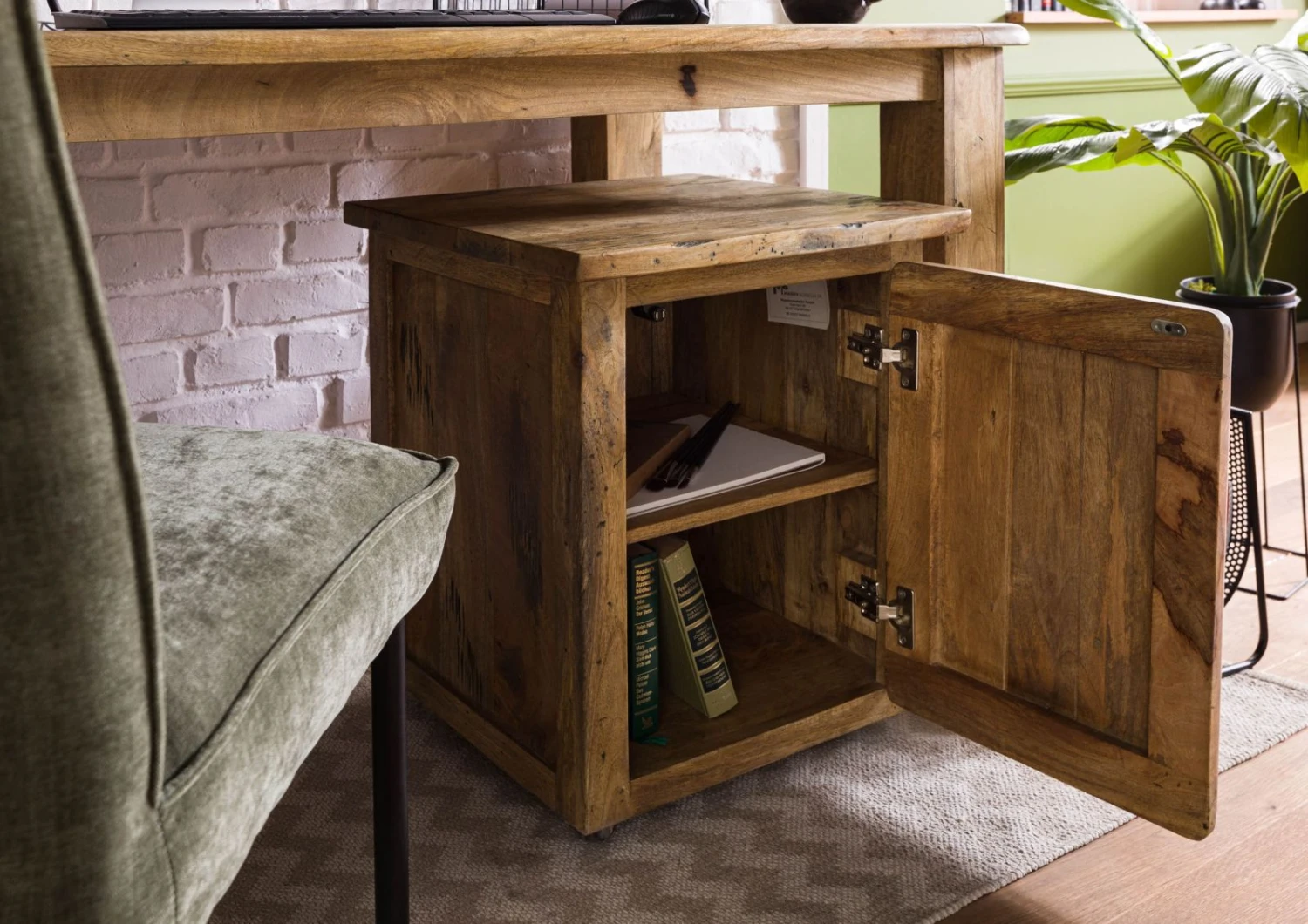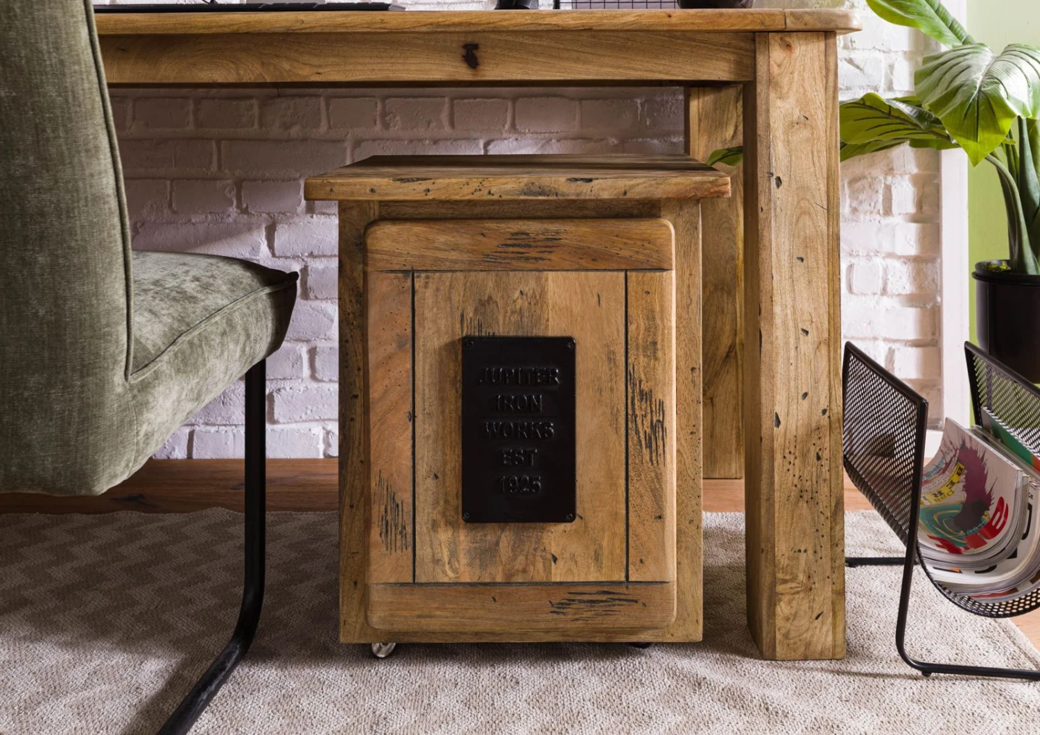 Grazie al suo design di alta qualità, questo mobile cattura sempre lo sguardo. Oltre all’elegante elemento in metallo sull’anta, la finitura delle superfici in legno mette in risalto le tipiche crepe e irregolarità del mango, valorizzando il comodino mobile con un effetto usato di tendenza. Questo piccolo mobile da ufficio è perfetto per un arredamento in stile rustico.