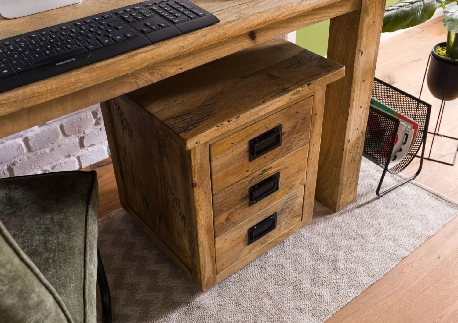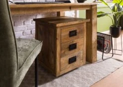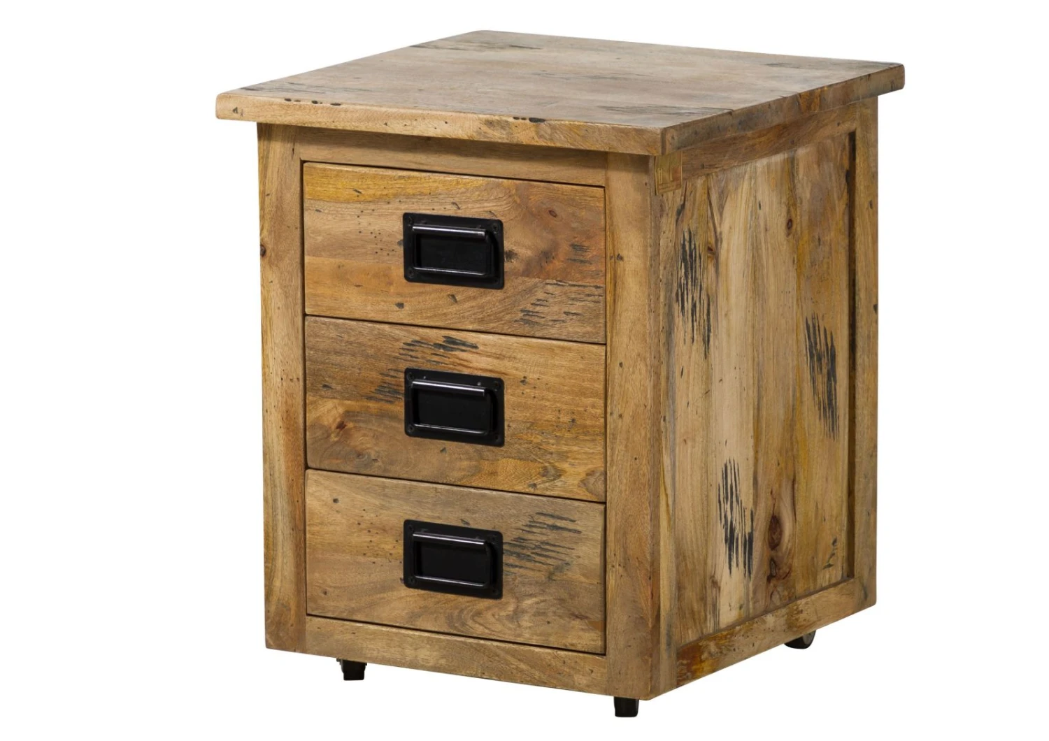 - Pratico comodino mobile con tre cassetti in legno massiccio di mango con elementi in metallo