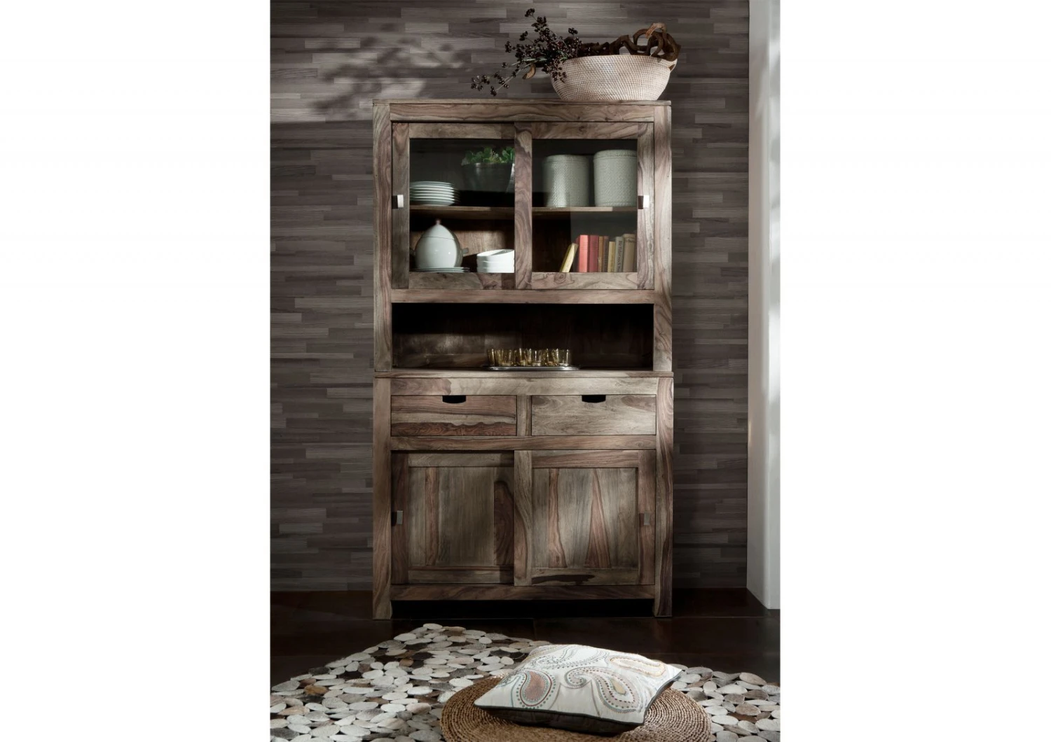 Questa credenza della serie NATURE GRAY, attirerà di certo l’attenzione con il suo design elegante e moderno. C’è un sacco di spazio per stoviglie e altri oggetti utili per la casa, dietro alle 4 ante, ai 2 cassetti e allinterno dello scaffale nel mezzo. Attraverso le ante a vetro in alto, le porcellane e le decorazioni saranno visibili e ben riposte, nella parte inferiore del mobile tutti i tipi di piccole cose che si accumulano, come tovaglie e runner, troveranno la loro giusta collocazione, al riparo dalla polvere. Grazie al suo spettacolare colore, alla durezza e alla luminosità, è da decenni e oltre, utilizzato per la produzione di mobili che quotidianamente tutti noi usiamo. Per mantenere il colore naturale del legno, le superfici sono state semplicemente oliate, così da creare una combinazione unica di colore grigio unita alle fantastiche venature.