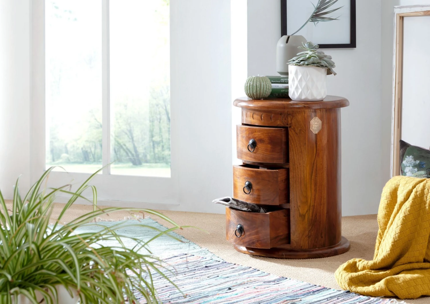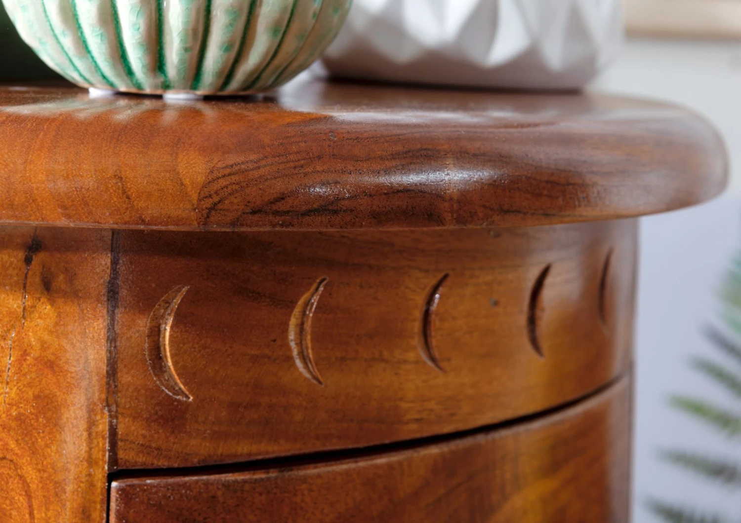 Comò rotondo in legno massello di acacia color miele laccato con effetto molto naturale. Il tratto esotico del design testimonia le contaminazioni culturali tipiche dello stile coloniale. La base a circolare a zoccolo chiuso è identica nello spessore e nella larghezza al ripiano superiore. Poco al di sotto, sulla facciata anteriore, è presente una bordatura con intagli a mezzaluna. Il corpo del mobile dispone di tre cassettoni con maniglie ad anello in metallo anticato. La peculiare forma, il colore vivo con effetto grezzo, e la straordinaria personalità di questo comò rotondo in legno massello, catturano lo sguardo ed impongono una collocazione adeguata allinterno della casa. La camera da letto è senza dubbio il suo habitat ideale.
