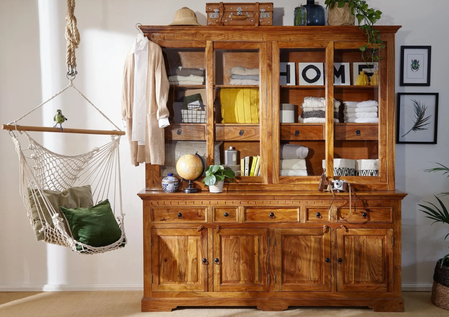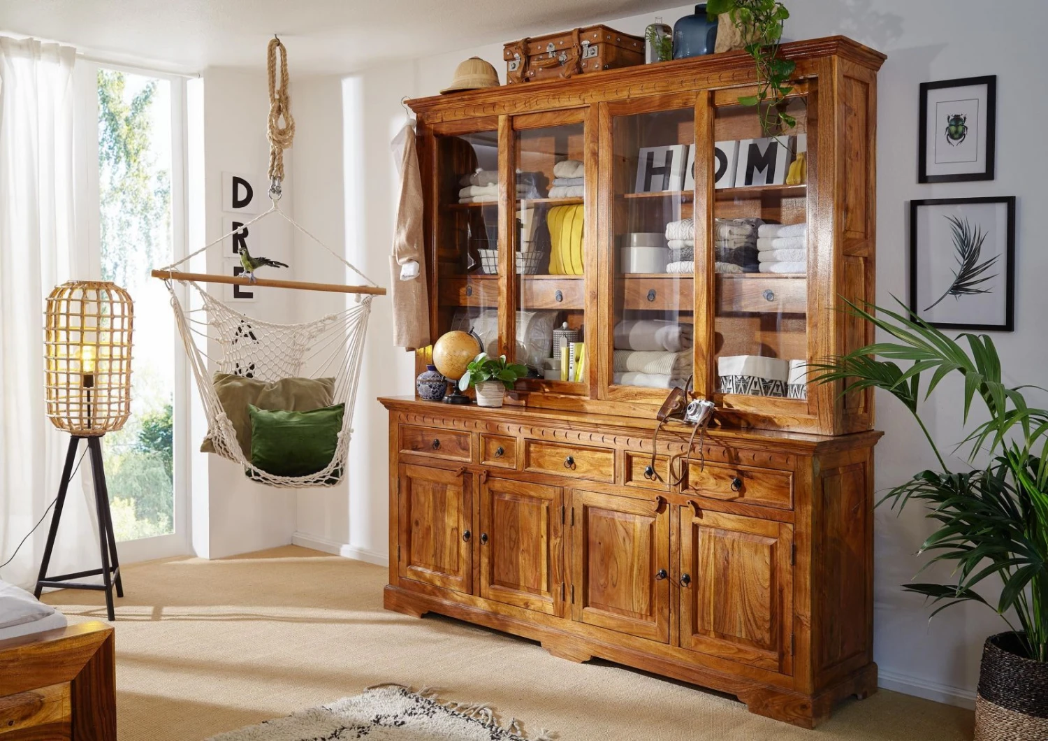 Credenza in legno massello di acacia color miele in stile coloniale. La laccatura accentua la luminosità del materiale, la vividezza dei dettagli e il pregio della lavorazione artigianale. Il mobile è una combinazione di due pezzi con la sezione inferiore composta da comò con base a zoccolo aperto, mentre la sezione superiore è una vetrinetta con ante a vista. Il componente inferiore della credenza in legno massello è provvisto di due coppie di sportelli che danno accesso a un vano con ripiano intramezzo. Poco sopra sono collocati cinque cassetti, tre grandi intervallati da due piccoli. Le maniglie sono tutte in ferro battuto con anello. Il bordo superiore del comò è ornato con intagli a mezzaluna, allo stesso modo della vetrinetta. Questultima consta di quattro ante in vetro e legno, due ripiani e quattro cassetti sospesi con maniglie in ferro battuto ad anello.