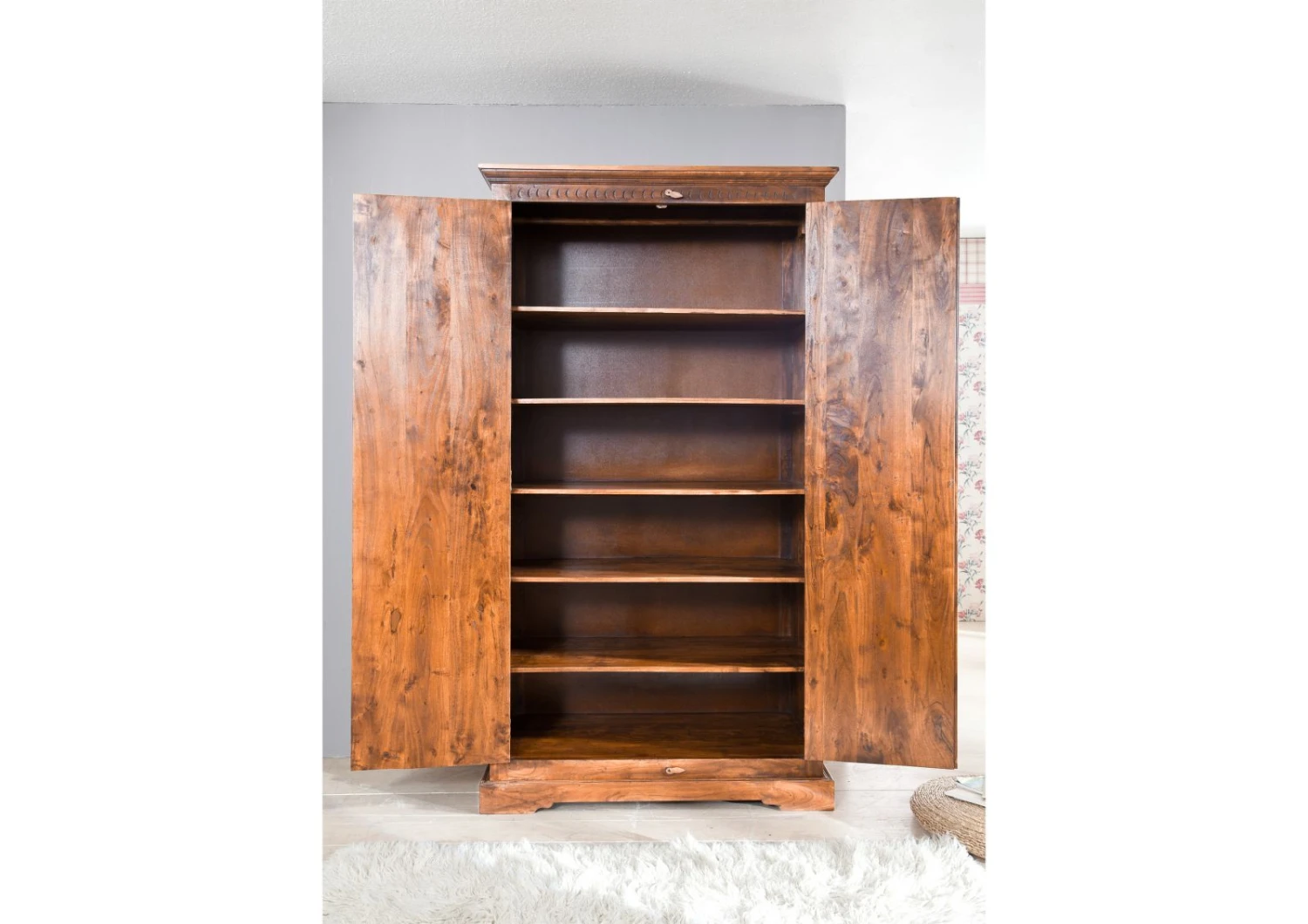 Questo armadio della collezione OXFORD si presenta in modo particolarmente imponente. Caratterizzato dalla naturale espressione del legno di acacia che emana purezza e freschezza e creato con un design maestoso in stile coloniale, questo mobile trasmette una sensazione di eternità assoluta che garantisce la sua bellezza per molti anni. La tonalità accogliente del legno nobile di acacia presenta delle venature senza uguali. Le sfumature di colore dei rami, insieme alle venature cresciute naturalmente, creano un’immagine complessiva che affascina gli occhi di chi guarda. Si tratta di una caratteristica emersa già alle origini dello stile coloniale nel continente africano e in India. Già nel 19° secolo, questo legno di acacia di alta qualità veniva utilizzato per rendere imponenti i mobili. Se un tempo era nelle residenze dei signori d’Africa e d’India che si potevano trovare esposti questi mobili preziosi come simbolo di ricchezza e di potere, oggi chiunque può arredare la propria casa con questi pezzi raffinatissimi. Oltre a tutte le caratteristiche raffinate e allo stile imponente, l’armadio OXFORD offre un mobile molto ampio, con uno spazio di archiviazione estremamente generoso grazie alla presenza di cinque ripiani interni. Grazie al design creativo delle porte armadio, questo bellissimo mobile si adatta perfettamente in qualsiasi stanza. Ad esempio, in camera da letto: per avere più spazio per i vostri vestiti, o in soggiorno, per riporre i tanti oggetti di uso quotidiano in un unico posto, dove poterli avere tutti sott’occhio. Con questo armadio, mantenere l’ordine non è più un problema! Questo mobile può essere utile anche in un corridoio. Potrete sistemare scarpe, cappelli, sciarpe e borse. Suddiviso molto accuratamente in varie sezioni, anche in questo caso sarà facile mantenere tutto sotto controllo e avere i vostri oggetti sempre a portata di mano. Oltre a questi dettagli pratici, un ambiente calmo e accogliente si manifesterà immediatamente non appena varcata la soglia di casa. Proprio quello che ci vuole per stare in pace e staccare la spina dopo una lunga giornata di lavoro. La spedizione di questo armadio, unico nel suo genere, avrà luogo subito dopo l’elaborazione del vostro ordine. Riceverete in consegna l’armadio OXFORD già montato!