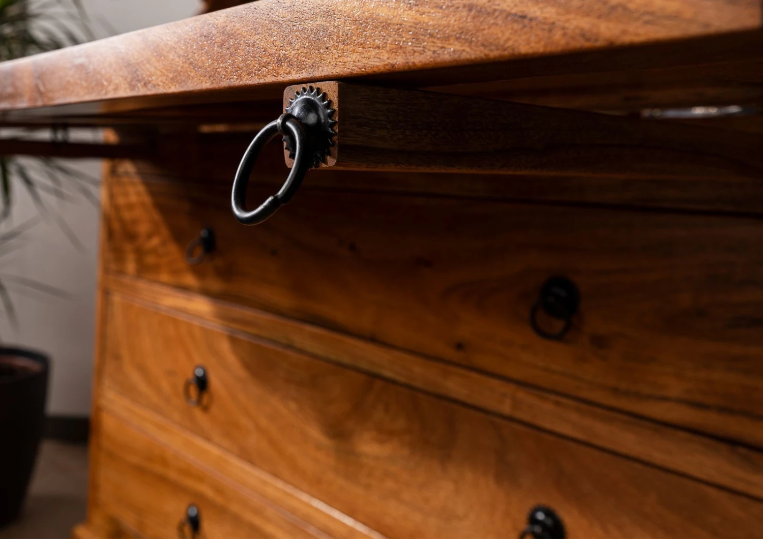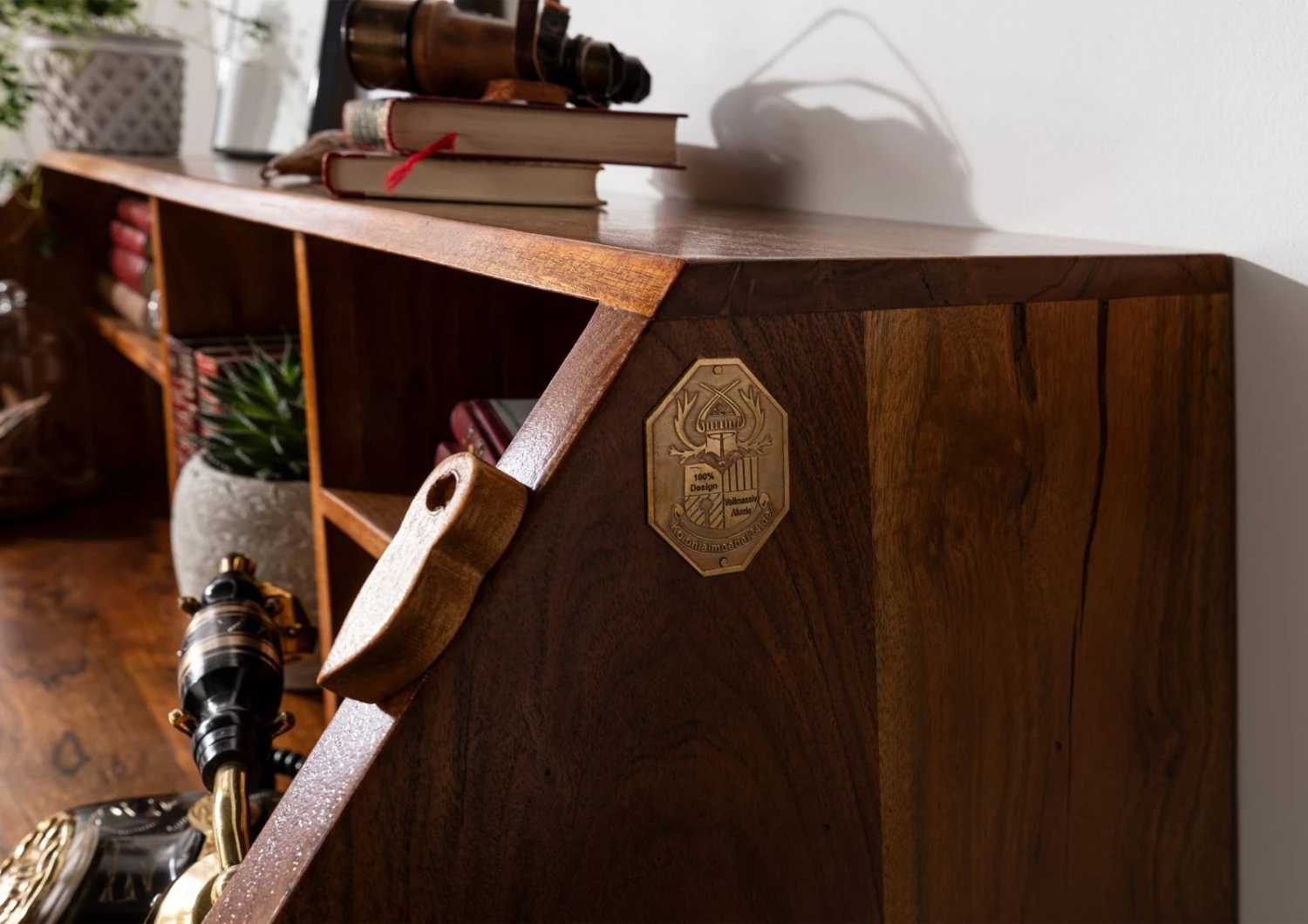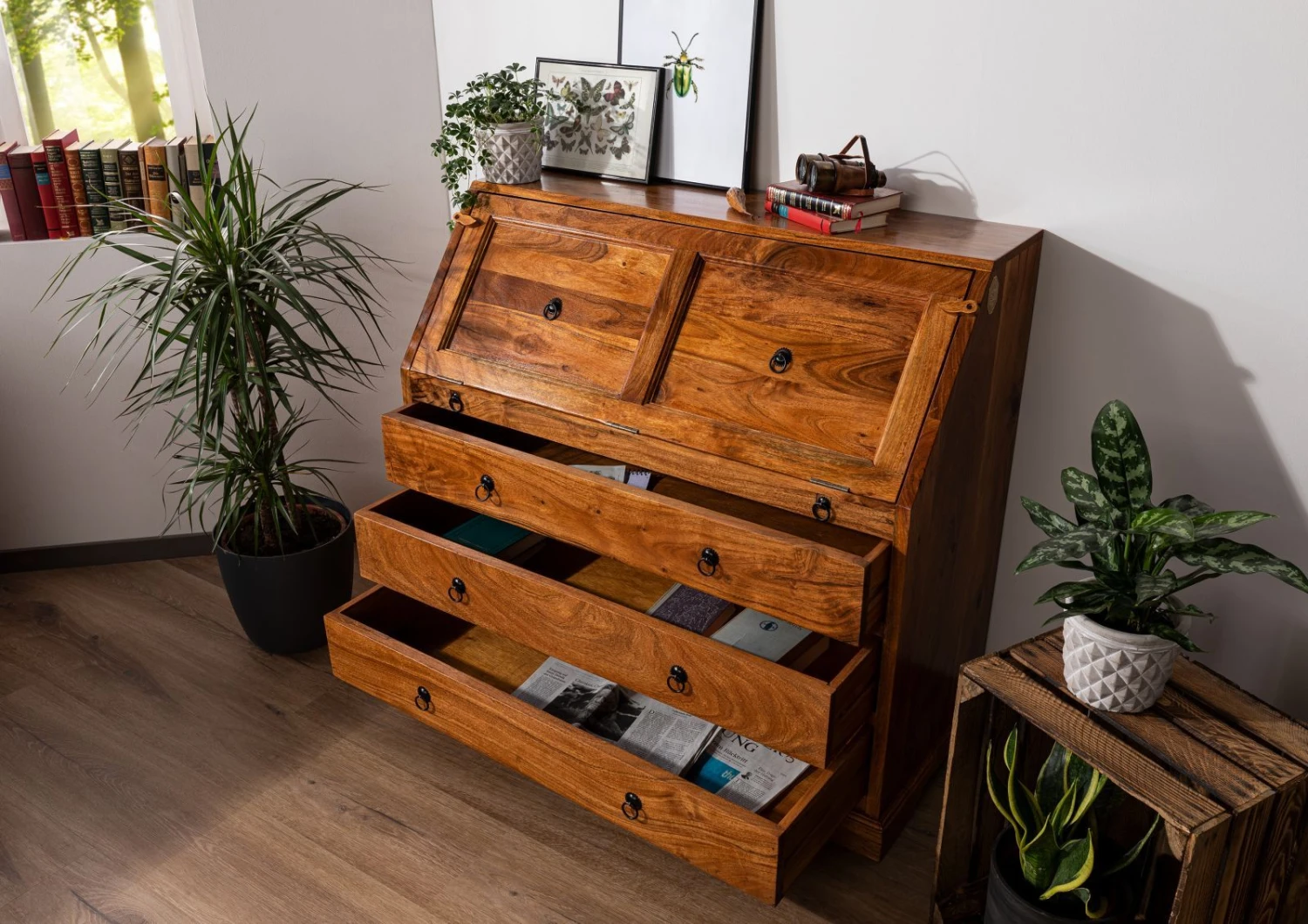 Questo fantastico scrittoio, è stato realizzato in legno di acacia, già utilizzato anche nel periodo di origine di questo stile. Qui, il colore naturale dell’acacia è stato intensificato da una gradevole tonalità in color miele, creando un’immagine di armonia e intimità. Grazie alla solida produzione, questo pratico elemento d’arredo offre un arredo duraturo e robusto, che convince per laspetto indimenticabile. Con tre cassetti, in cui è possibile riporre tutti gli accessori che possono essere trovati su una scrivania, offre una grande quantità di spazio. Il piano del tavolo può essere ripiegato facilmente, semplicemente abbassandolo e offre anche spazio per computer o documenti.