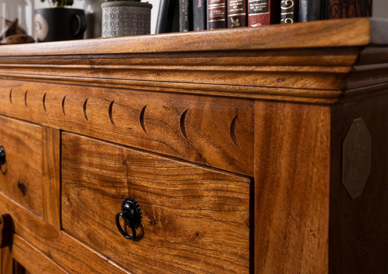 L’aspetto imponente di questo comò soddisfa il requisito di base dello stile coloniale. Interamente realizzato in legno massiccio, questo mobile costituisce un pezzo d’arredo di alto valore qualitativo che affascina grazie alla precisione della sua lavorazione. Gli ornamenti che compongono i bordi sotto al ripiano, la base dalla forma ondulata e una delicata modanatura intagliata definiscono una buona presentazione di un mobile in stile coloniale. Modanature metalliche dal sapore nostalgico sulle ante dell’armadio e anelli di metallo impiegati come maniglie si inseriscono bene in questa incantevole elaborazione e perfezionano il caratteristico effetto di pienezza. Il fascino caldo ed esotico viene restituito attraverso le impressionanti venature del legno che catturano lo sguardo dello spettatore. Optando per il nobile legno di acacia, la scelta si è diretta verso un materiale grezzo che veniva impiegato nella fabbricazione di questo modello già nel periodo di apparizione dell’arredamento in stile coloniale. Nato nel 19° secolo nel continente africano e in India, questo nobile mobilio era presente prevalentemente nelle case padronali, simbolo di ricchezza e potere. Tutte le caratteristiche distintive sono state mantenute invariate fino ai giorni d’oggi, motivo per cui la serie di mobili di OXFORD ripristina l’originalità di questo periodo in una forma impressionante. Questo comò dispone di tre cassetti e di uno spazio interno chiuso, facendo sì che ogni area della casa, dal corridoio alla zona notte, possa essere valorizzata efficacemente. Oltre al piacevole fatto di offrire spazio, questo mobile trasmette benessere anche arricchendo ogni ambiente con un’atmosfera confortevole. Il colore caldo di questo comò è stato conferito da una verniciatura in color miele, che dona un’atmosfera piacevole e, allo stesso tempo, garantisce una protezione ottimale delle superfici.
