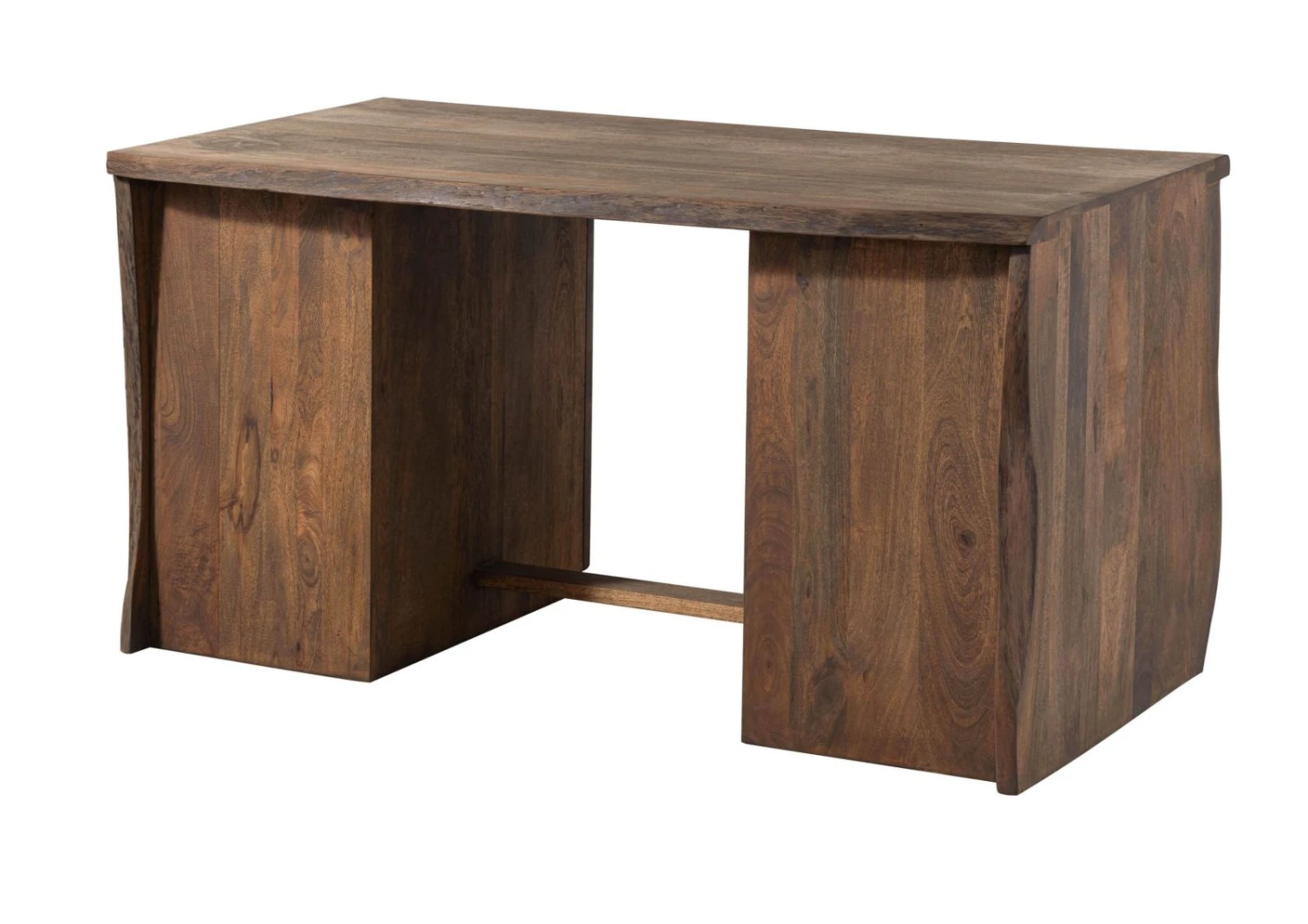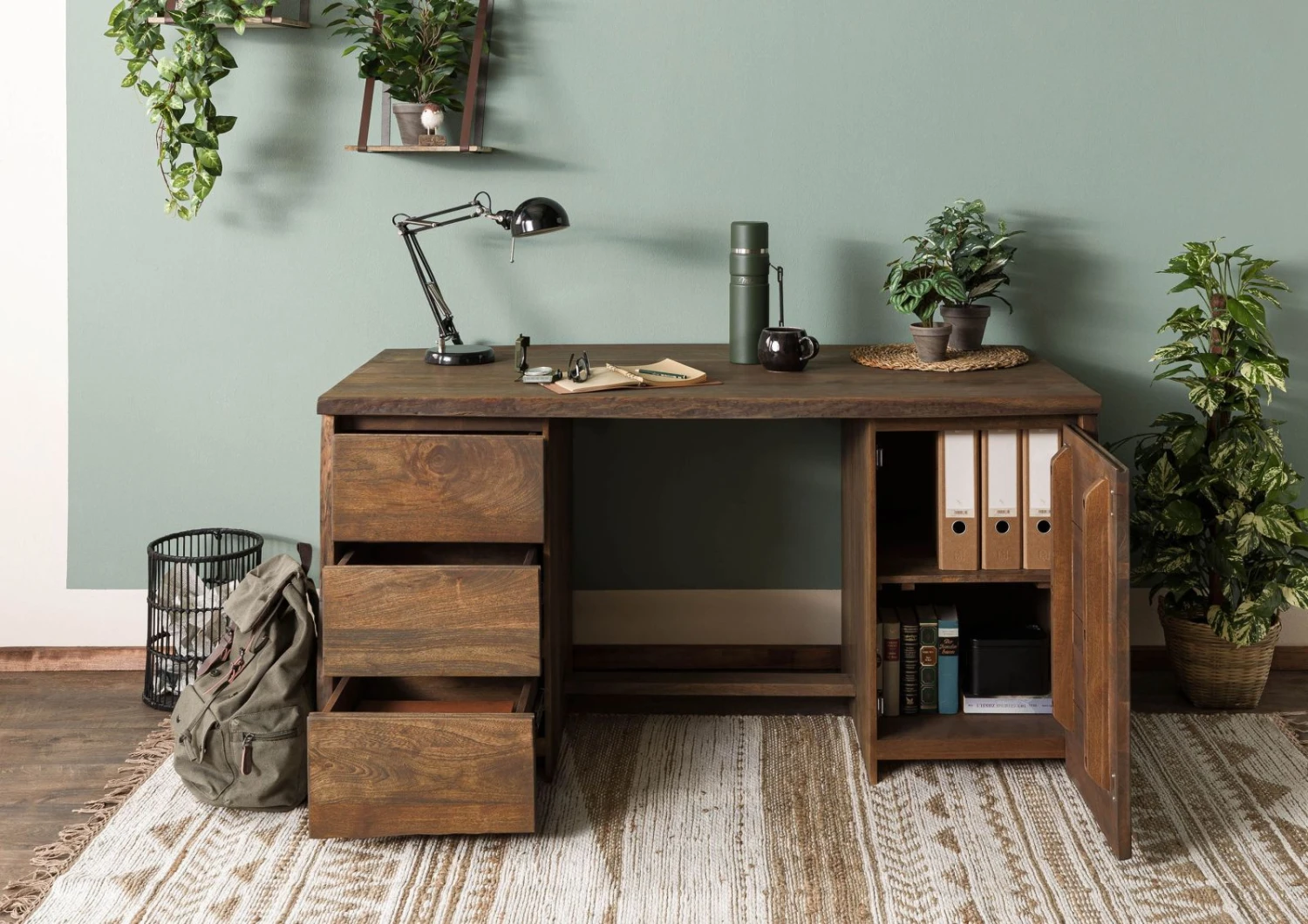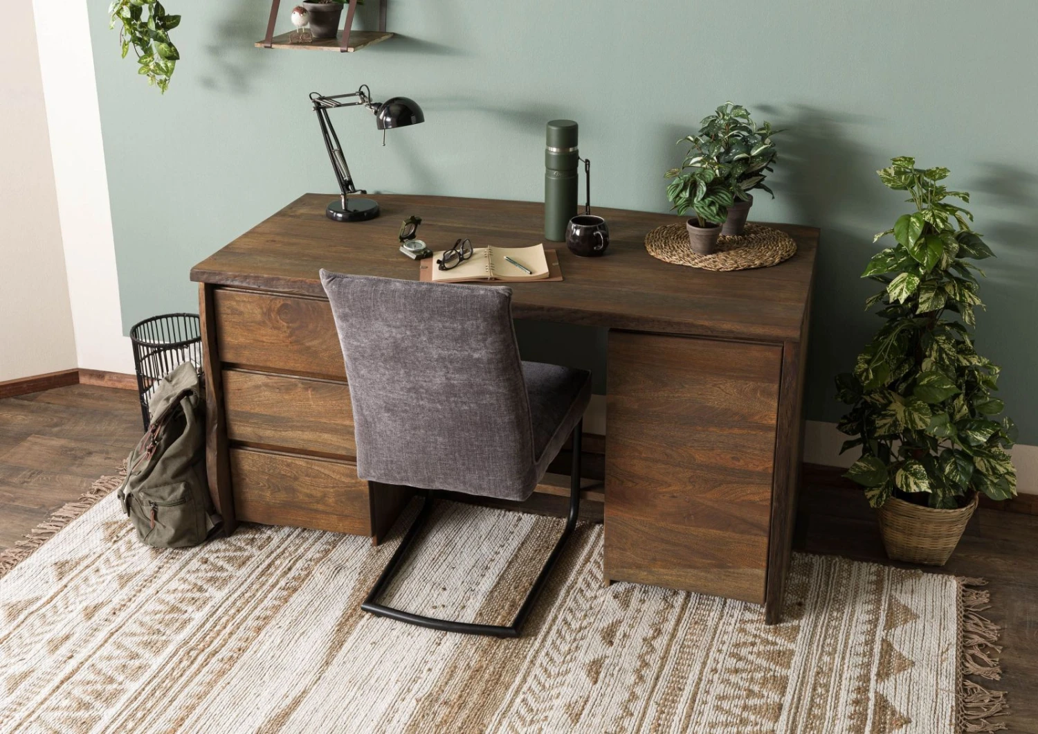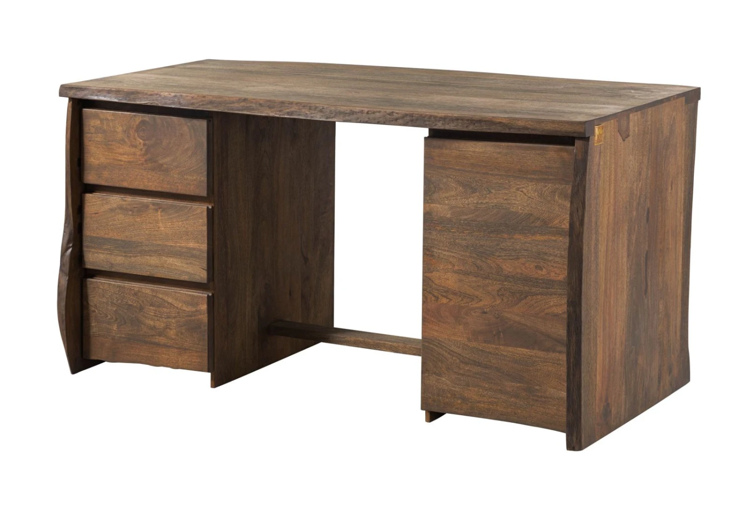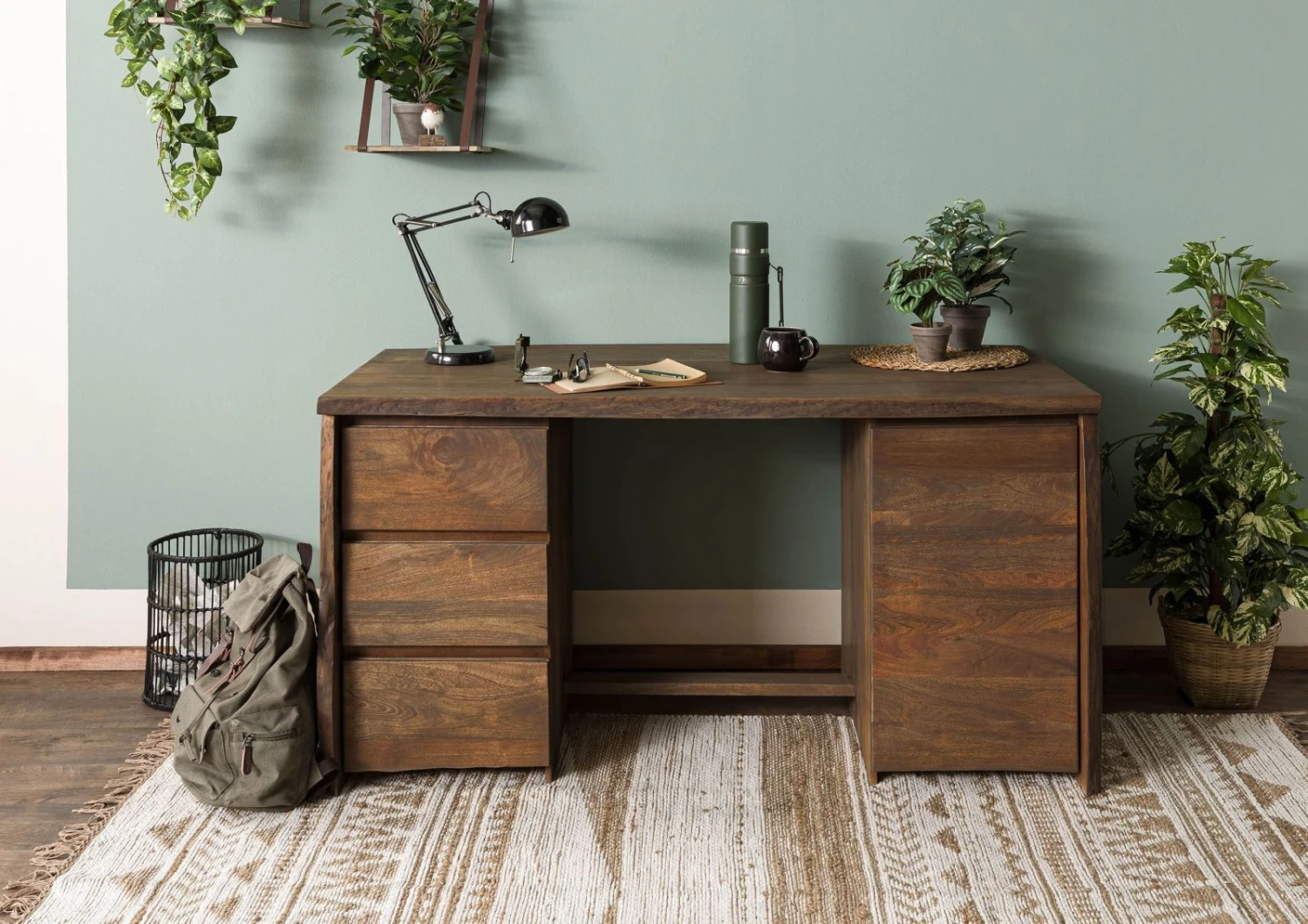 Scrivania in legno di mango con bordi a tronco d’albero: carattere deciso e spazio insieme