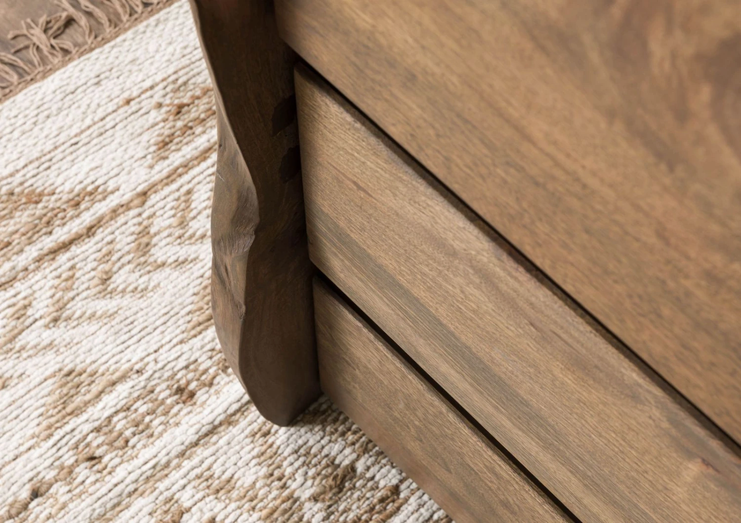 Sia il piano sia i laterali presentano bordi a tronco d’albero che mettono in risalto le suggestive forme del legno di mango. Il profilo segue le linee organiche della crescita della pianta. I nodi e le irregolarità visibili vengono mantenuti, conferendo a ogni mobile un carattere unico.