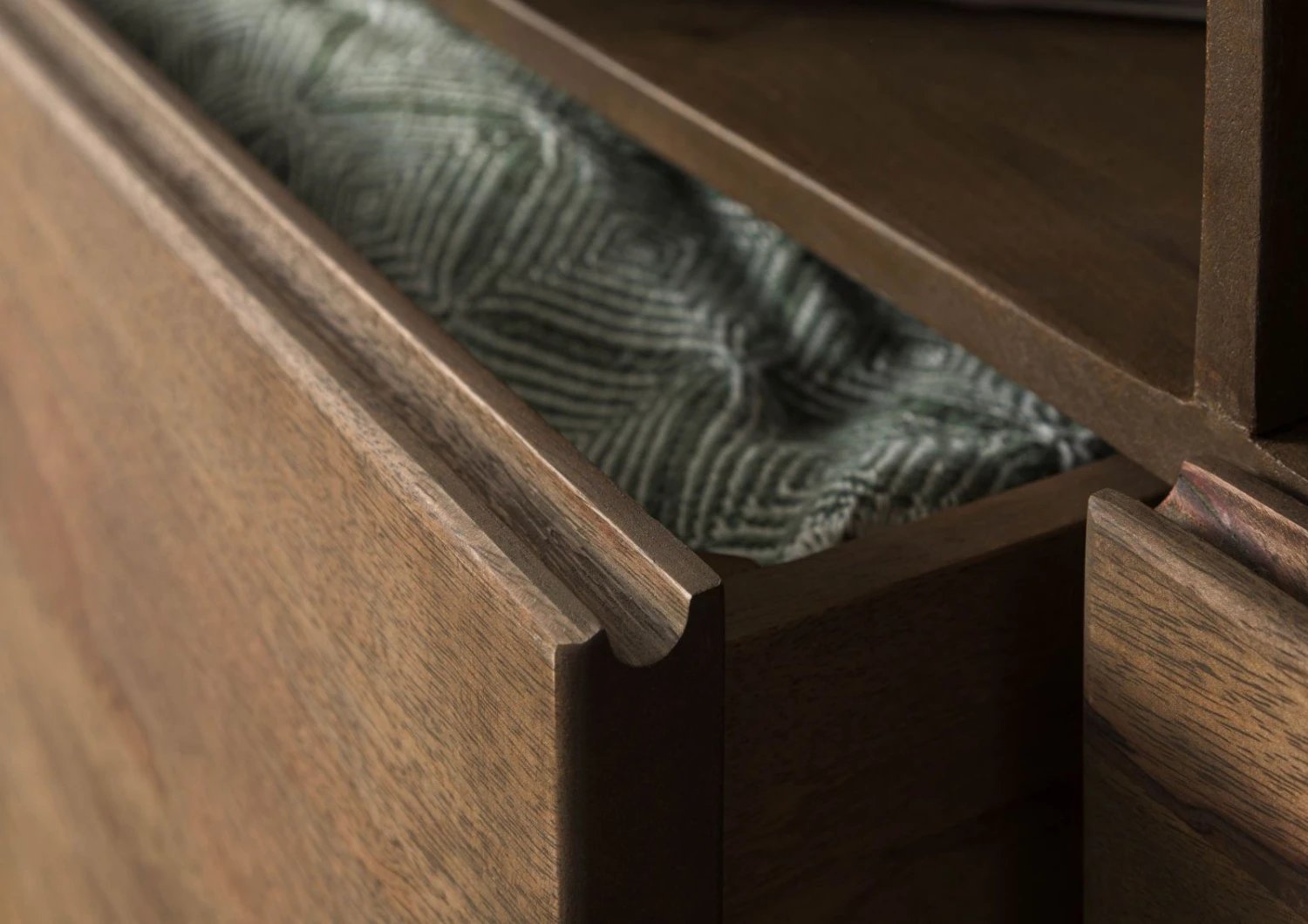 Questo mobile TV dona a qualsiasi soggiorno un’aria genuina e autentica. Il legno massello di mango oliato, le cui vivaci venature attraversano l’intera superficie, è una scelta determinante in tal senso. I frontali senza maniglie, sostituite da discrete gole incassate, esaltano la bellezza naturale del mobile. Due cassetti e altrettante ante offrono spazio per riporre utensili e altro, mentre due vani a giorno con foro passacavi ospitano console di gioco, soundbar, ecc.
