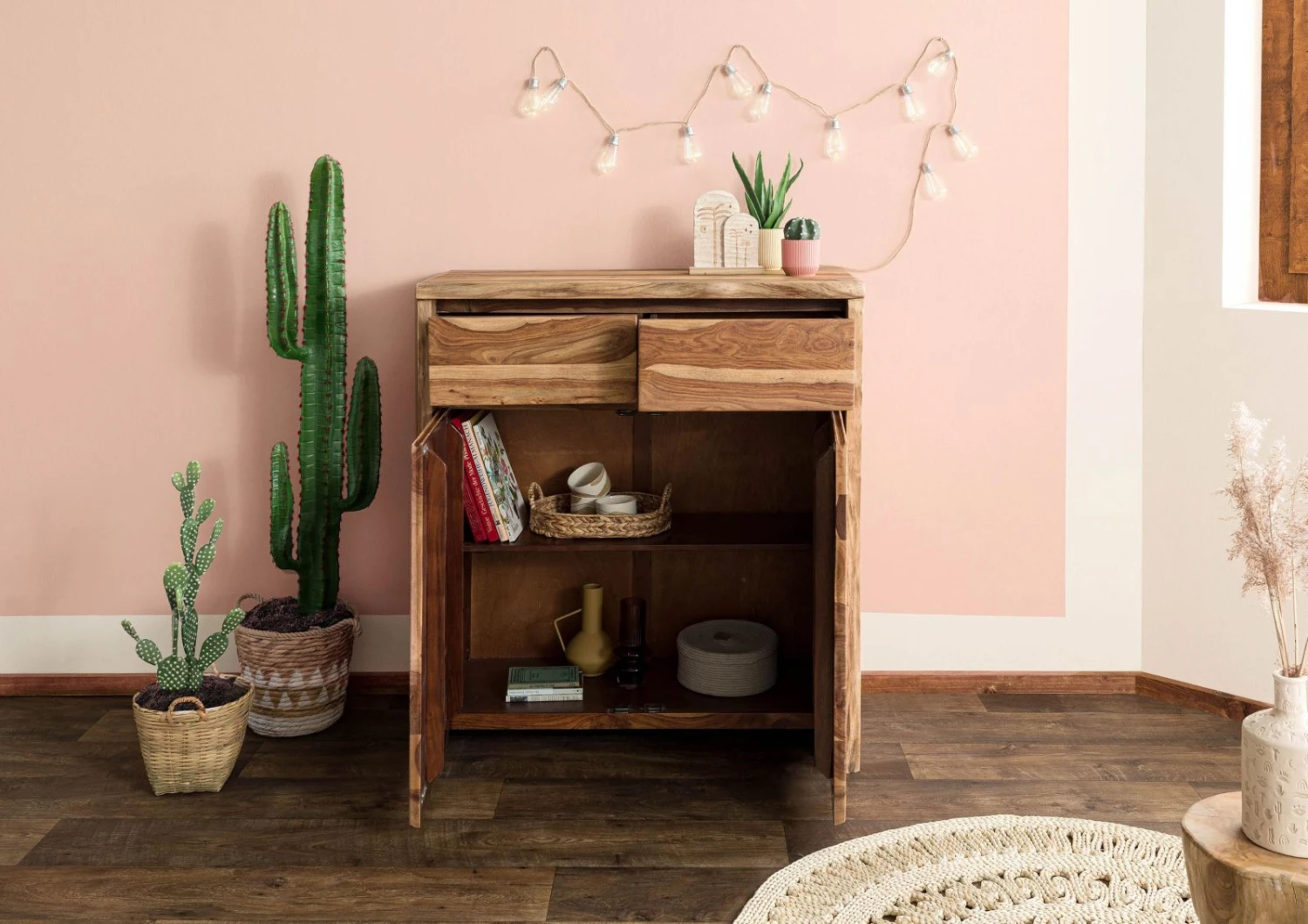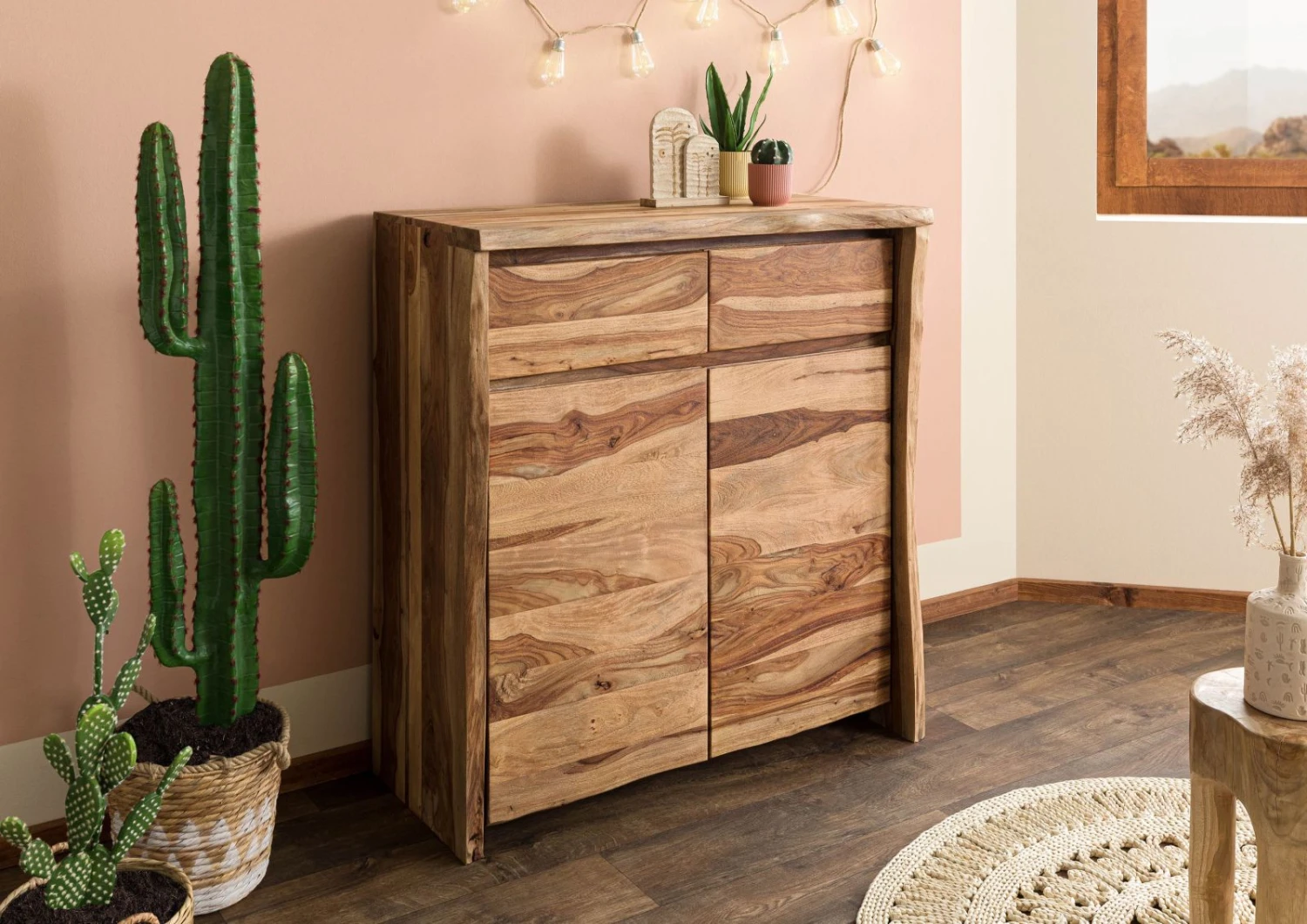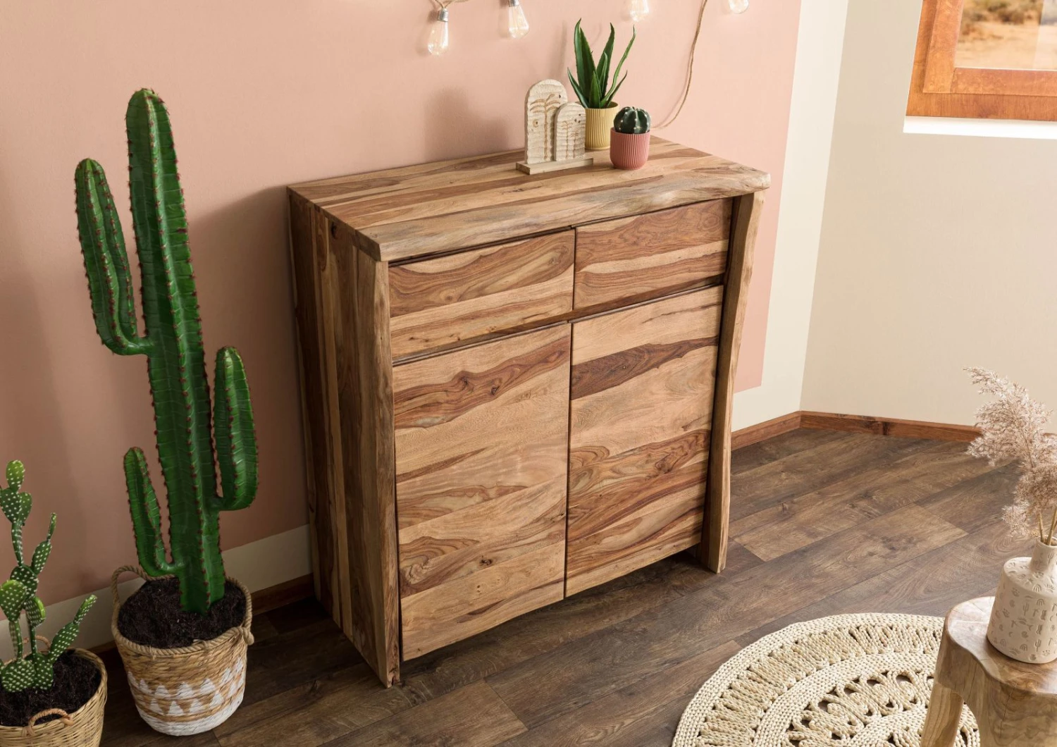 Realizzata in legno di sheesham, questa credenza mostra la trama organica della materia prima nella sua forma più bella. Le suggestive venature del legno di sheesham, noto anche come palissandro indiano, catturano lo sguardo. La ricercata composizione colpisce per l’incantevole armonia cromatica. I pannelli laterali con bordo a tronco d’albero rappresentano un importante valore aggiunto, poiché preservano la conformazione naturale del legno e valorizzano il carattere originale della superficie.