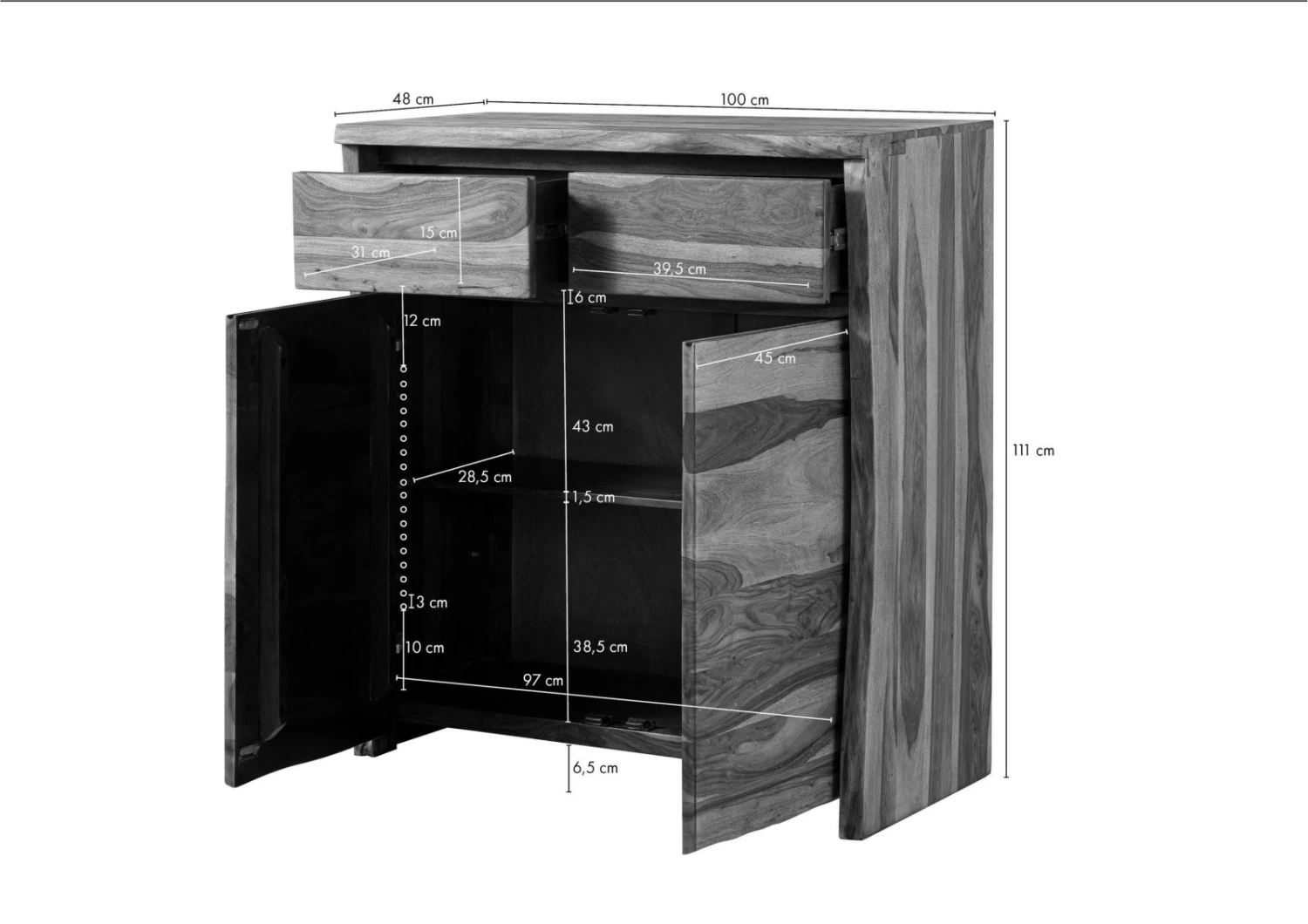 La pregevole credenza in legno massello di sheesham si distingue inoltre per il design pulito: cassetti e ante si aprono tramite maniglie a gola incassata. La bellezza naturale del legno è al centro della scena. Le superfici presentano una raffinata finitura sabbiata. Questo speciale processo asporta le particelle più morbide del legno, conferendo a ogni mobile una consistenza irripetibile. Il risultato è un esemplare unico.