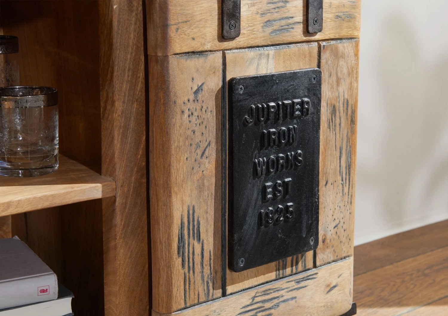 Mobile credenza in legno massello di mango di dimensioni contenute e compatte, ideale per essere posizionato in soggiorno, in cucina o nellingresso. Nella sezione superiore è provvisto di un vano aperto e di una coppia di cassetti con maniglie in ferro anticato. In basso sono presenti quattro scomparti di archiviazione su due lati. Luno o laltro può essere coperto o tenuto in mostra grazie allo sportello scorrevole su binari metallici. Questo elemento funzionale e ornamentale è tipico della collezione Railway. Altro particolare distintivo del mobile credenza in legno massello è il suo caldo colore originale, mescolato a nuance che vanno dal grigio al marrone. Linconfondibile stile industriale è stato abilmente coniugato con un design minimale e rustico.