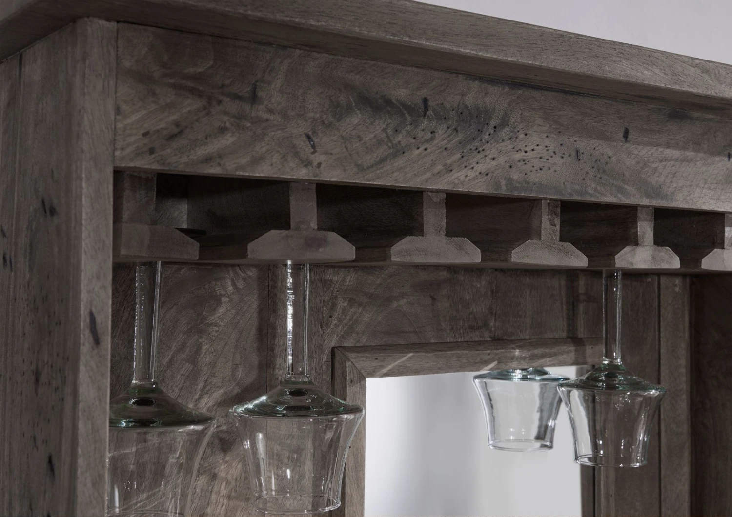 Mobile bar in legno massello di mango, aspetto rustico ad effetto usurato, superficie verniciata in grigio che sottolinea le autentiche imperfezioni del materiale sovrapponendosi al colore naturale del legno. Larredo consta in due sezioni fuse e sovrapposte. La parte superiore è uno scaffale incavato con ripiano basso che incornicia una specchiera centrale. Poco sotto la modanatura sporgente sono state ricavati dei supporti a intaglio per accogliere bicchieri a calice. La parte inferiore del Il mobile bar in legno massello ha un piano di lavoro, due cassetti gemelli con maniglie in ferro anticato e vani aperti separati da una mensola centrale. Gli scomparti sono coperti da un pannello scorrevole su binari in metallo, marchio distintivo della linea Railway.