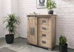 Comò credenza in legno massello di mango dallestetica eclettica, in stile industriale e con superficie sottoposta a verniciatura solo parzialmente coprente. Allo stupendo colore bianco della velatura si aggiungono le note dinamiche delle sfumature e delle imperfezioni del materiale naturale. Nellinsieme il risultato è un rustico e gradevole effetto vissuto che sfida le mode e il tempo. Dal punto di vista tecnico il mobile presenta una fila di quattro cassetti sulla destra, dotati di maniglie in ferro verniciato in grigio chiaro. Sulla sinistra è stato ricavato uno spazio per vani aperti. Il lungo pannello scorrevole tramite binari metallici funge da sportello e da inserto ornamentale. Spostandolo cambia la prospettiva e il look dellarredo. La credenza in legno massello ha un concept davvero versatile. Va bene sia in salotto che come comò in camera da letto.