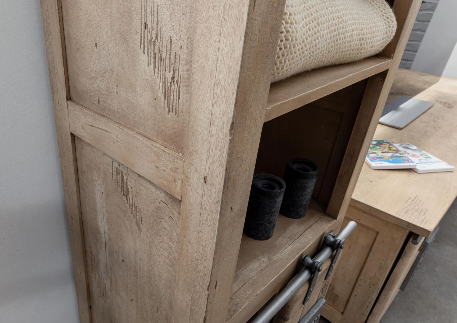 Mobile libreria in legno massello di mango, colore bianco velato che lascia intravedere il materiale naturale nelle sfumature del nocciola, marrone e miele. La superficie sottoposta a laccatura esalta le autentiche discromie e imperfezioni del materiale. Lelemento può essere diviso in due sezioni, con tre vani aperti nella parte superiore, ricavati grazie a due mensole. In basso è presente il dettaglio distintivo di questo mobile libreria in legno massello. Si tratta di altri due scomparti contenitori delimitati da un ripiano centrale, con inserti in ferro battuto verniciato in grigio pastello chiaro. Attraverso le barre metalliche scorre un pannello decorativo arricchito da una borchia incisa. Il concept e i dettagli contribuiscono a fondere lo industrial con quello coloniale, ottenendo un magnifico risultato estetico.